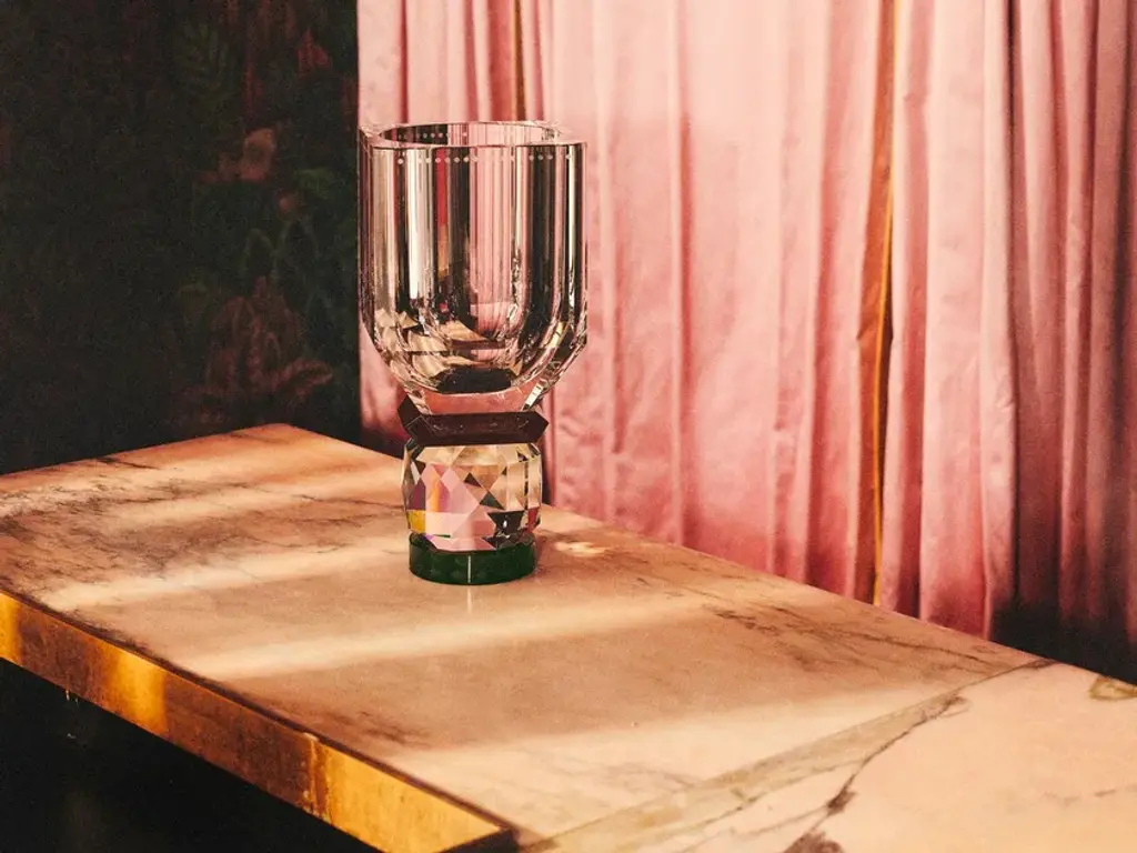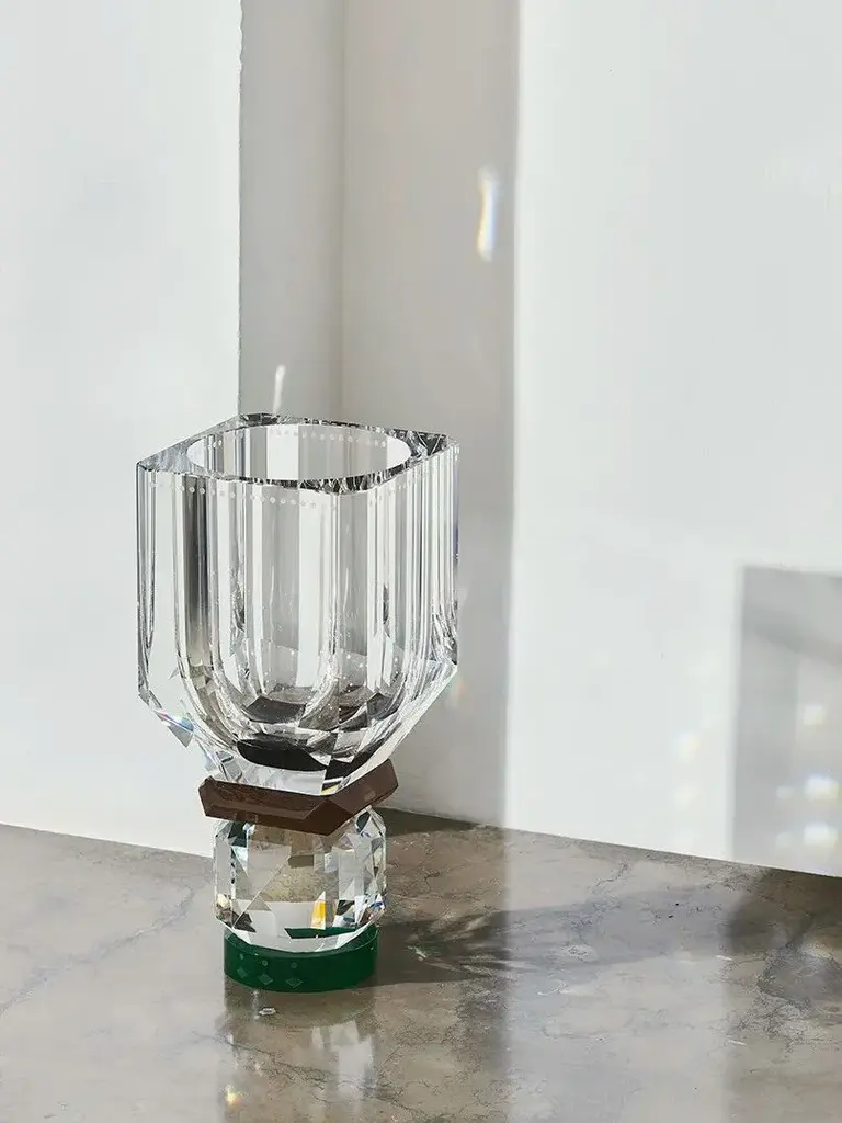The Utah vase echoes the designers enduring Art Deco influences, with its clean, geometric lines. It is made from high quality hand-cut crystals, with gemstone-like facetted edges that gives the vase an iridescent effect. Place this vase in a bright spot and see how the sunlight spreads a soft ambience.