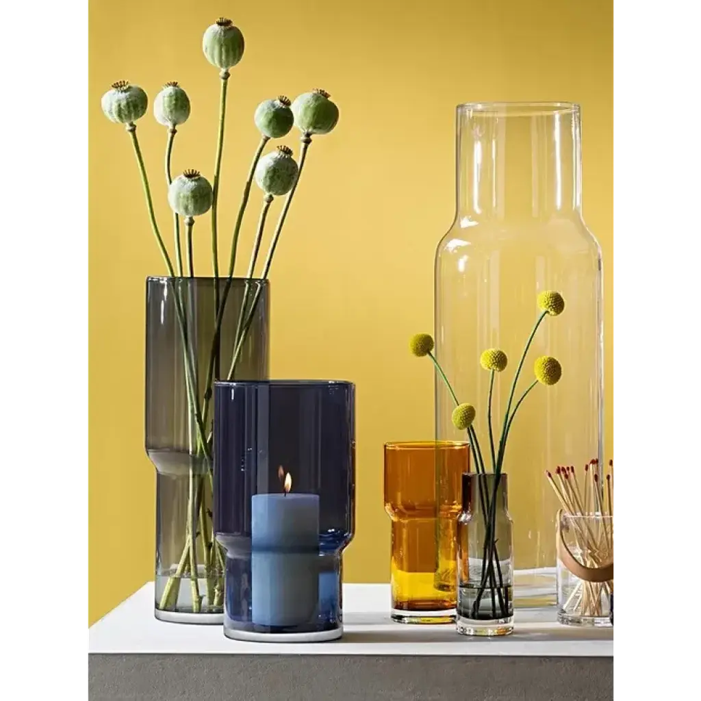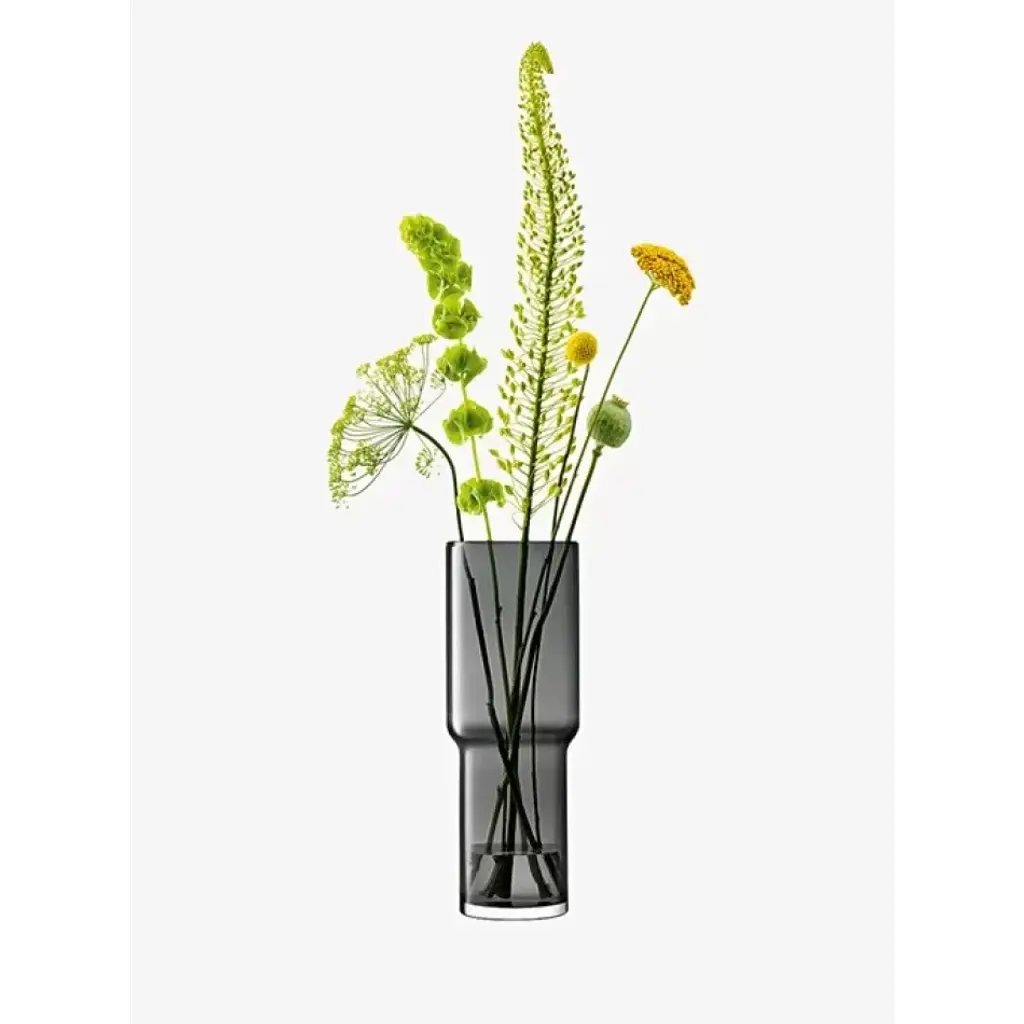 A tall mouth-blown glass vase with thick, stepped walls. Designed for mixed bouquets or a few large flower heads. Available in clear and cased-coloured glass. Mouth-blown glass Stepped shape Available in clear or coloured glass