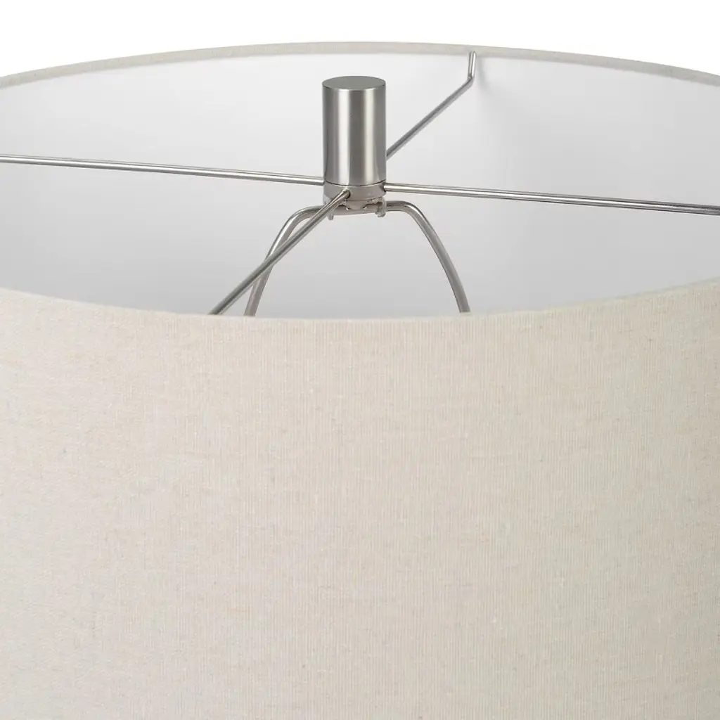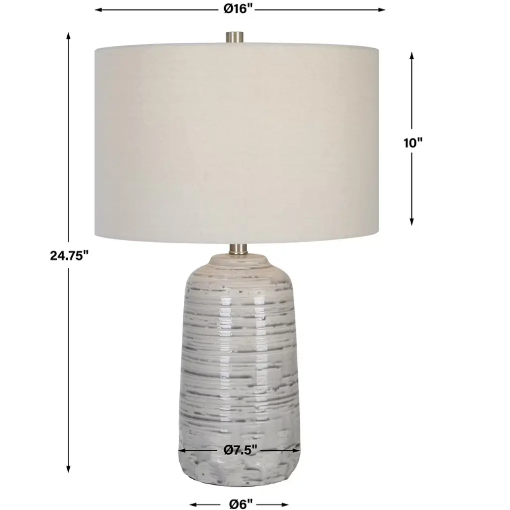Illuminate your space with the Uttermost Cyclone Ivory Table Lamp, a perfect blend of traditional elegance and contemporary flair. Crafted from premium ceramic and iron, this lamp features a unique urn-shaped base with subtle cut edges at the bottom, finished in an ivory glaze accented by a bold gray striped drip and brushed nickel details. The set includes a round hardback drum shade in light beige linen with natural slubbing for a soft, warm glow. Standing 24.75"H × 16"W × 16"D, this lamp suits tabletops, desks, or nightstands, adding both function and sophisticated style to living rooms, bedrooms, or offices. Product Features: Material: Ceramic base, iron accents, linen shadeColor: Ivory with gray drip and brushed nickel, beige shadeFinish/Frame: Glazed ceramic with nickel-plated accentsDimensions: 24.75"H × 16"W × 16"DShade: Round hardback drum, 10"H, top 16"W × 16"D, bottom 16"W × 16"DBulb: 150W, 1 TYPE A, 3-way socketStyle Match: Traditional with contemporary flair, versatile decor