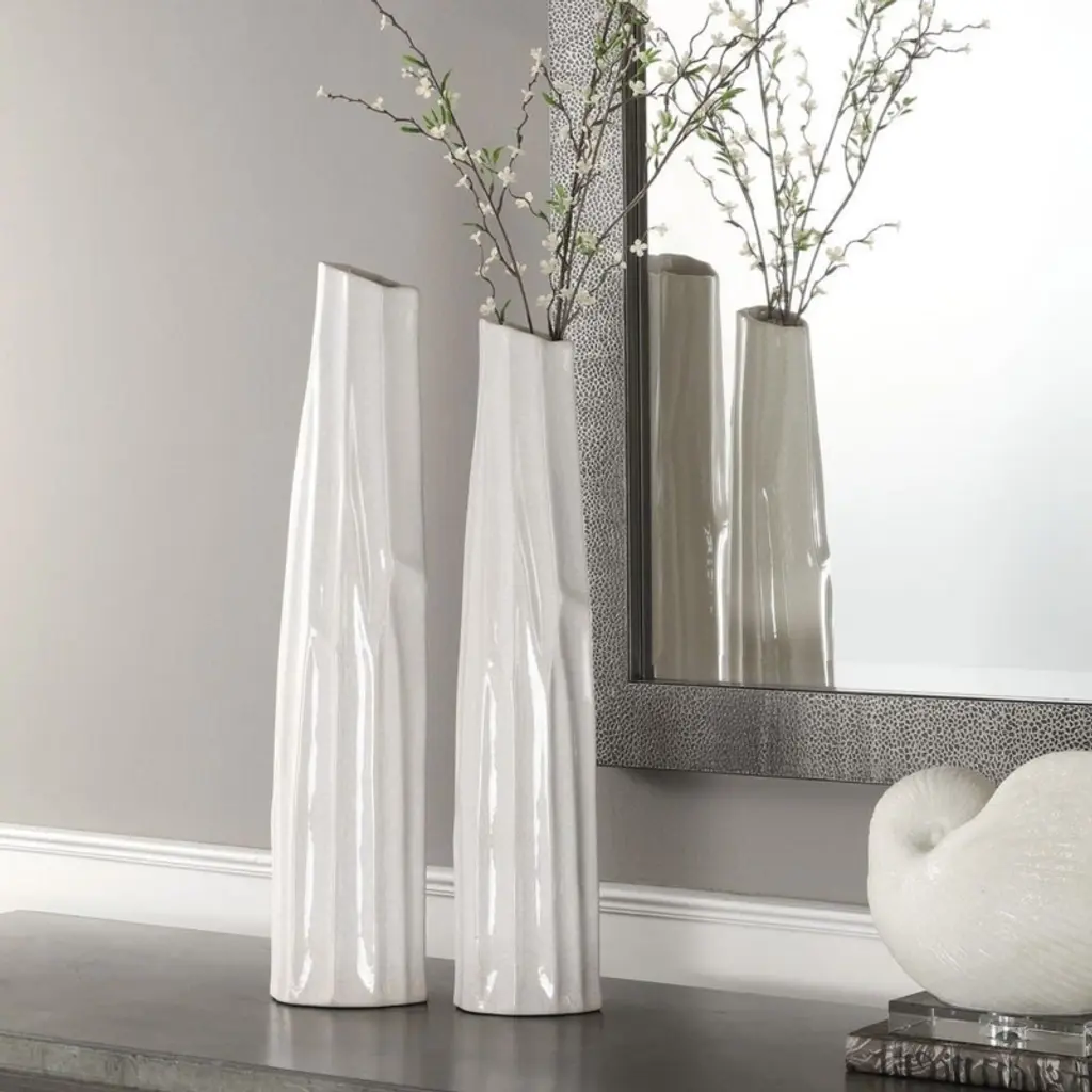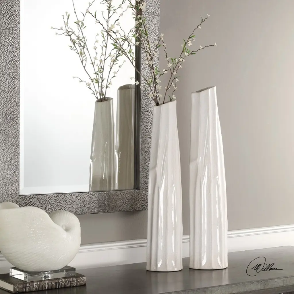 Bring serene sophistication to your home decor with the Kenley Crackled White Vase Set. Crafted from ceramic, these tall, slender vases showcase a timeless crackled white glaze, gently accented by soft pale gray undertones. Their minimalist profiles make them ideal for narrow spaces like shelves, mantels, or console tables—whether styled solo or filled with dried branches or faux florals. Includes two sizes for versatile display. Key Features: Crackled ceramic finish in elegant white with pale gray huesSet includes two sizes for layered visual interestPerfect for dried botanicals or as standalone sculptural accentsClean, narrow form ideal for mantels, entry tables, and shelvingDimensions: Large 25"H x 5"W x 4"D | Small 23"H x 5"W x 4"D |Total Weight: 15 lbs Whether in a modern, transitional, or coastal interior, these vases add height and artisanal texture with effortless elegance.