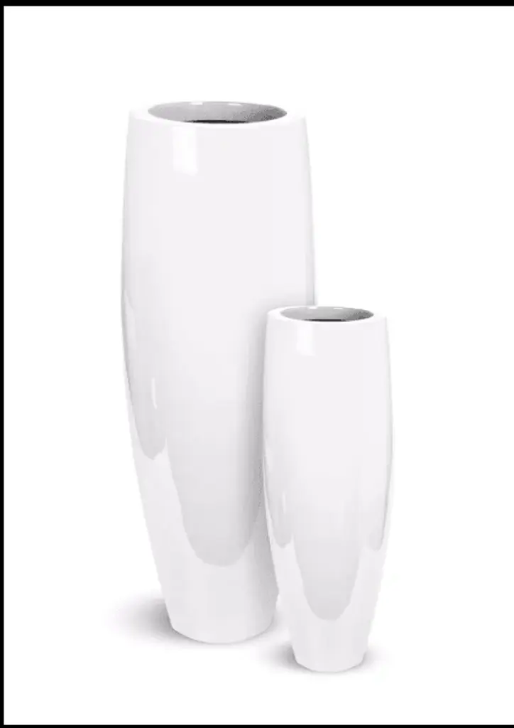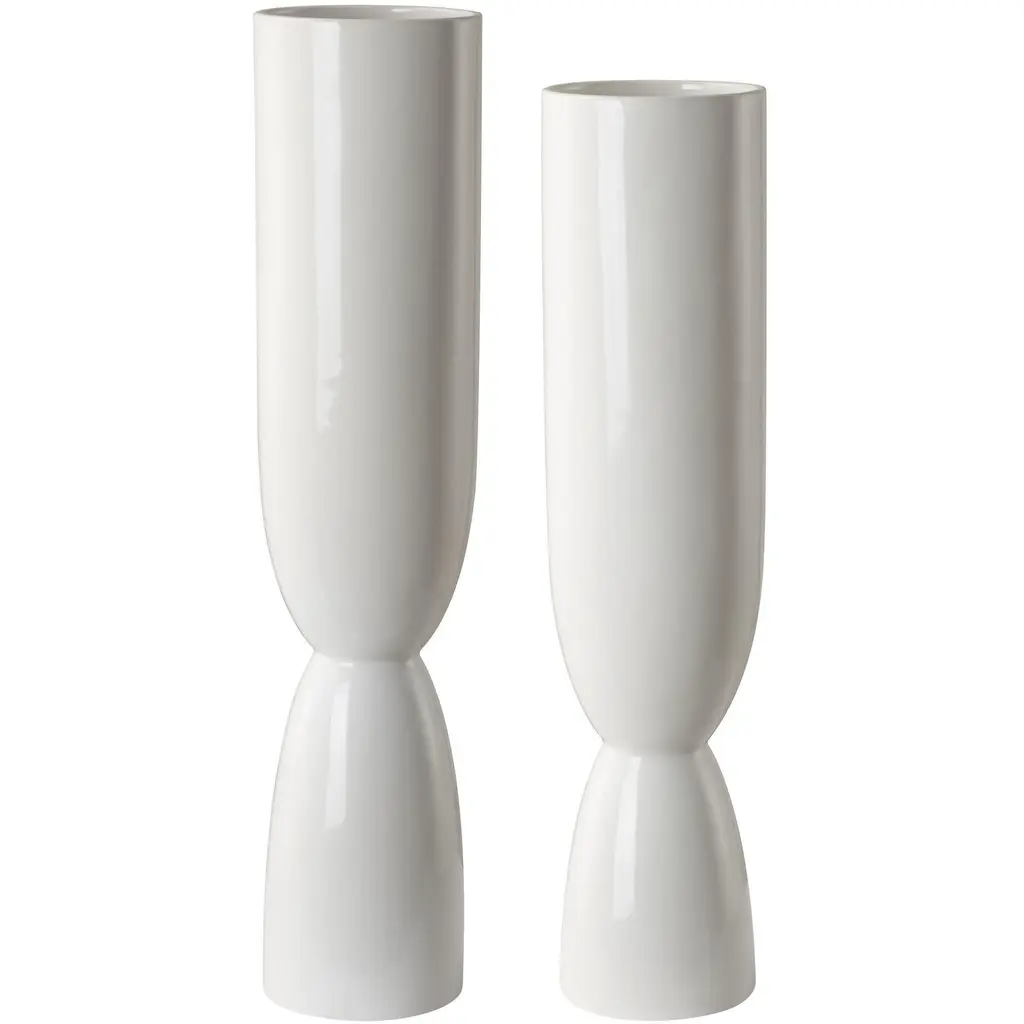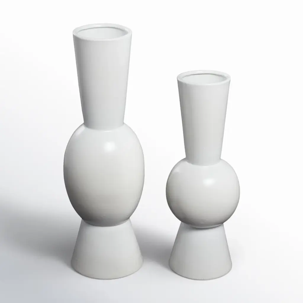 Add modern artistry to your space with the Kimist White Vases, Set of 2. These tall ceramic vases feature an elegantly narrow silhouette and a distinctive shape enhanced by a white fired glaze. Their sculptural profiles lend a minimalist yet bold aesthetic, ideal for contemporary decor. Key Features Set includes two ceramic vases in varied heights for visual balance Finished in a sleek white fired glaze for a modern minimalist look Tall, narrow shapes ideal for vertical styling on shelves or tables Perfect for dried arrangements or as stand-alone decor Dimensions: 5 W x 20 H x 5 D in | Weight: 10 lbs (L size)