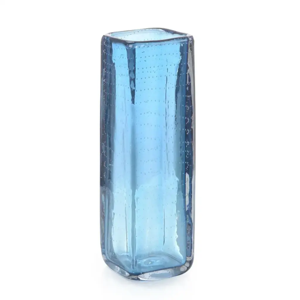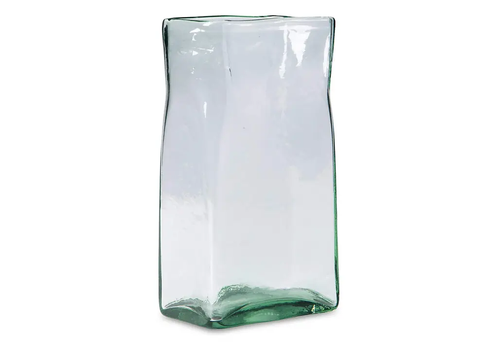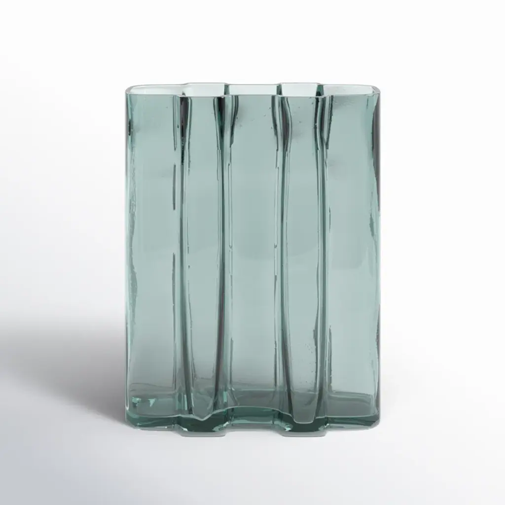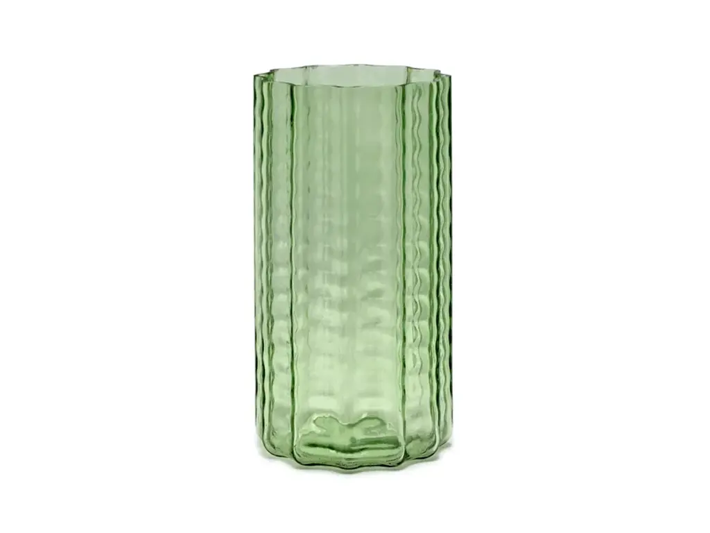 Vase 03 is a green colored mouthblown glass.The shape of this mouthblown vase was inspired by the large windows of Antwerp’s MAS Museum, which Ruben Deriemaker considers a fine example of a sublime design. Besides its unique design, the vase also has a subtle color: a nice combination, just perfect for a small bunch of flowers.This mouthblown vase was inspired by the monumental windows of Antwerp’s MAS Museum which, according to Ruben Deriemaker, are a good example of a sublime work of art. Besides its unique design, the vase also has a subtle color: a nice combination, just perfect for a small bunch of flowers.Wave is a collection of glass vases based on the large glass panels of the MAS. In Ruben’s eyes, these glass panels are a sublime work of art and embody, like no other, the beauty of the material and its infinite application. Because of the pronounced shape and texture/structure, he chose an honest, subtle colour: a very light green. In this way, the shape and the material remain at the forefront. The design consists of the same repetitive shape that determines the length of the work. By playing with different diameters, there are several different shapes and applications. The linear construction and structure of the wooden mould create a unique pattern in the glass. In this way, Deriemaeker translates his passion for wood and his origins as a manufacturer/designer.