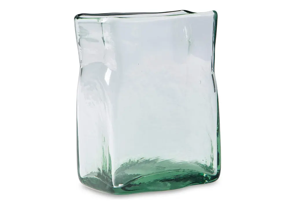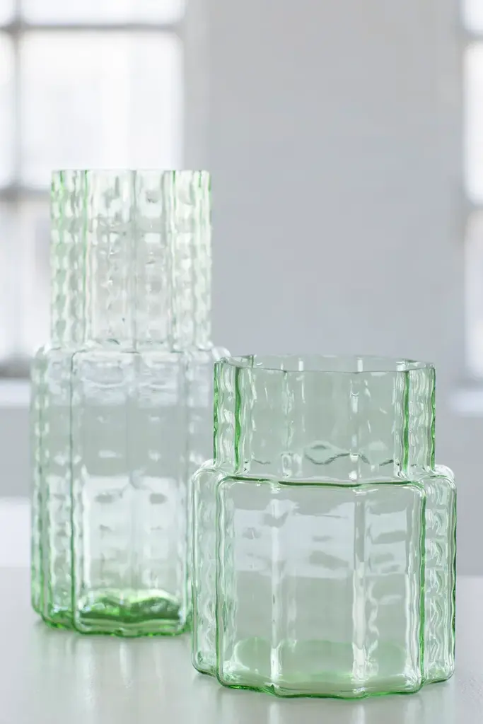 Vase 03 is a green colored mouthblown glass.The shape of this mouthblown vase was inspired by the large windows of Antwerp’s MAS Museum, which Ruben Deriemaker considers a fine example of a sublime design. Besides its unique design, the vase also has a subtle color: a nice combination, just perfect for a small bunch of flowers.This mouthblown vase was inspired by the monumental windows of Antwerp’s MAS Museum which, according to Ruben Deriemaker, are a good example of a sublime work of art. Besides its unique design, the vase also has a subtle color: a nice combination, just perfect for a small bunch of flowers.Wave is a collection of glass vases based on the large glass panels of the MAS. In Ruben’s eyes, these glass panels are a sublime work of art and embody, like no other, the beauty of the material and its infinite application. Because of the pronounced shape and texture/structure, he chose an honest, subtle colour: a very light green. In this way, the shape and the material remain at the forefront. The design consists of the same repetitive shape that determines the length of the work. By playing with different diameters, there are several different shapes and applications. The linear construction and structure of the wooden mould create a unique pattern in the glass. In this way, Deriemaeker translates his passion for wood and his origins as a manufacturer/designer.
