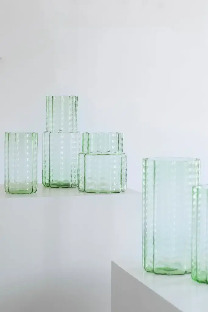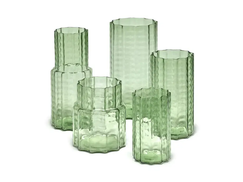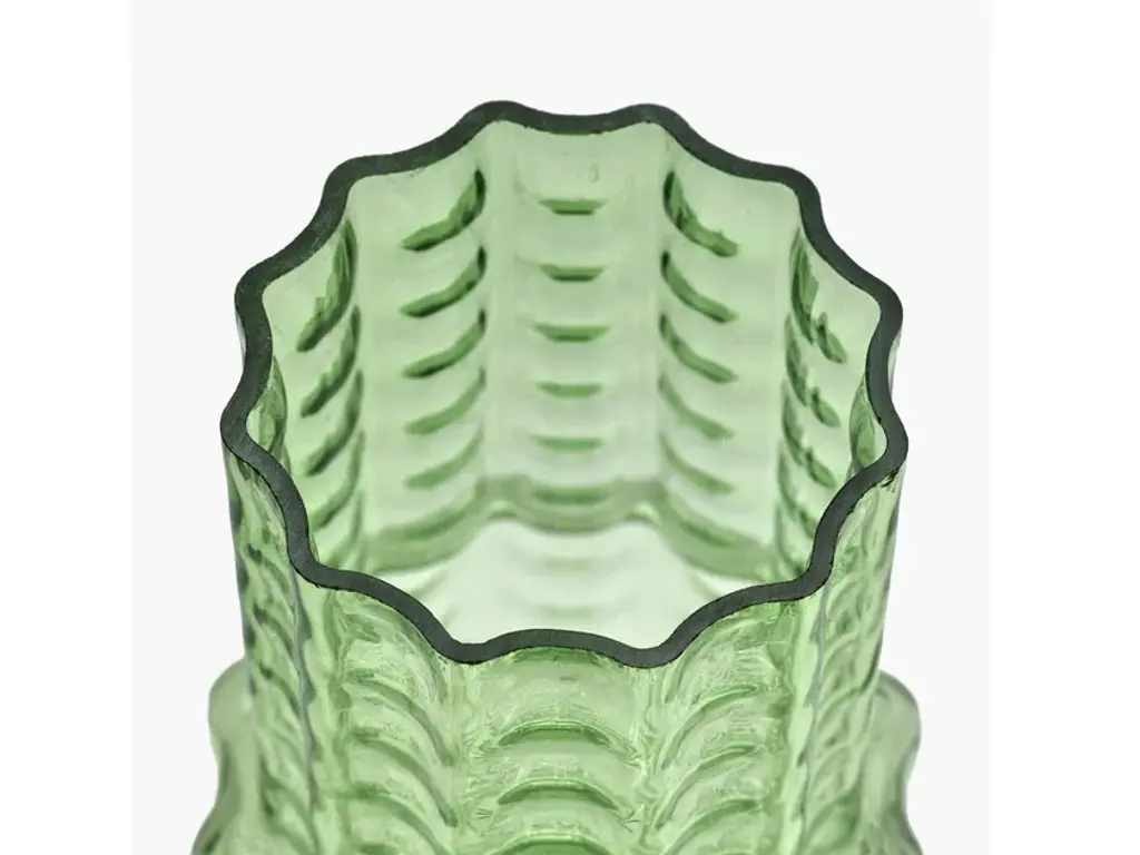 Vase 03 is a green colored mouthblown glass.The shape of this mouthblown vase was inspired by the large windows of Antwerp’s MAS Museum, which Ruben Deriemaker considers a fine example of a sublime design. Besides its unique design, the vase also has a subtle color: a nice combination, just perfect for a small bunch of flowers.This mouthblown vase was inspired by the monumental windows of Antwerp’s MAS Museum which, according to Ruben Deriemaker, are a good example of a sublime work of art. Besides its unique design, the vase also has a subtle color: a nice combination, just perfect for a small bunch of flowers.Wave is a collection of glass vases based on the large glass panels of the MAS. In Ruben’s eyes, these glass panels are a sublime work of art and embody, like no other, the beauty of the material and its infinite application. Because of the pronounced shape and texture/structure, he chose an honest, subtle colour: a very light green. In this way, the shape and the material remain at the forefront. The design consists of the same repetitive shape that determines the length of the work. By playing with different diameters, there are several different shapes and applications. The linear construction and structure of the wooden mould create a unique pattern in the glass. In this way, Deriemaeker translates his passion for wood and his origins as a manufacturer/designer.