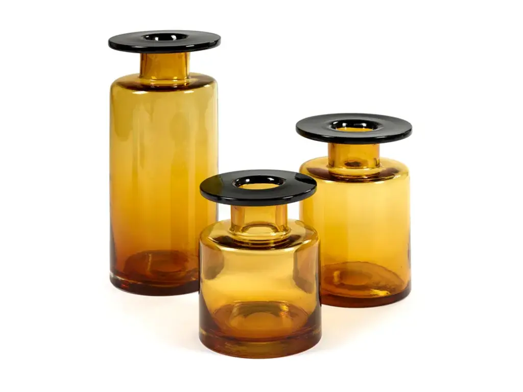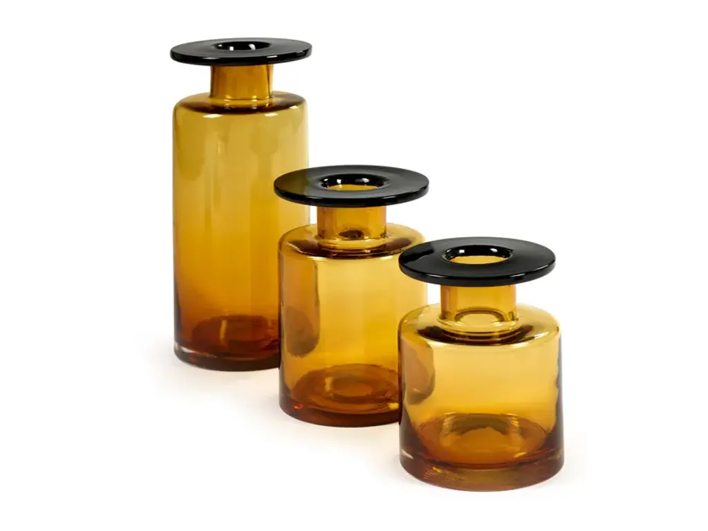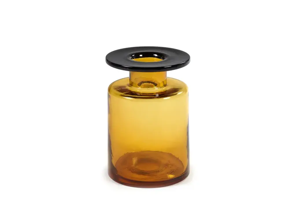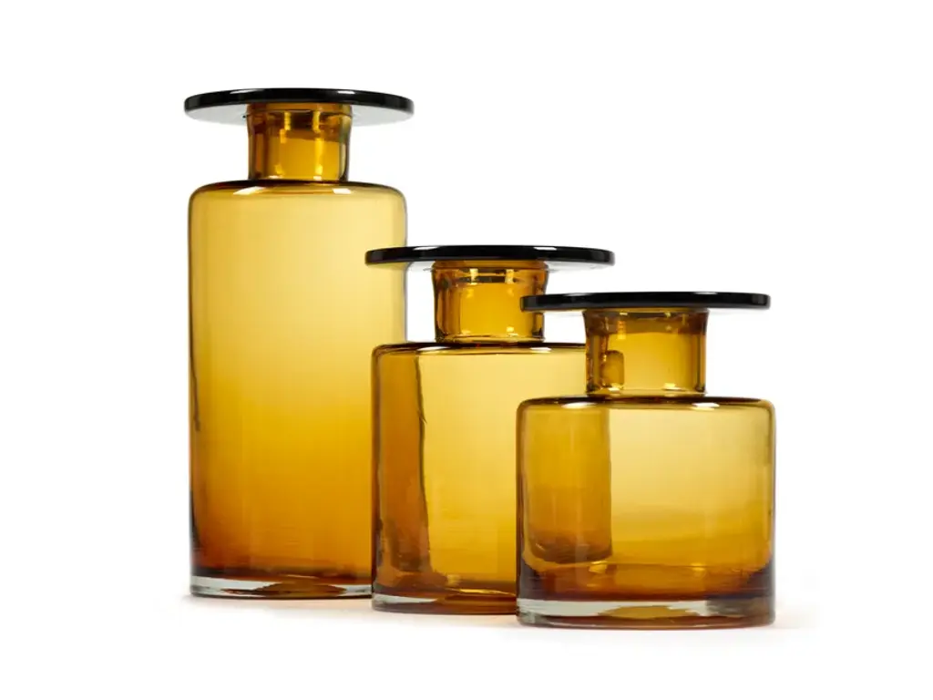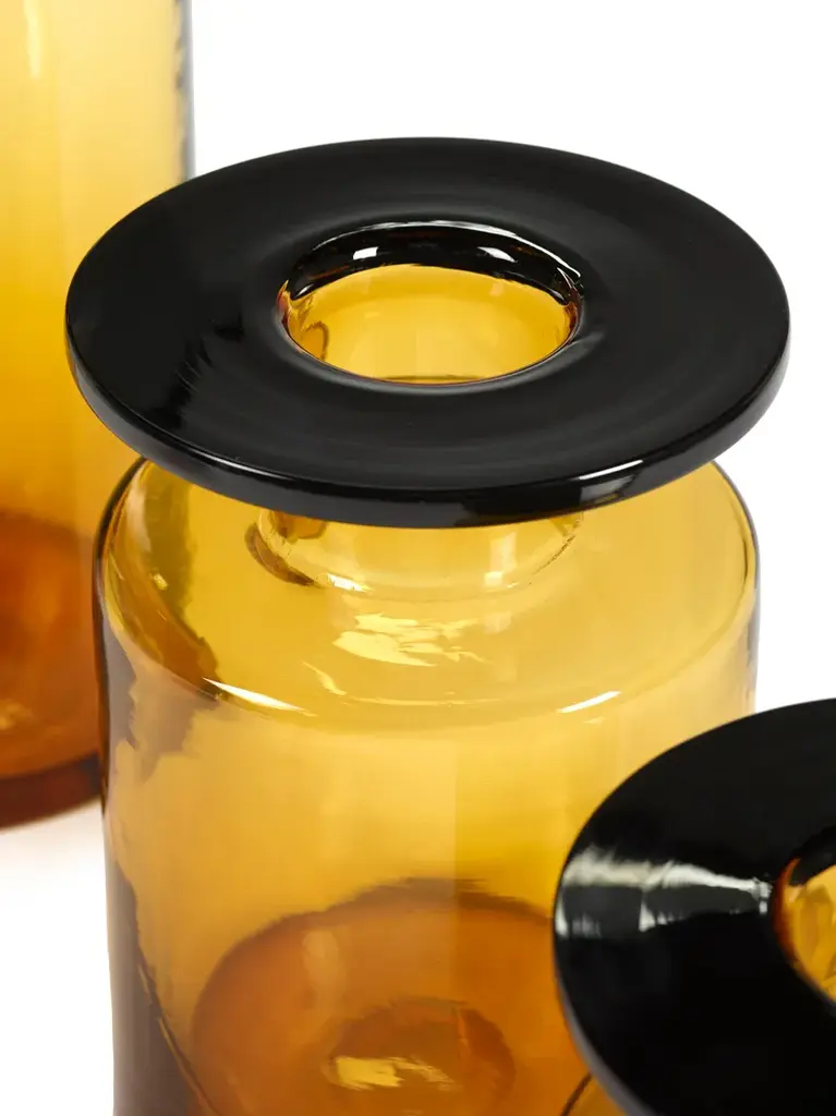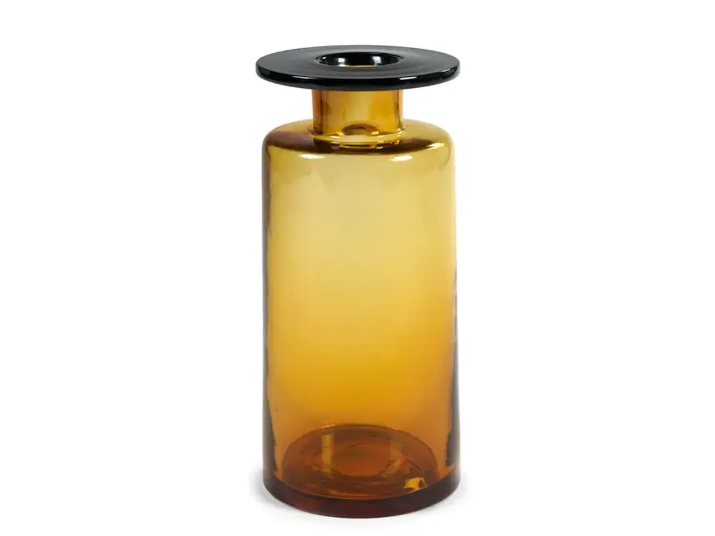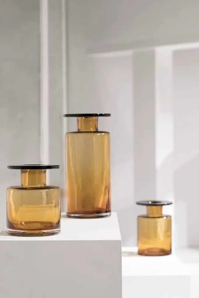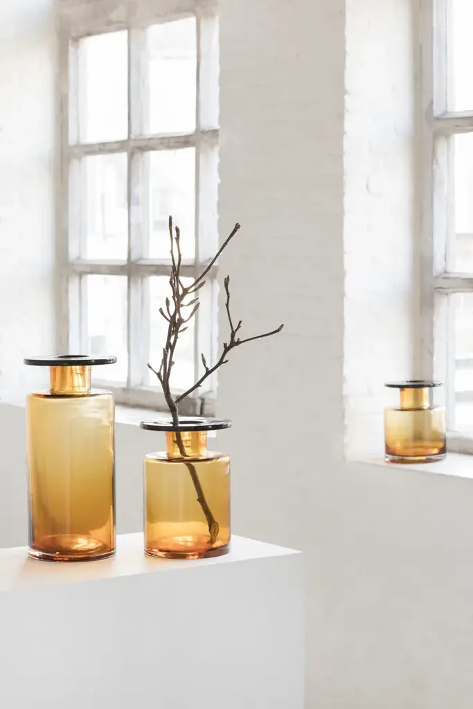 Vase Aubergine is a colored glass round vase.This glassware vase in black & amber might remind you of vintage pharmacy bottles. This vase is part of the Wind & Fire collection by Marie Michielssen and is available in different sizes.This amber and black glass vase is a beautiful addition to any interior. It is part of the Wind & Fire collection by Marie Michielssen and is available in different sizes, allowing you to combine them endlessly for a unique look.With Wind & Fire, designer Marie Michielssen makes a foray into a relatively new field, namely glass. A very lively material, that is shaped using a combination of wind and fire. She has transposed her organic paper mâché EARTH vases into glass. At the same time, she has also added completely new shapes to the collection. “The shape of these vases is reminiscent of old pharmacy pots”, says Marie. “I like the proportions of these pots.” Marie felt that glass offered her an opportunity to experiment with colour.