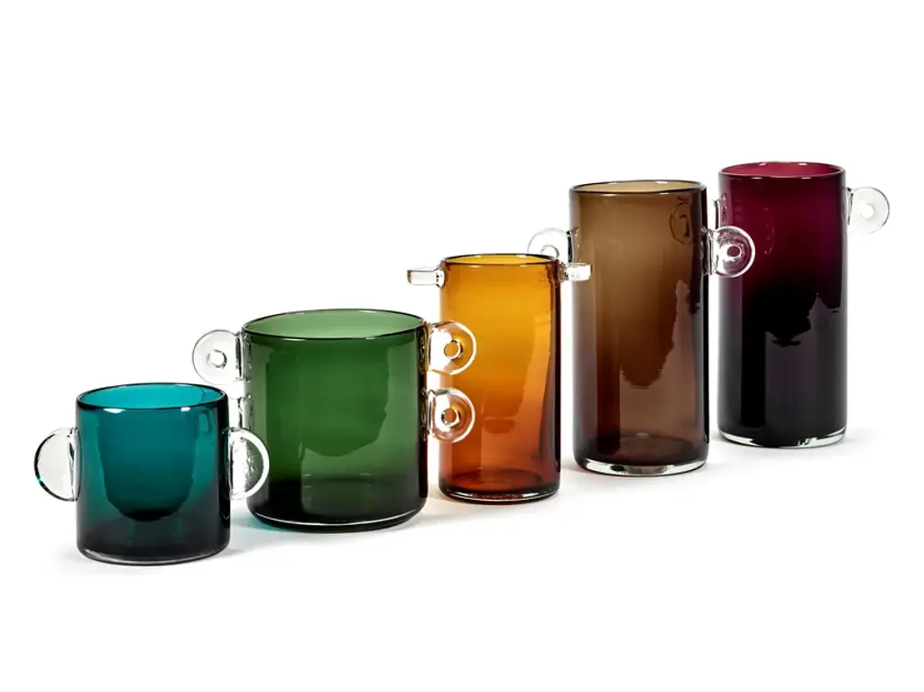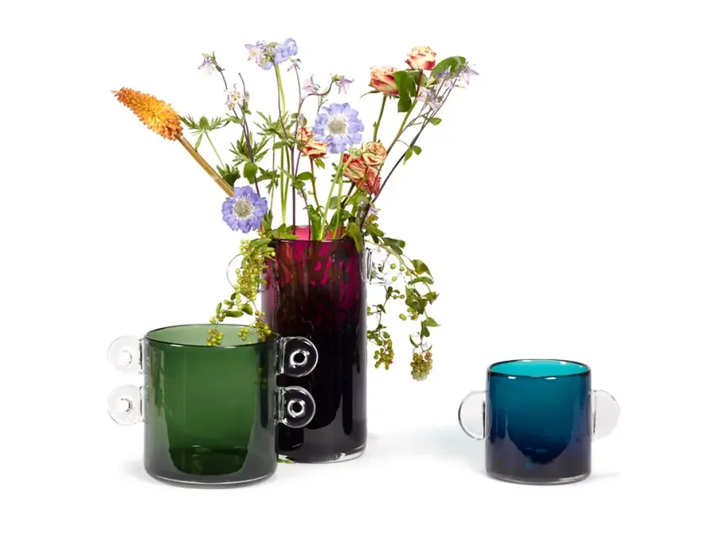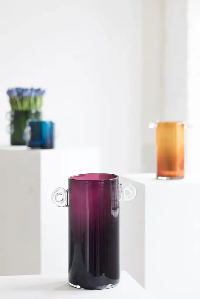 Vase Aubergine is a colored glass round vase.This aubergine purple glass vase is the result of translating the paper maché Earth collection into glassware. Designed by Marie Michielssen as part of the Wind & Fire collection, this vase is a versatile piece that can be combined in many ways with other vases and glassware.With Wind & Fire, designer Marie Michielssen makes a foray into a relatively new field, namely glass. A very lively material, that is shaped using a combination of wind and fire. She has transposed her organic paper mâché EARTH vases into glass. At the same time, she has also added completely new shapes to the collection. “The shape of these vases is reminiscent of old pharmacy pots”, says Marie. “I like the proportions of these pots.” Marie felt that glass offered her an opportunity to experiment with colour.