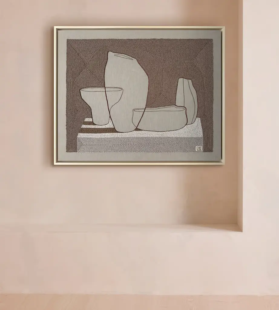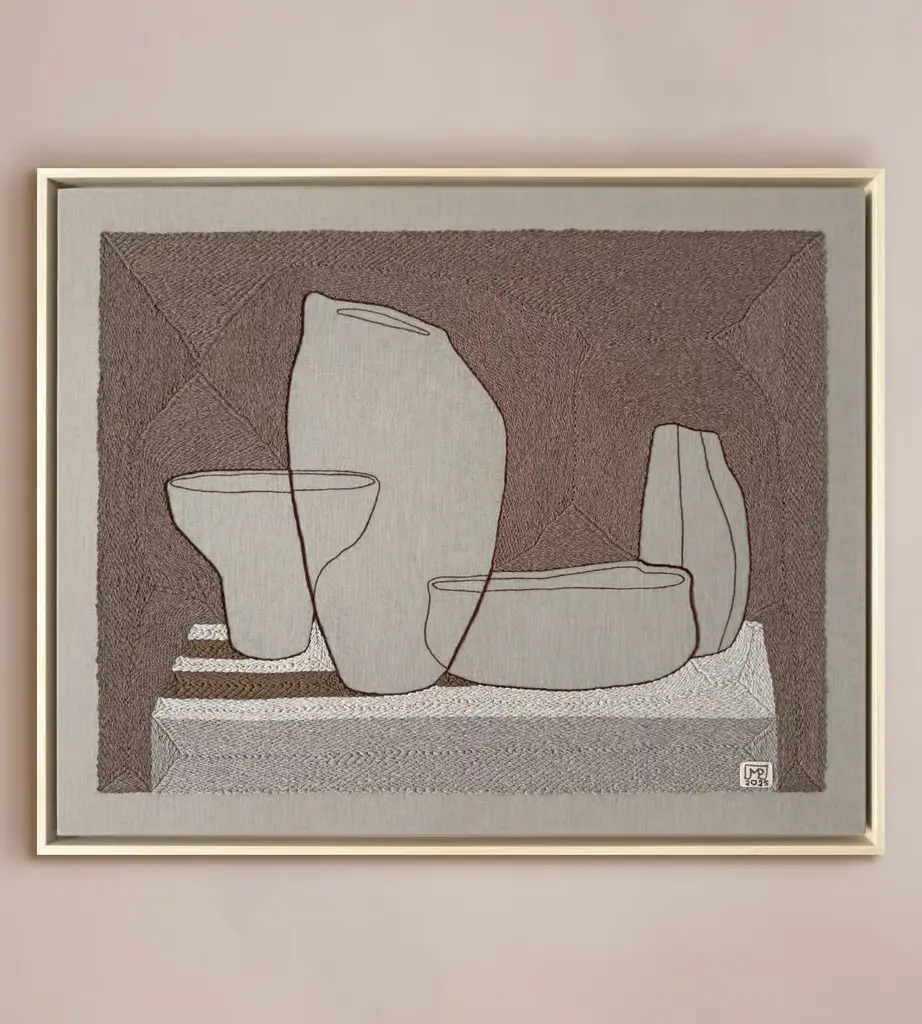 This original still-life fabric painting is created using linen, wool yarn and alpaca yarn. Now based in Reggio Calabria, Polish artist Milena Paladino specialises in still life, showcasing delicate, simple compositions in her work. After a long search to find the right medium for her creativity, the artist began creating textile works, which adds a sensory aspect to her art.