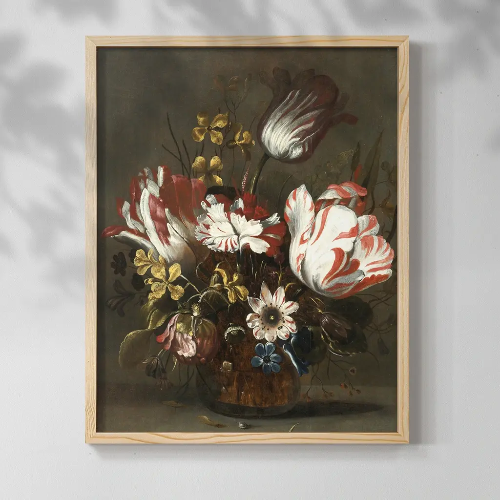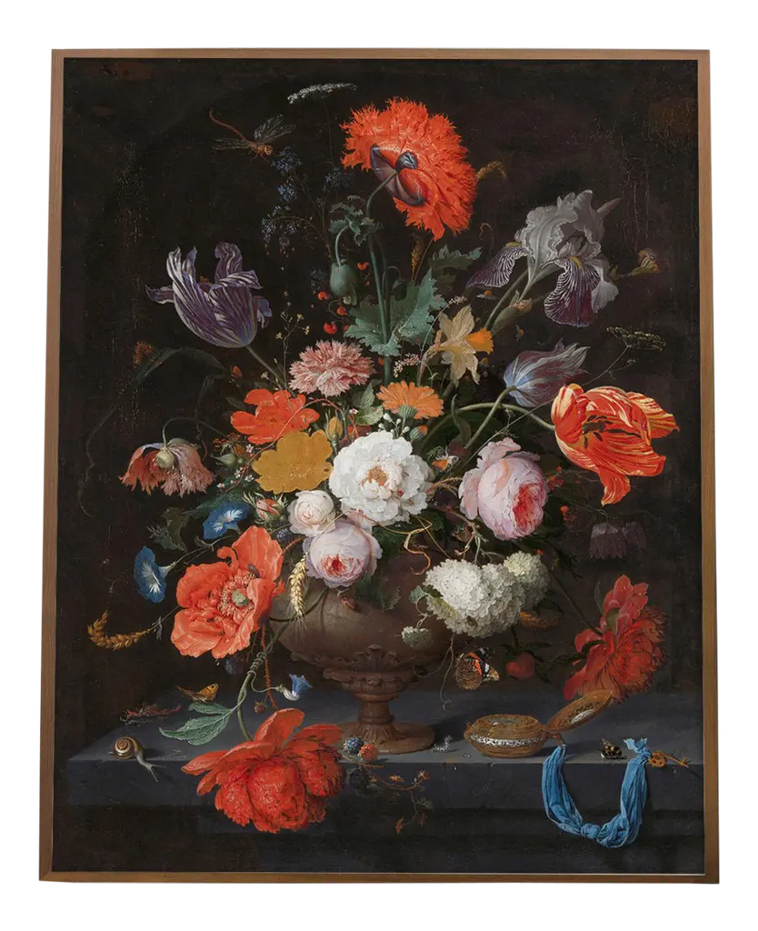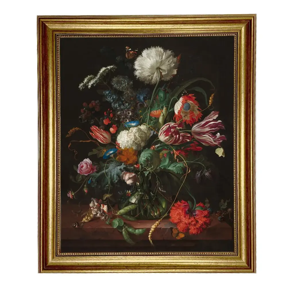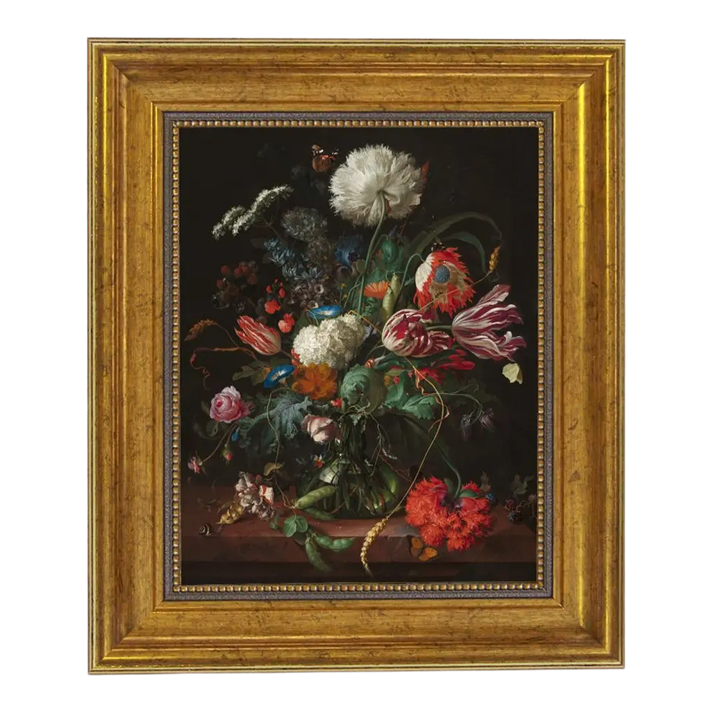 DESCRIPTION Accurately reproduced from the original work"Vase of Flowers" After Jan Davidsz DeHeem, this antiqued print reproduction after is framed in the proper period frame. FRAMING 2" Antique gold resin frame Complete with flush-mounted eye hooks and picture wire installed on back. DIMENSIONS Painting Dimensions (in):16x20 Outside Frame Dimensions (in):19.5x23.5 SHIPPING Will ship within 1-3 business days.