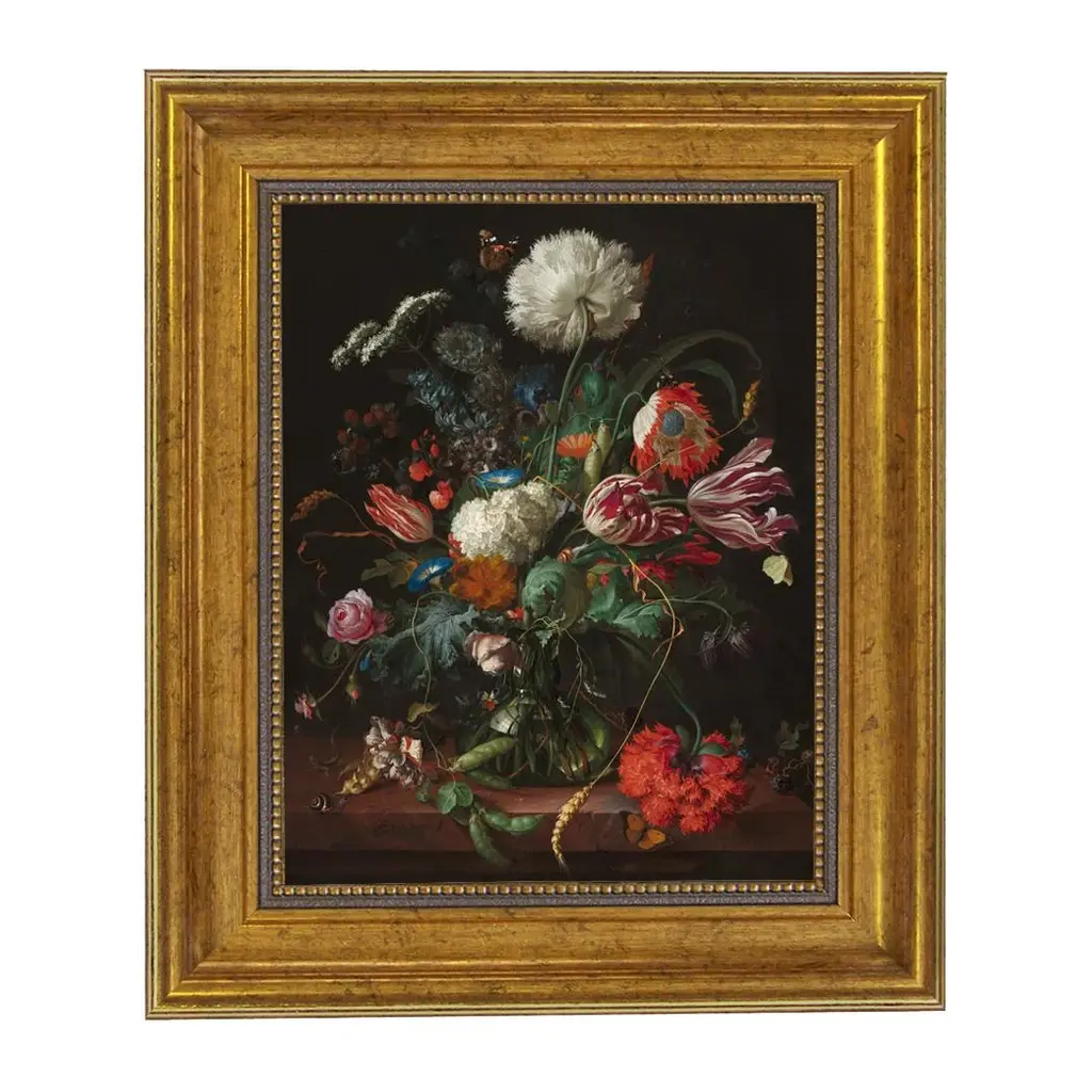 DESCRIPTION Accurately reproduced from the original work"Vase of Flowers" After Jan Davidsz DeHeem, this antiqued print reproduction after is framed in the proper period frame. FRAMING 2" Antique gold resin frame Complete with flush-mounted sawtooth hanger installed on back. DIMENSIONS Painting Dimensions (in):8x10 Outside Frame Dimensions (in):11.5x13.5 SHIPPING Will ship within 1-3 business days.