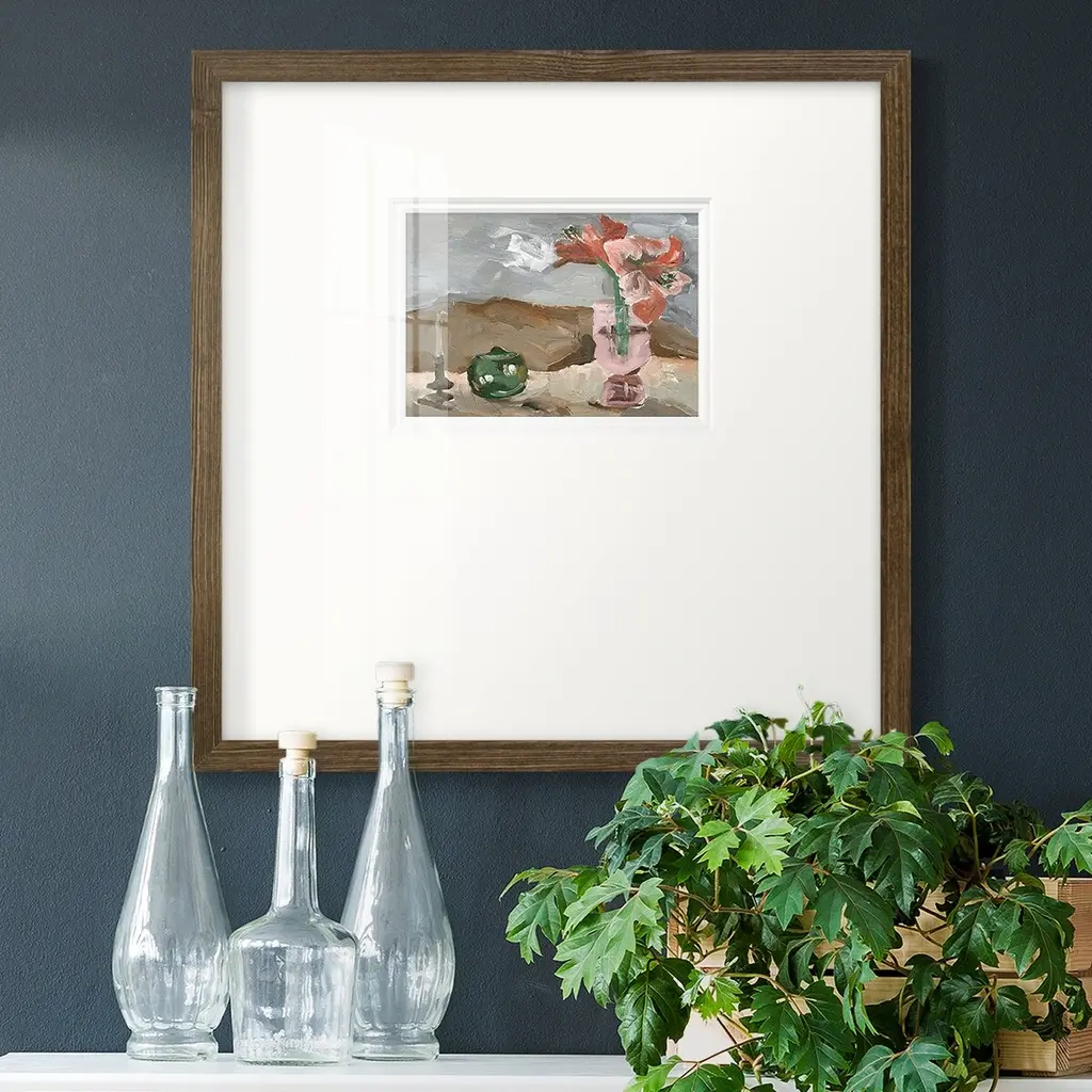 Vase of Pink Flowers IIPremium Framed Print A framed cold pressed paper print featuring superior double matting and quality frame. 2 SIZES AVAILABLE 16''X16''' - Overall Size 20''X20''' - Overall Size Each piece is made to order. Each piece comes with hanging hardware. Made in the USA Ready to Hang Giclee Paper Print Plexiglass Beveled Matt Board Double Matte Board