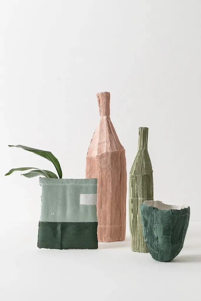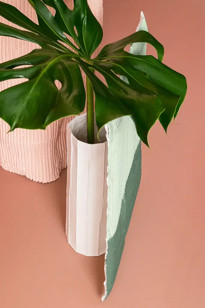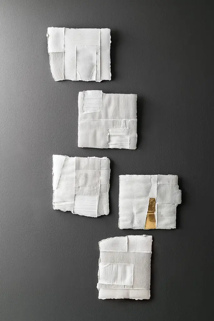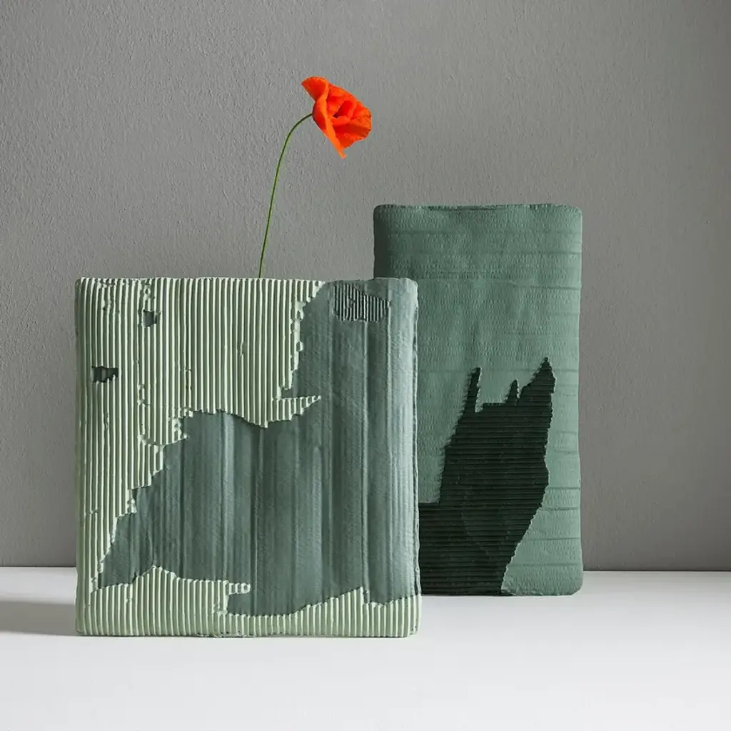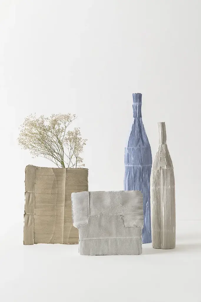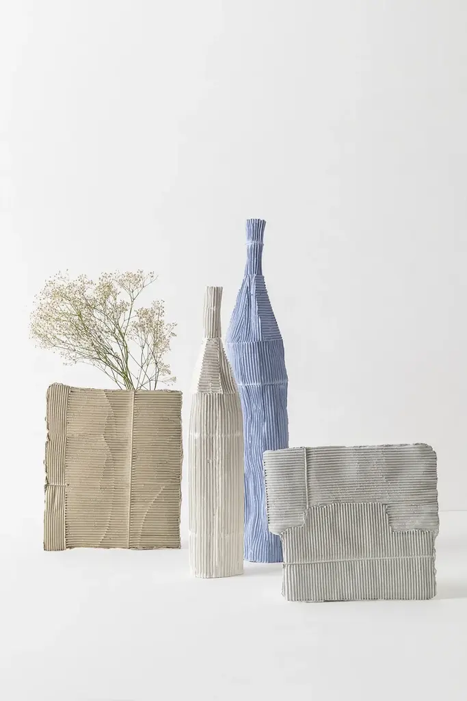 VASO A SORPRESA Quadro is a paperclay vase available in various colours and sizes.At first glance, these unpublished works by the Italian ceramic artist stand like slender clay slabs made with the paper clay technique.This technique makes the two-dimensional surface suggestive conferring depth and tactility.The varying orientation of the corrugated cardboard embedded in the clay, the absence of textures in other cases, and, in some works, the inserts of gold leaf, characterize these apparently two-dimensional works.Only by turning the object around, the third dimension, that transforms the slabs into a functional sculptural object, is revealed. Cylinders applied on the back of the slabs not only allow them to support themselves but take on the role of vase.