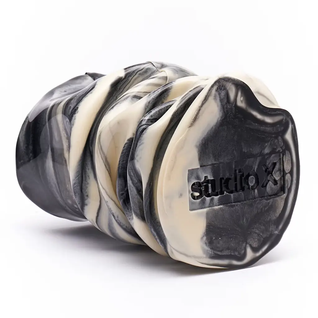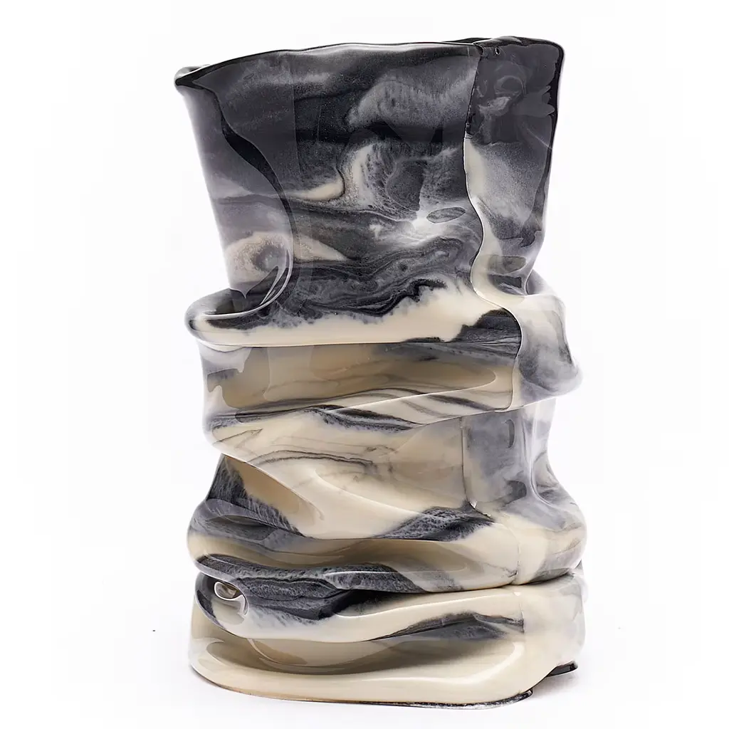 Marked by a captivating, almost crumpled look that is in fact inspired by ancient Greek-Roman draperies, this exclusive resin vase will ideally fit in sophisticated contemporary decors. Its sublime charm results emphasized by a dreamy coexistence between contrasting neutral shades that lend it a stunning marbled effect. Please explore the Artemest catalog for more sizes and colors.