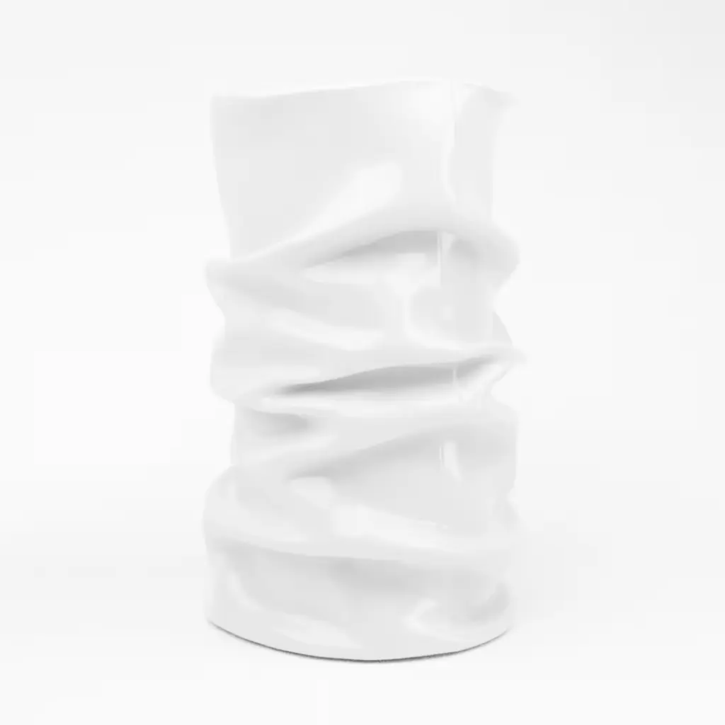 Here showcased in a glossy total-white look of striking luminosity, this resin vase belongs to a series of handcrafted pieces distinguished by a flounced design inspired by Ancient Greek-Roman garments. Its irregular curves and unadorned aesthetic reveal its contemporary spirit. Multiple size and color variants are available in the Artemest catalog.