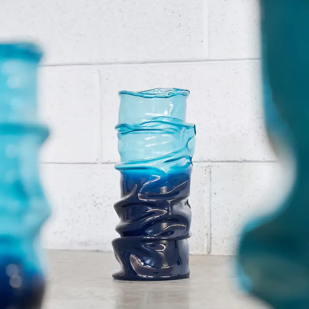 Characterized by a unique degradé finish achieved by creating shades that transition from a dark blue hue to a lighter shade of turquoise, this spectacular vase belongs to the iconic Studio X's series named after the goddess Venus. A contemporary interpretation of Roman and Greek drapery, it is hand-molded from resin, revealing fluid shapes and shadows that create a play of movement that conveys body and softness.