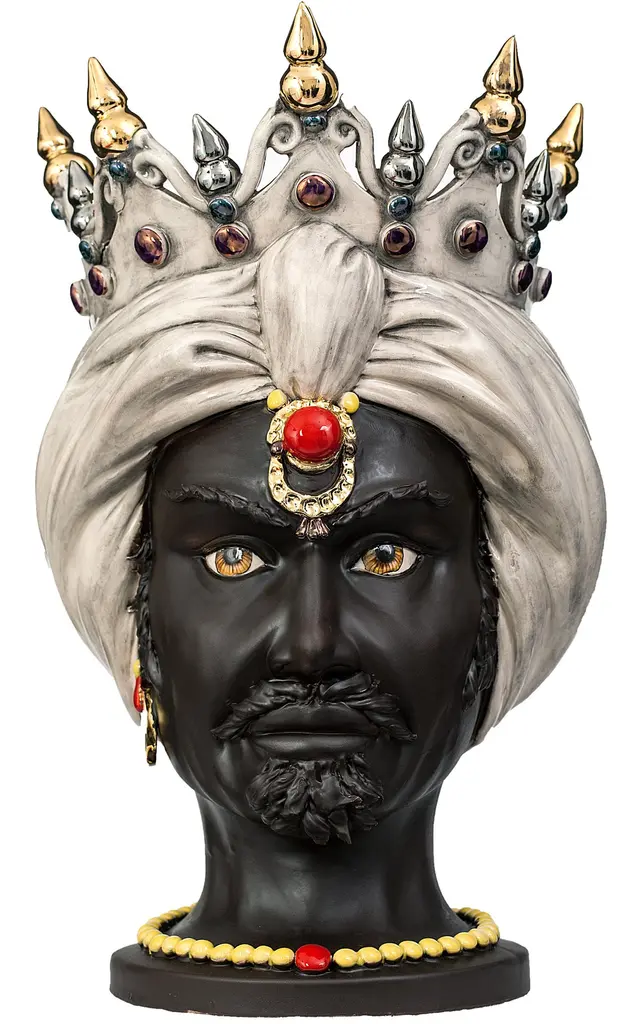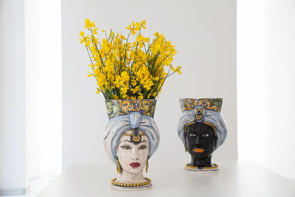 The CollectionThis collection offers ideas for contemporary décor through sophisticated revelations of art bound to the tradition of ceramics of Caltagirone, objets d’art that combine history and design.The extreme attention to details, supported by twenty years of experience of master craftsmen, is the company’s strength.The production technique hides secrets and art mixtures that make the product unique and exclusive. Mosche Bianche chooses to combine art and design to recall history through ceramic artworks in doing so, history revives, as in a fairy tale, an incredible civilization that is the sicilian culture.The moorish heads in ceramics, tribute to the beauty of ancient Sicily and its traditions, draw inspiration from a legend of love and jealousy set during the arabic domination in Sicily.A Story Of Love And JealousyThe legend tells that during the moorish domination in Sicily around 1000, in the arabic district of Palermo “al hàlisah” that a moor who, overwhelmed by a violent passion, declared his love to her. Noticed means “the chosen one”, a sweet girl the young girl charmed by his promise of love reciprocated. However, the moor was hiding a terrible truth. He already had a wife and children back home. So, when the girl discovered it, she decided to keep his beloved face with her forever. Without hesitation, she cut off his head and create a vase in which she planted a basil shoot. This aromatic plant has always had an aura of holiness as it represents the rulers’ plant. In this sense, that terrible act was justified by her absolute love to continue to take care of her beloved young moor. Every day in fact, the tears of the young heart-broken girl watered the plant of basil that kept thriving and flourishing. And all the neighbours, inebriated by that sentof the beautiful plant, started to commission clay vases shaped as a moor head.This piece is available with Crown or Without:Sizes: (D - H)With crownS 16 x 24 cm - 5.90 x 9.45 incM 26 x 40 cm - 10.23 x 15.74 incL 32 x 50 cm - 12.59 x 19.68 incWithout crownS 16 x 22 cm - 6.29 x 8.66 incM 26 x 35 cm - 10.23 x 13.77 incL 32 x 46 cm - 12.59 x 18.11 inc.