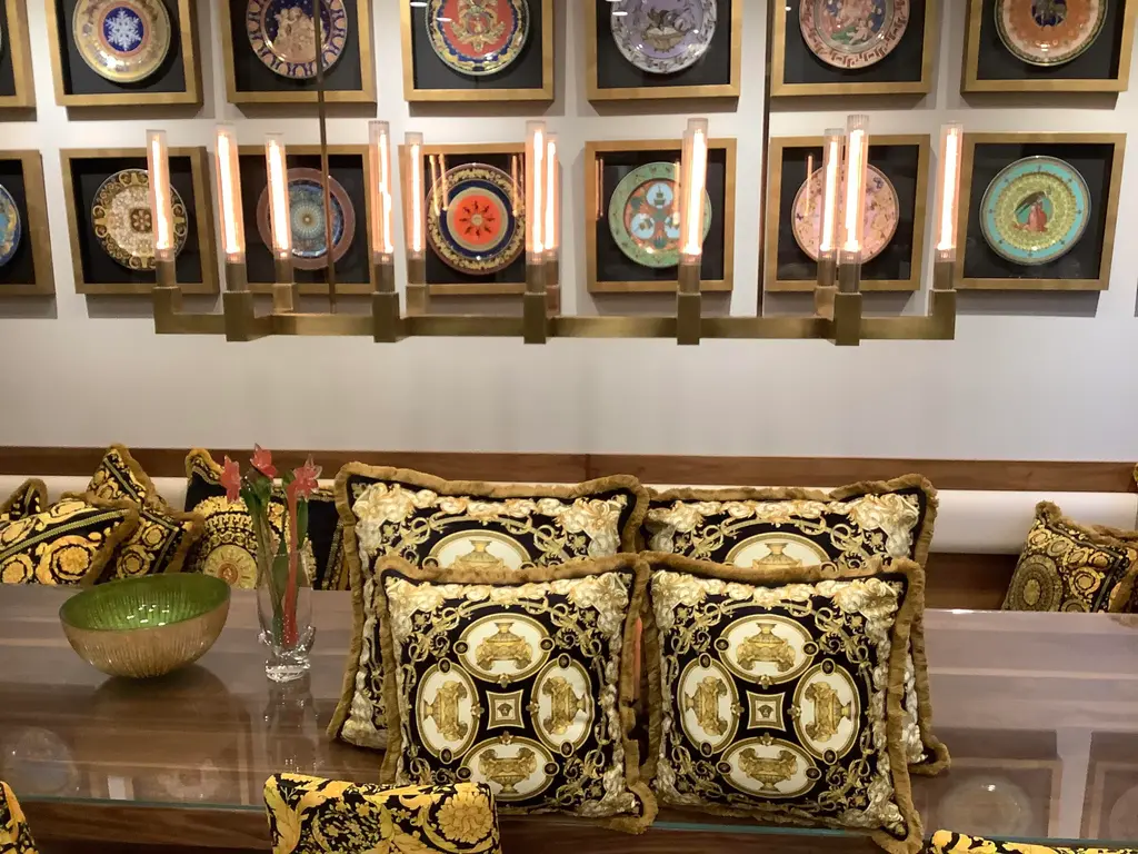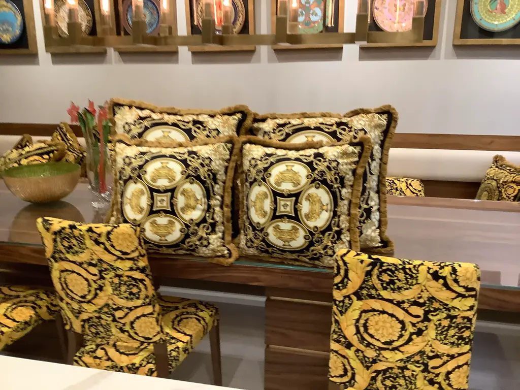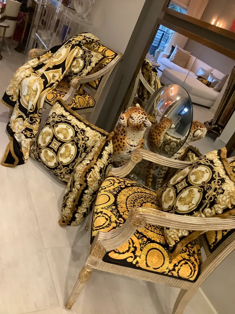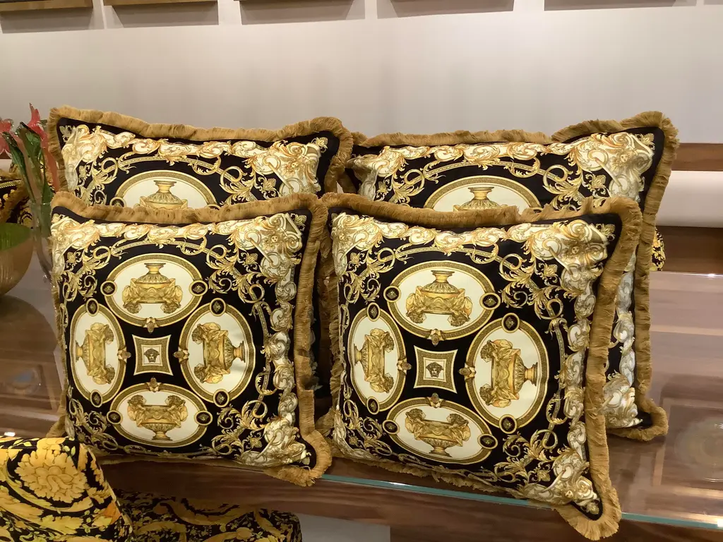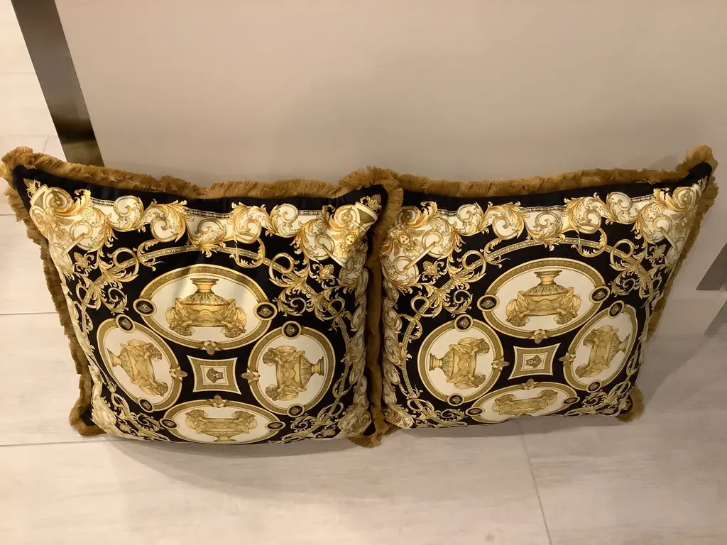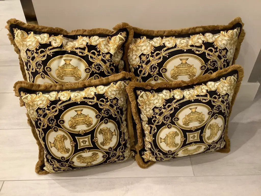 1990s Versace amazing set of 4 pillows lion and urn print set of 2 pillows are 18”18” with inserts the other set is Xl 28”28” with inserts in perfect shape this pillows are custom Made from heavy upholstery velvet fabric