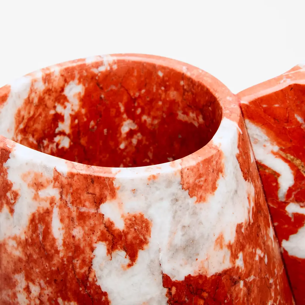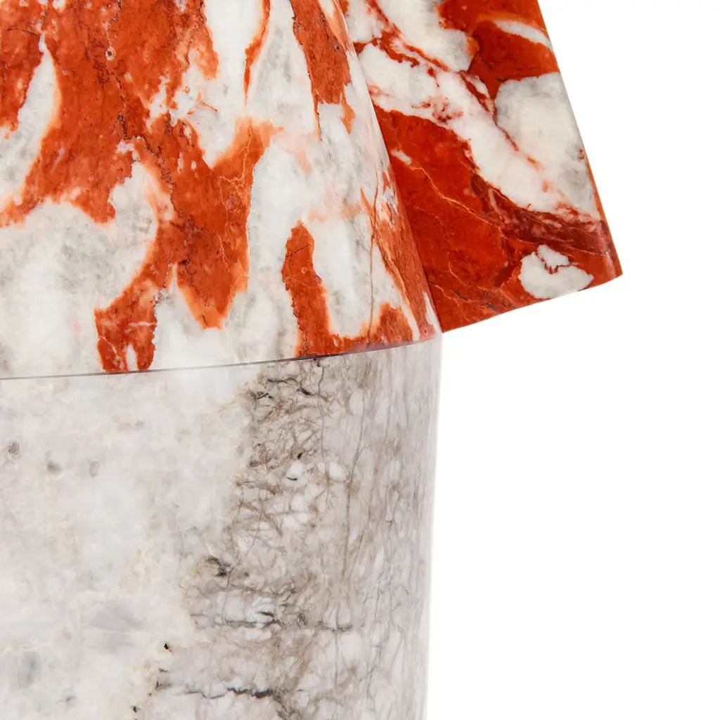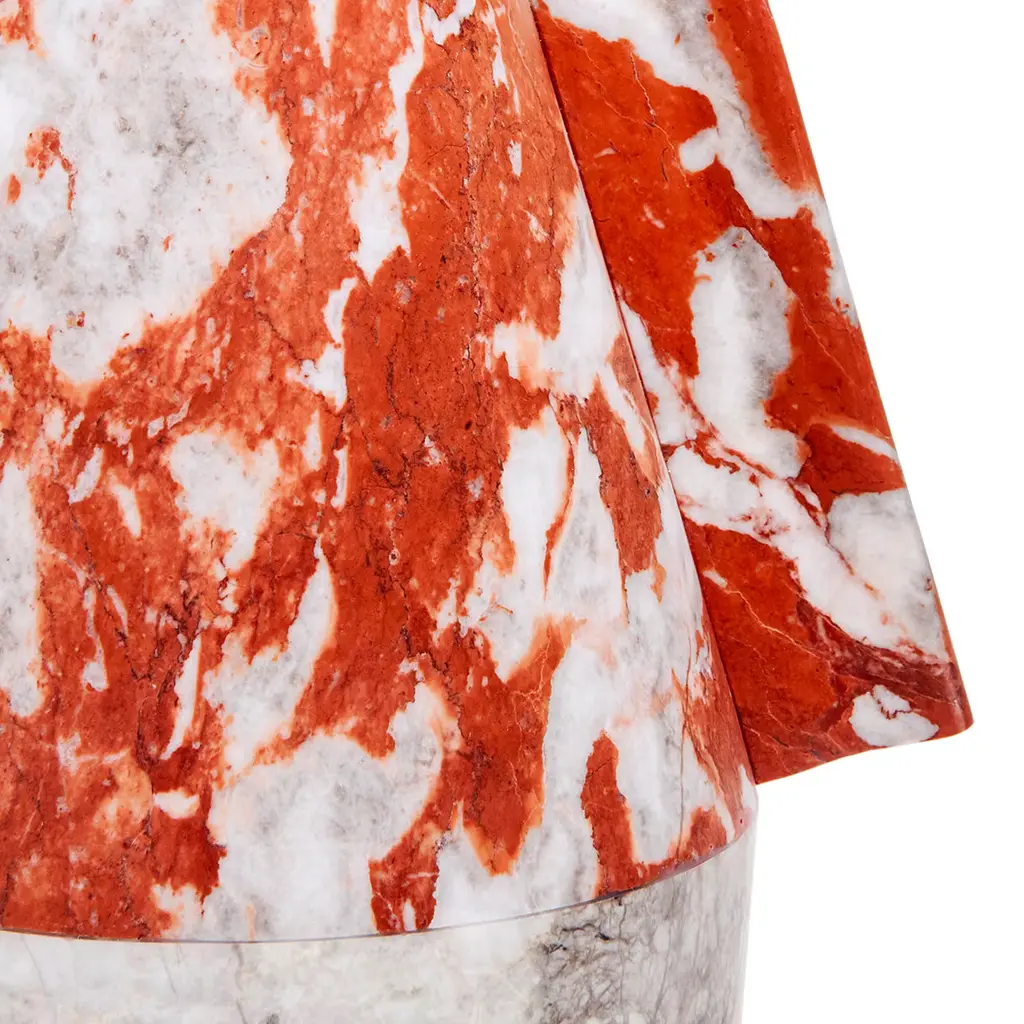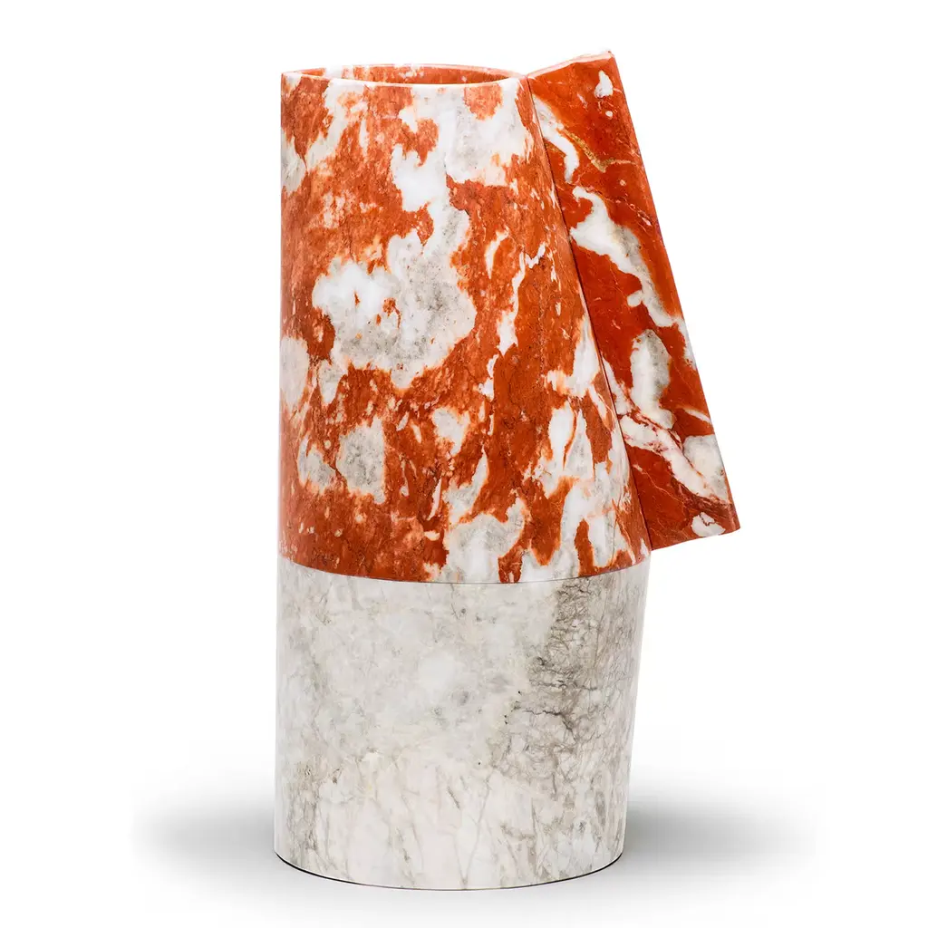 A perfect balance of essential lines and colors, this tall vase was designed by Patricia Urquiola. The distinctive aesthetic balances a cylindrical base and slanted conical top enhancing their geometries in contrasting colors: gray-veined white Carrara Gioia marble for the base and dark veined red Rosso Francia marble for the top.\n