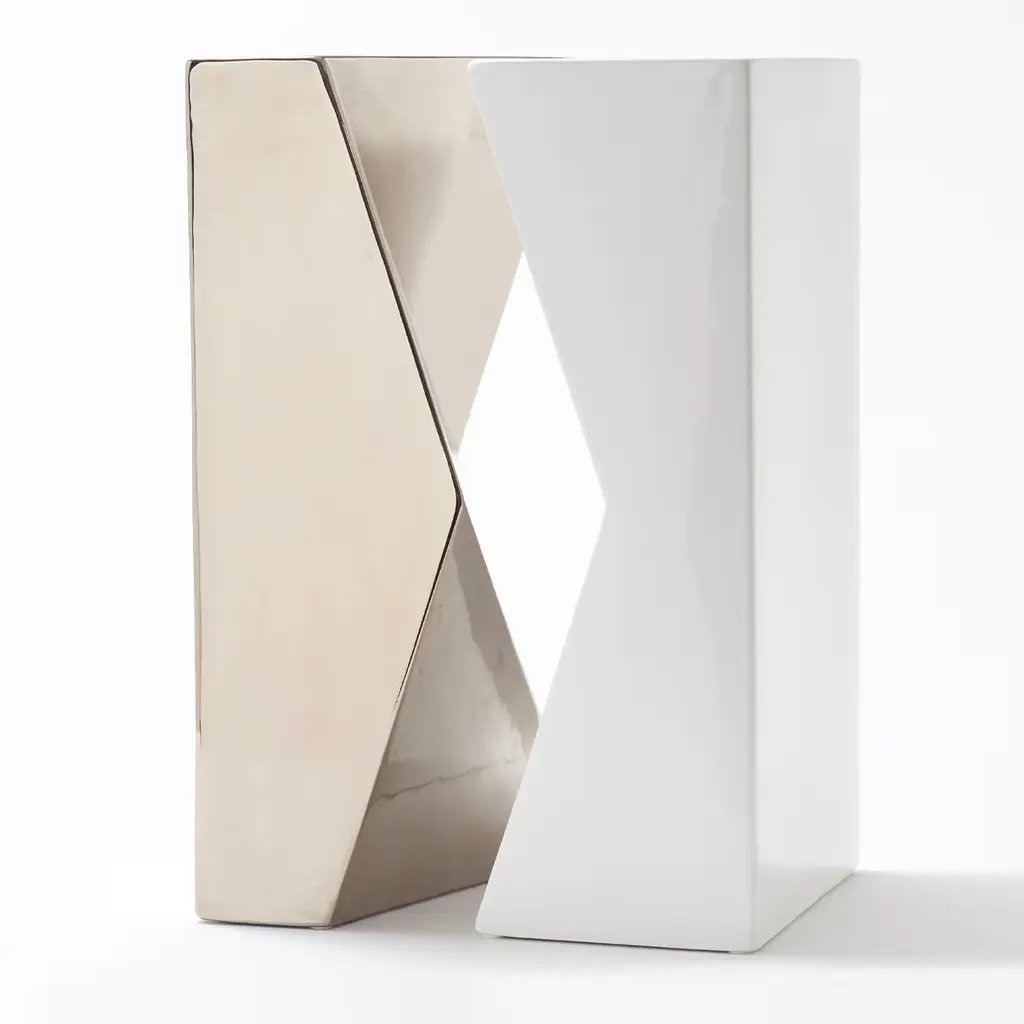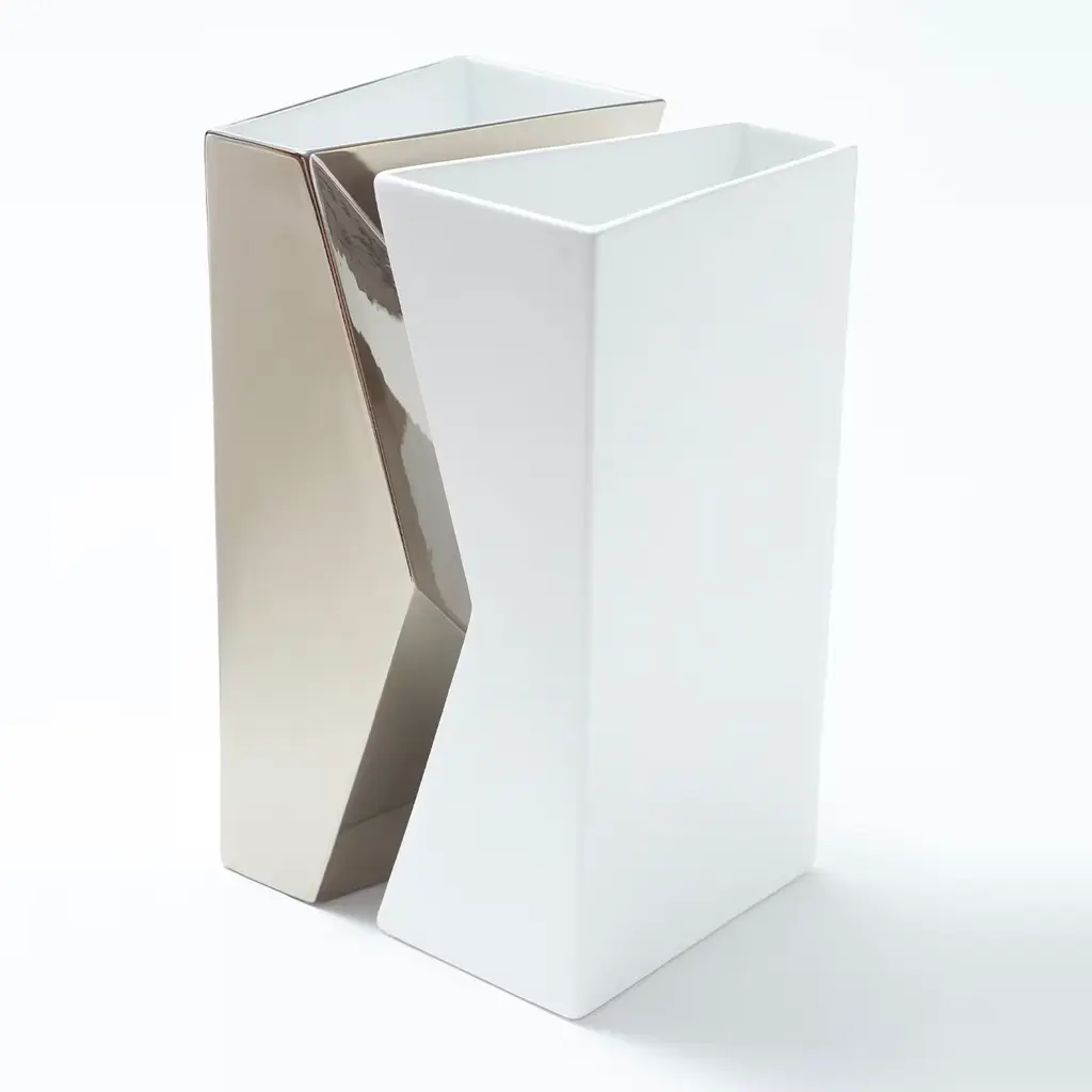 A superlative showcase of traditional craftsmanship that elegantly merges with a fine contemporary aesthetic, this set of two vases is a visually striking and refined design by Antonio Saporito. Deftly handcrafted of ceramic, the set is composed of a platinum-finished vase and a white one, perfectly joinable in their clean and angular lines. A bold and iconic decorative piece for a minimalist, eclectic, or contemporary interior.