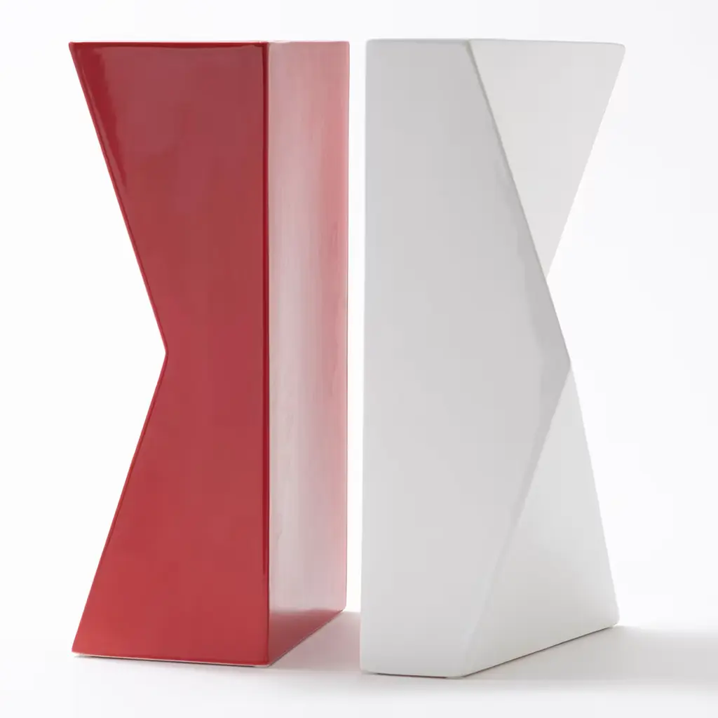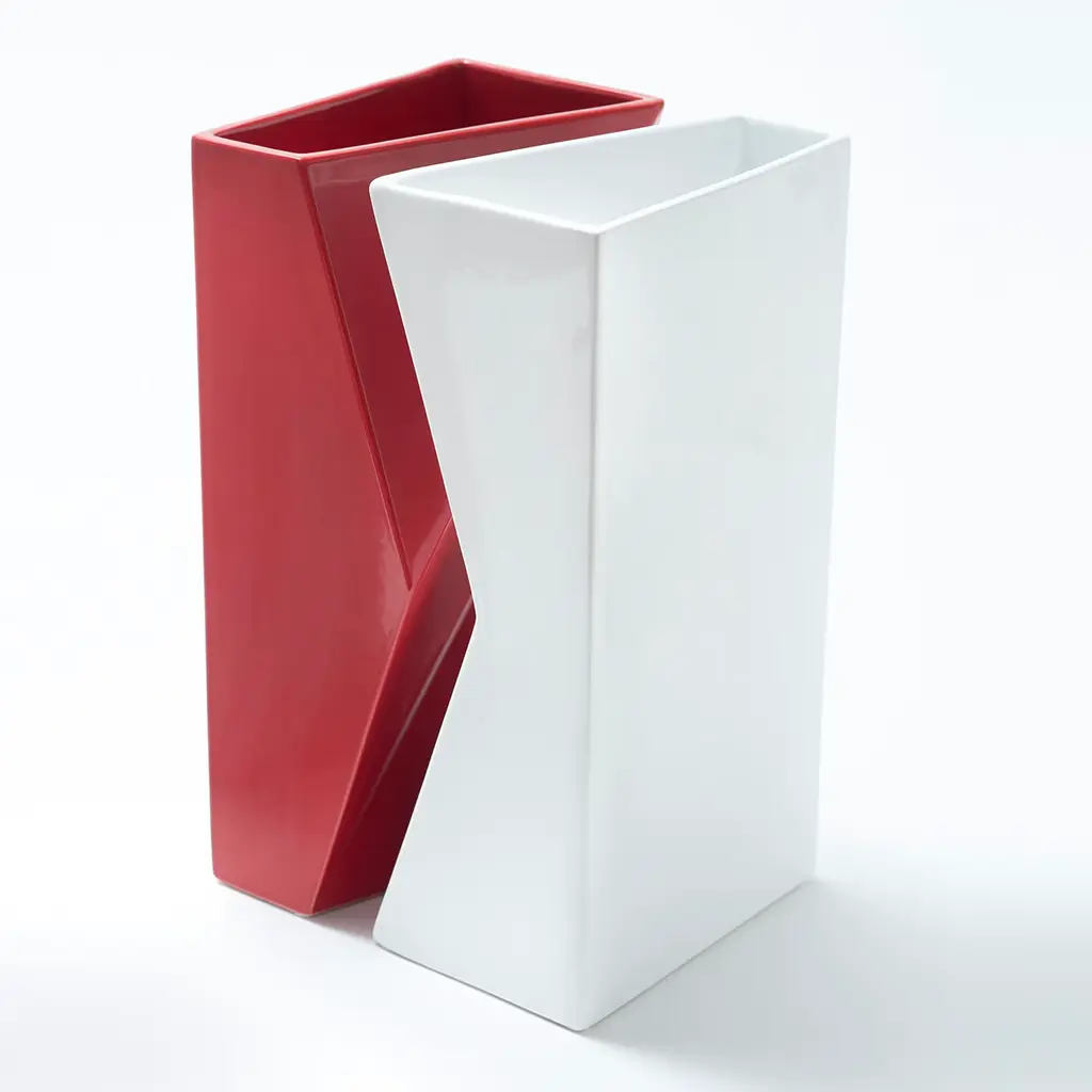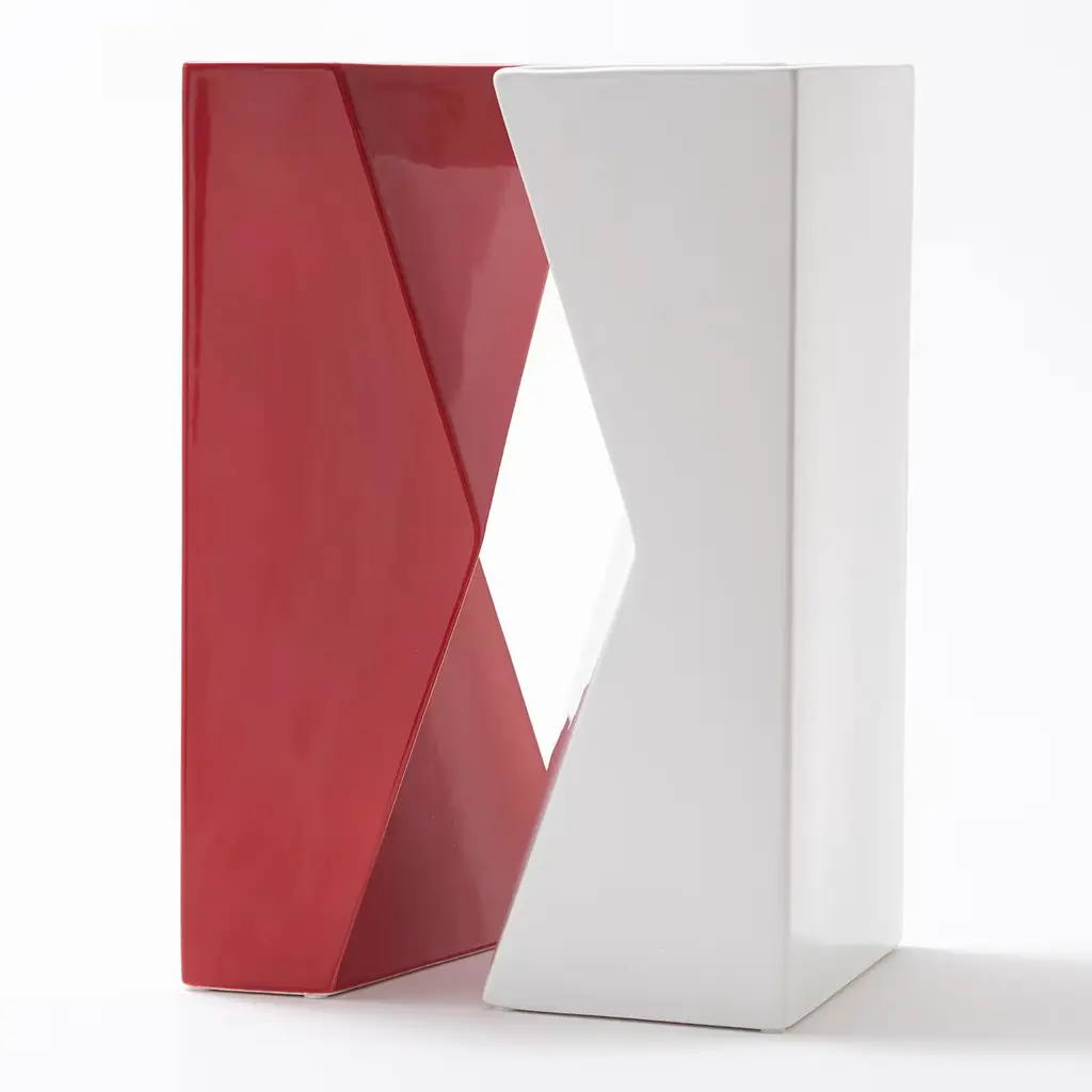 A striking objet d'art of contemporary sophistication, this set of two vases will elevate the look of an interior with its bold and iconic sculptural flair. Designed by Antonio Saporito, it comprises two ceramic vases perfectly joinable in their geometrical shape, inspired by the concept of "direction". Lacquered in a red and a white hue respectively, this set is available in other colors.