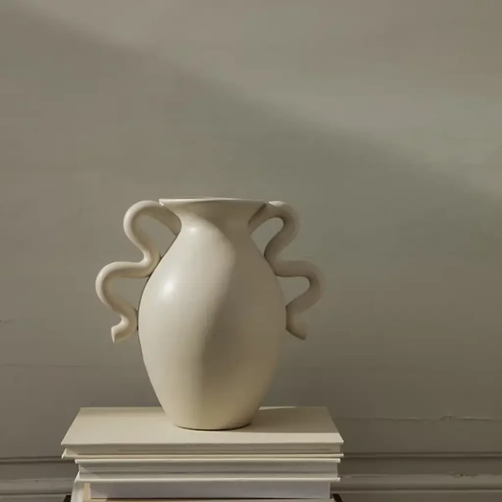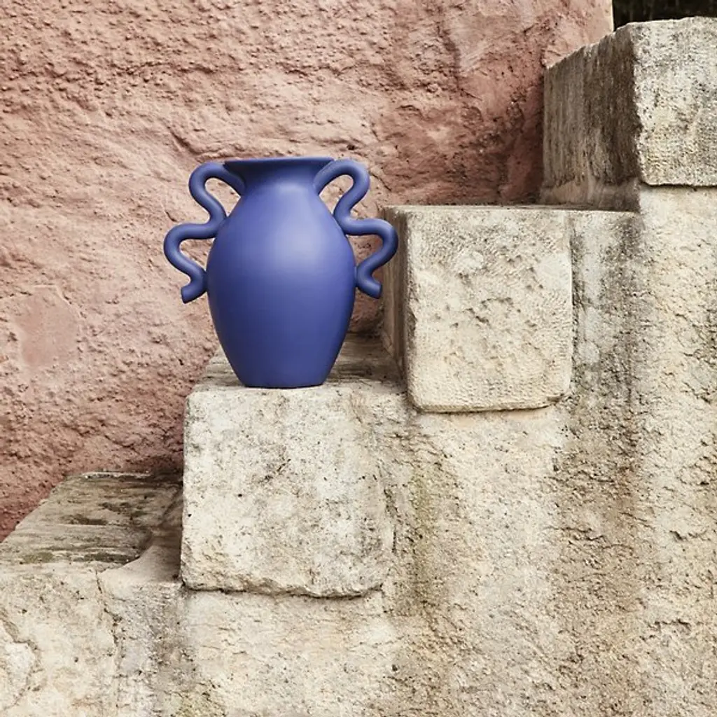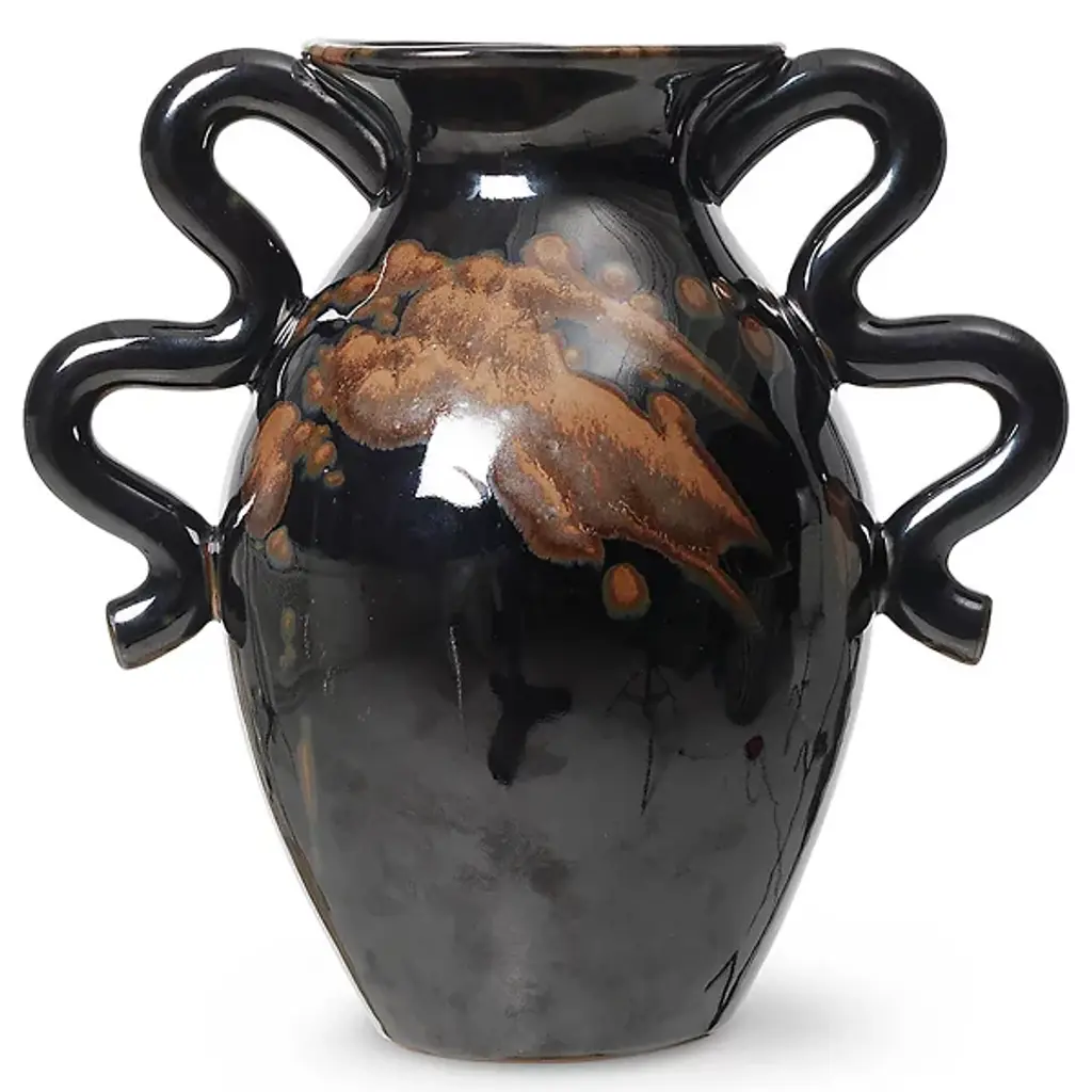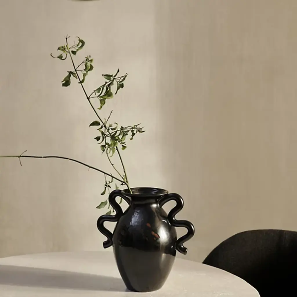 The Verso Table Vase from Ferm LIVING draws inspiration from classic pottery design. Distinctive, artfully arcing handles complement its irregular, curving form. These modern accents infuse a direct, contemporary twist into the vase's otherwise vintage design. Remarkable, whether filled with flowers or displayed on its own as an art piece, it artfully showcases classic and transitional styles, making it a versatile addition to a variety of home decor plans.