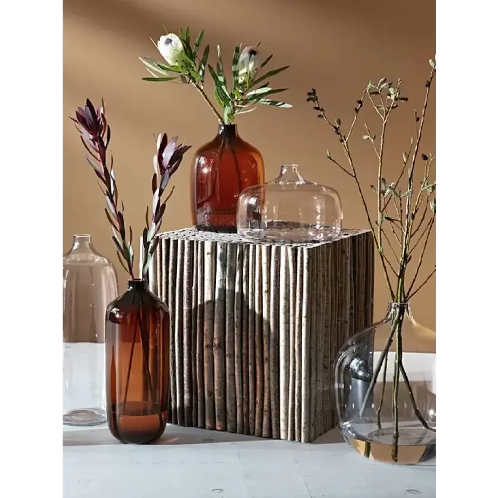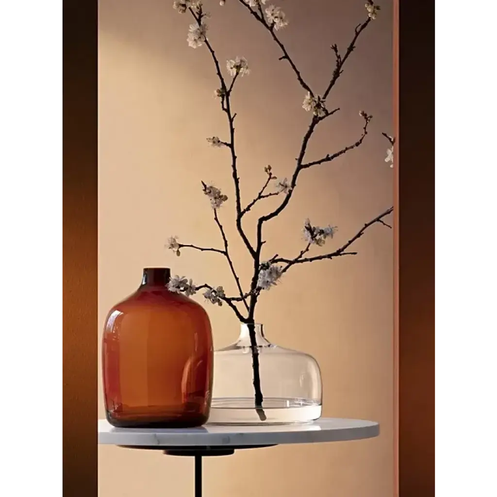 A large organically-shaped vase, mouth blown by master glassblowers from cased-coloured glass. The curved narrow neck is designed to draw a few stems of flowers or foliage together. Mouth-blown glass Organic shape Curved, narrow neck Cased peat brown glass