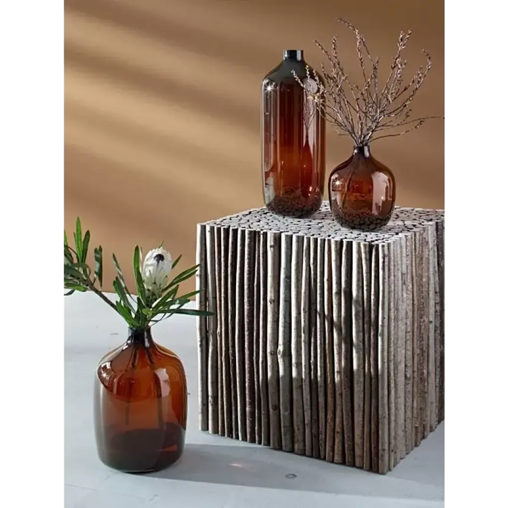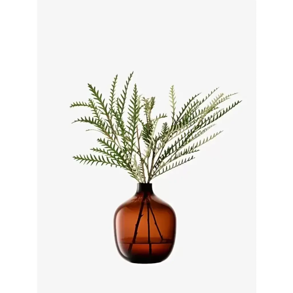 A small organically-shaped vase, mouth blown by master glassblowers from cased-coloured glass. The curved narrow neck is designed to draw a few stems of flowers or foliage together. Mouth-blown glass Organic, gently-tapered shape Curved, narrow neck Cased peat brown glass