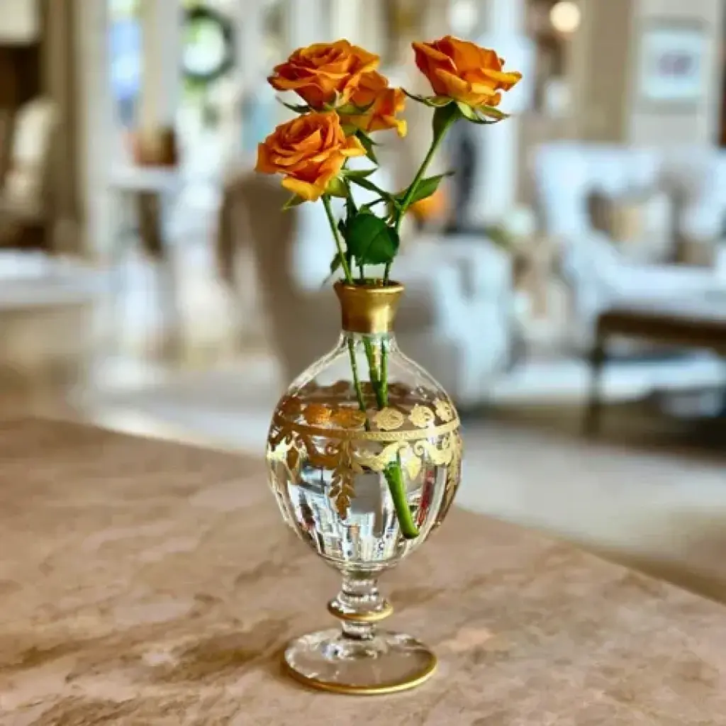 One of our most popular collections, the Vetro Gold Collection is an exquisite enhancement to your decor. Florentine master artisans hand paint 24-karat gold highlights on intricate hand etched designs. The results are nothing short of extraordinary. This bud vase is perfect for adding a touch of beauty any space. Add to a breakfast tray or display on your desk or bedside table. Founded in 1997 by Ann Skidmore, Arte Italica is a story of one woman's passion for Italian history, culture, art, and vintage pewter. Today, Arte Italica is one of the leading importers of European tabletop and home accessories products in the United States. Every piece is handmade and designed so that they can easily be mixed and matched to create a timeless, classic, and effortless look.