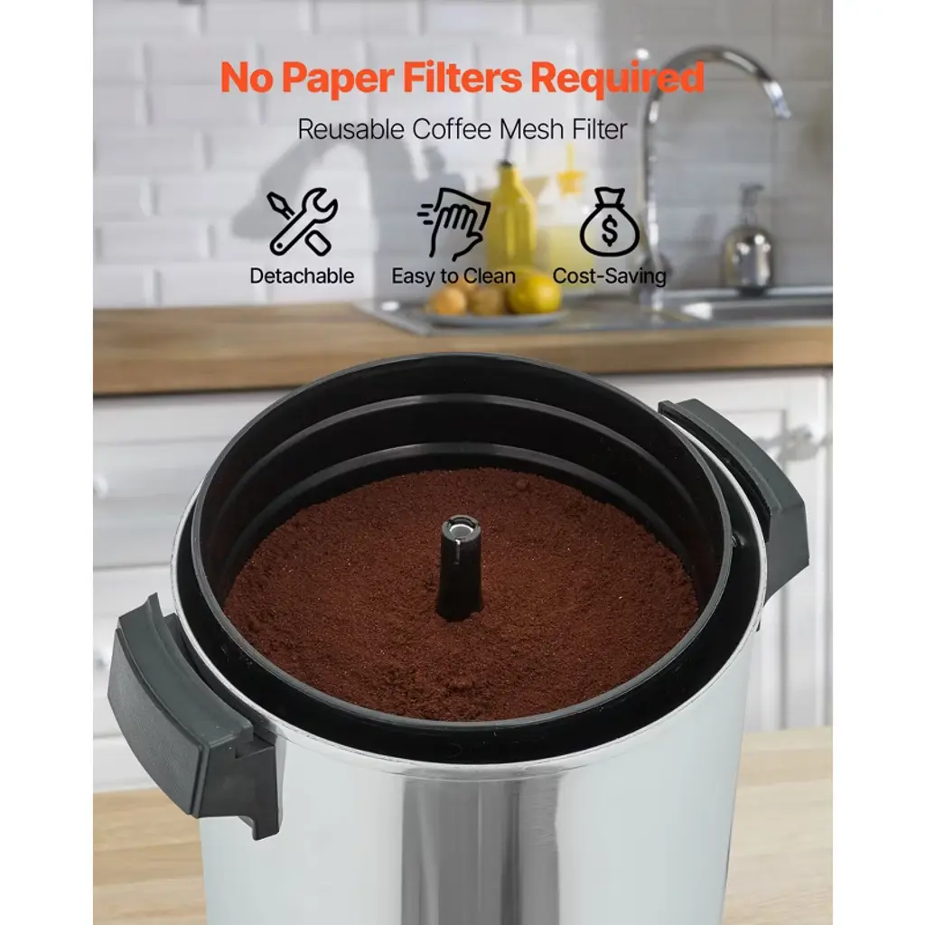 Feature: Efficient Large Capacity Brewing: This commercial coffee urn holds 4.5 L / 152 oz, brewing 30 cups at once. With a 1090W heating tube, it brews a full batch in ≦ 30 minutes, ideal for businesses and gatherings, reducing wait time with a nonstop hot coffee supply Reusable Mesh Filter: The quick brew hot dispenser comes with a removable plastic mesh filter, so there is no need for paper filters. It is easy to wash and cost-saving, making brewing simpler for both new and experienced coffee lovers Long-Lasting Heat Preservation: This large coffee urn maintains 183℉-201℉ / 84℃-94℃ with plug-in heating, locking in the coffee aroma so you always enjoy steaming cups for continuous service Dual No-Drip Spout: The commercial coffee maker features a two-way no-drip spout. Press to fill a cup or lock for steady flow. With fast pouring and a clean stop, it keeps the serving area neat and efficient during busy hours Secure and Durable Design: Made from premium aluminum alloy, this coffee dispenser is rustproof, corrosion-resistant, and heat-safe. It features anti-dry burn, insulated handles, and a sturdy design for secure, convenient, long-lasting use Package Content: 1 x Commercial Coffee Urn 1 x Filter Basket 1 x Air Tube