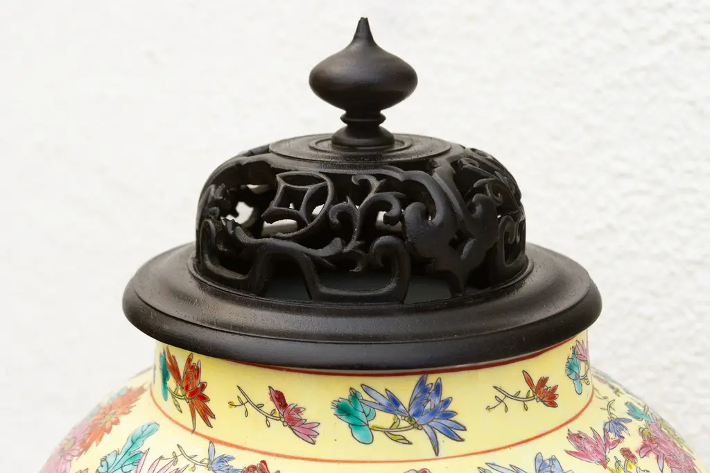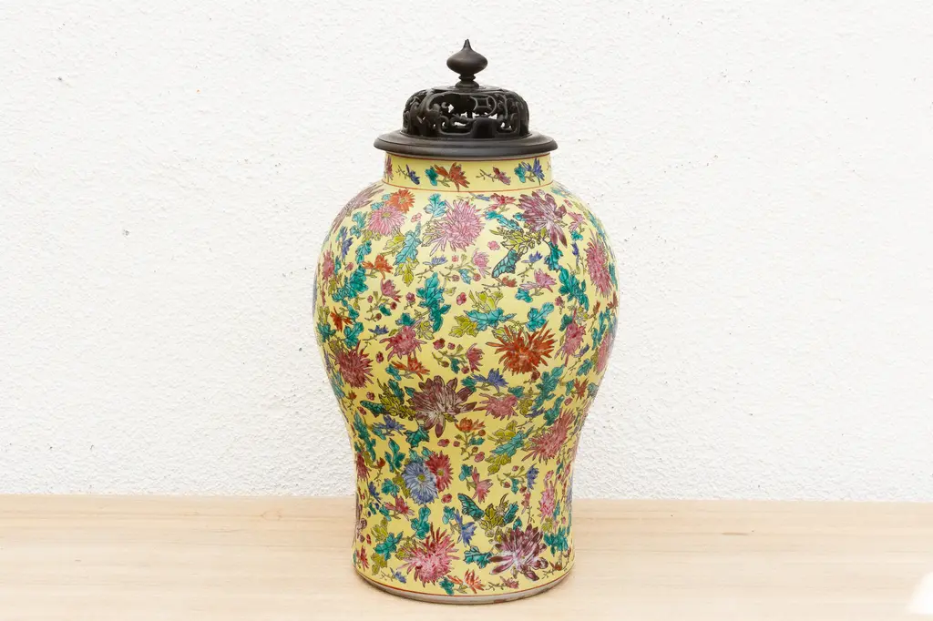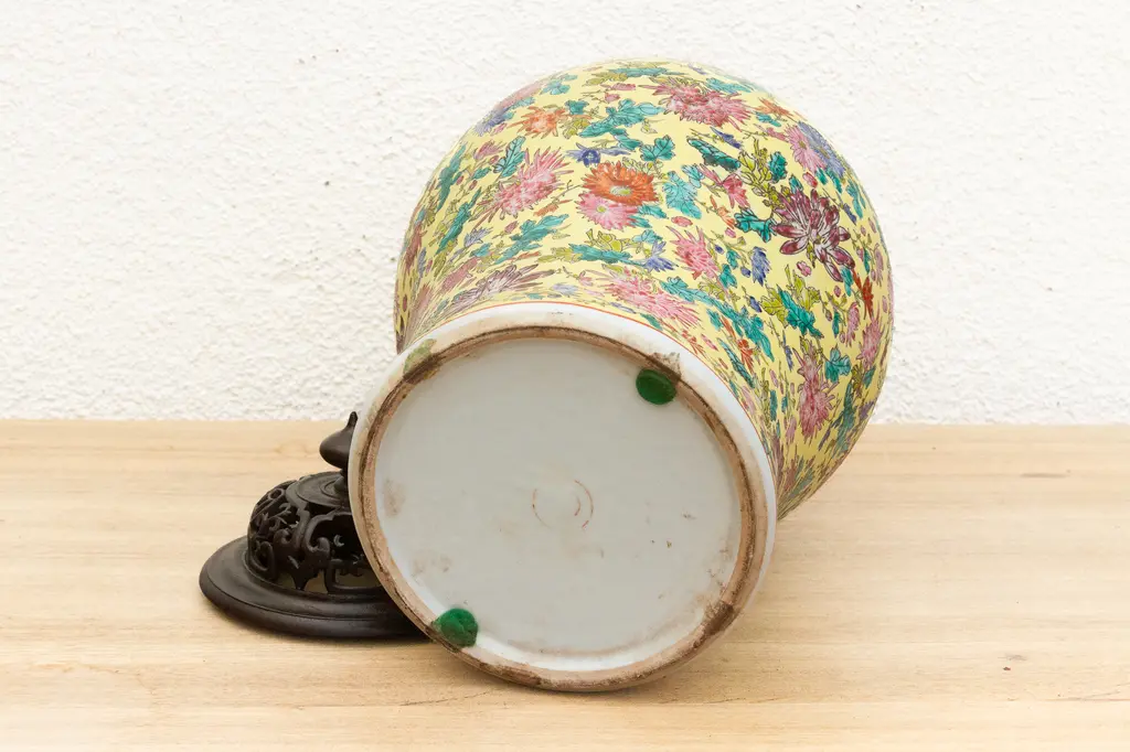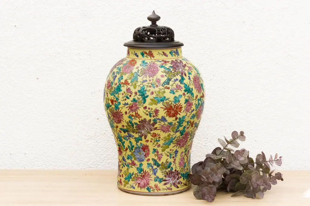 Stunning tall Famille Rose Chinese porcelain ginger jar with a fitted lid. This impressive piece measures approximately 17 inches in diameter at its widest point and stands a substantial 20 inches high. The vibrant hand-painted floral decorations are executed in the Famille Rose style, a term referring to a palette of enamel colors introduced to Chinese porcelain during the Qing Dynasty. This palette is characterized by its soft, opaque hues.