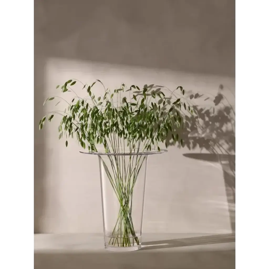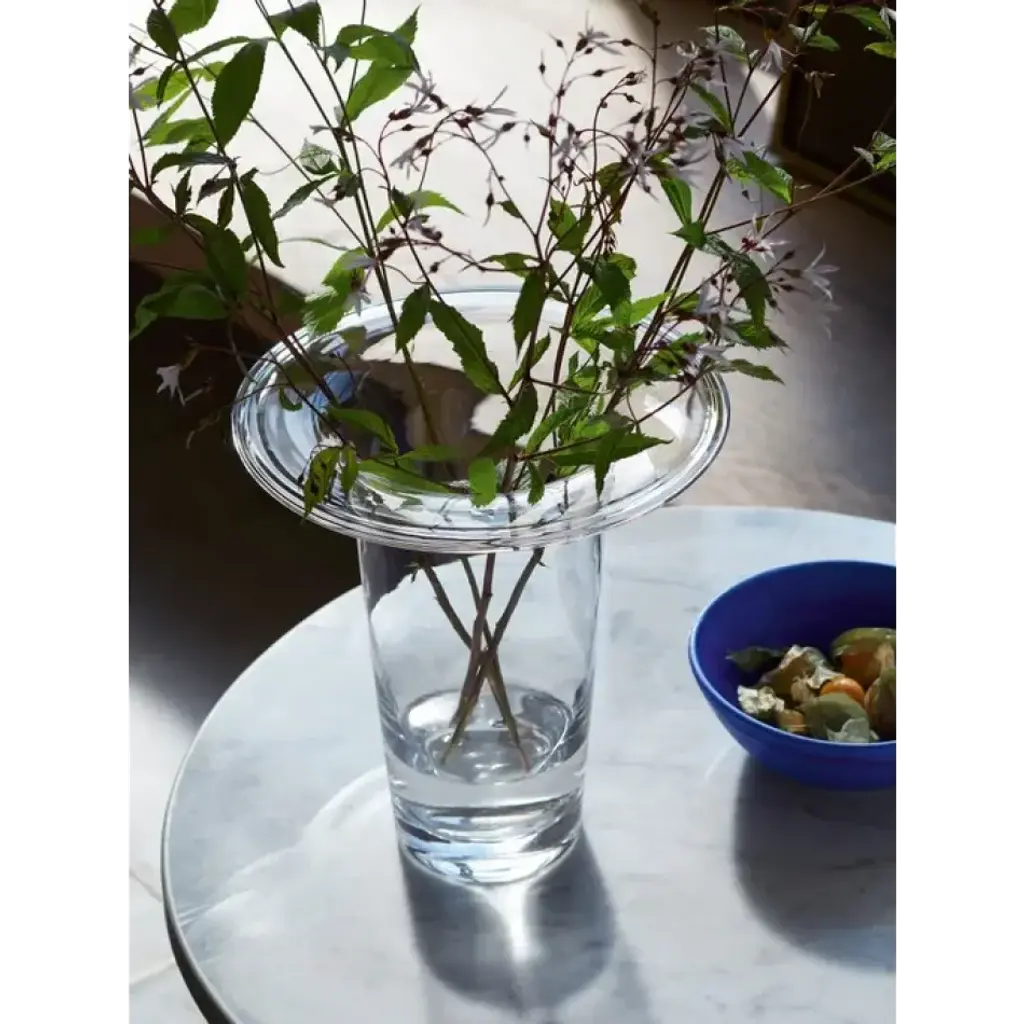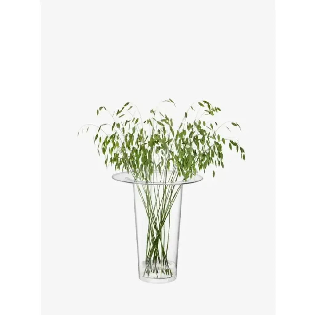 A large mouth-blown vase with thick walls that fold outwards at the top into a wide and flat brim. Designed for centrepiece displays and statement flower arrangements. A versatile and contemporary design in tribute to Victoria's creativity and partnership with LSA. For each Victoria vase sold, LSA will donate to Sarcoma UK in her memory.
