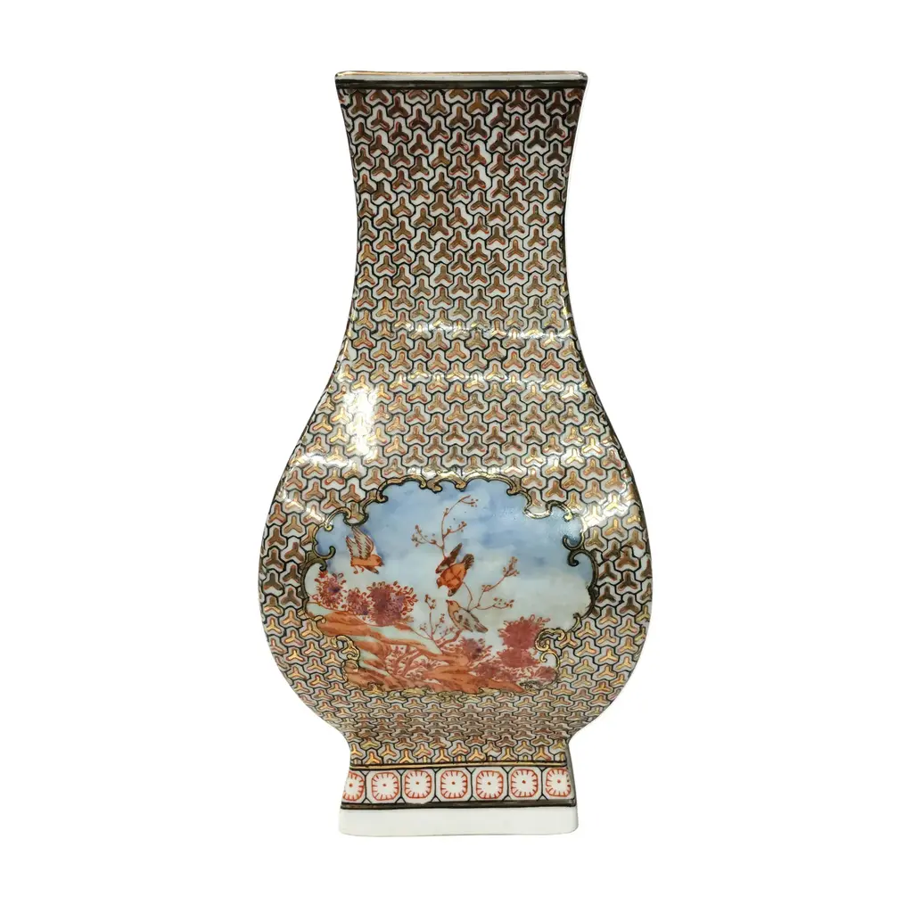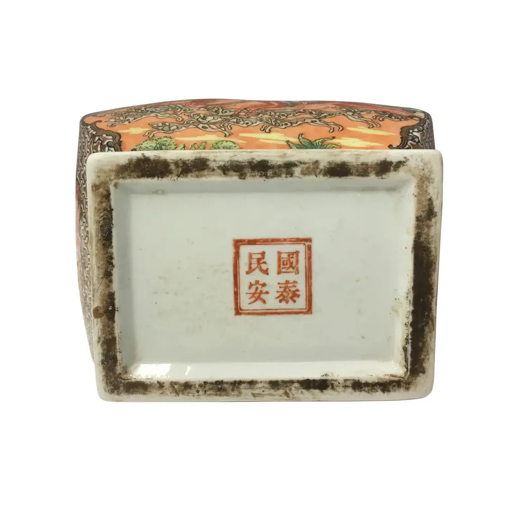 Chinese export to Europe, Vintage style porcelain rectangular flask shape vase with under glaze and outside decoration depicting hunters in forest. Hunt scene with horses, hunters, dogs etc.