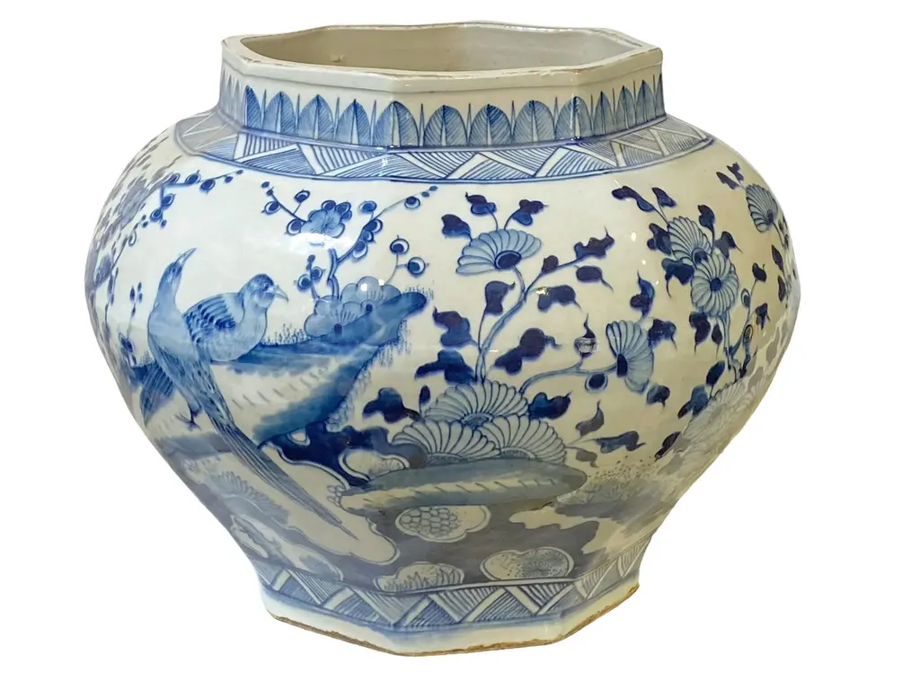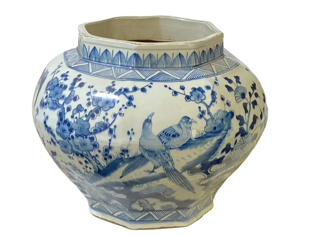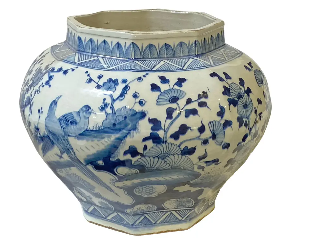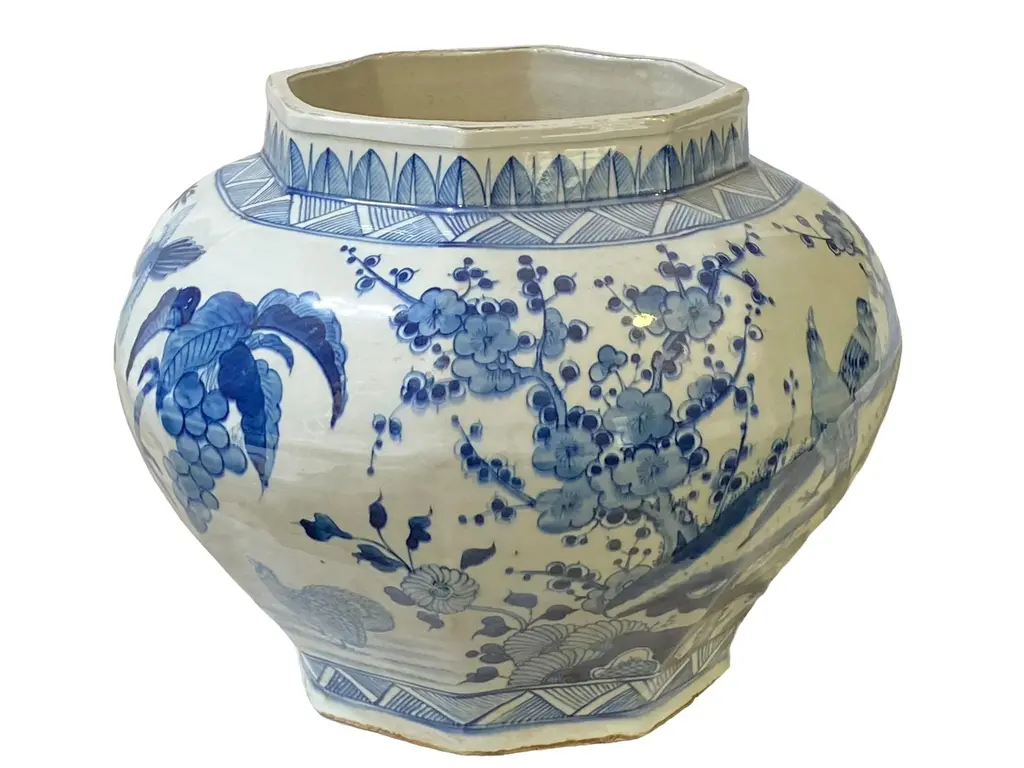 Superb vintage Ming dynasty style chinoiserie Blue and White Vase decorated with peach blossoms ,birds ,lotus etc... ..14" diameter by 11" H .Unsigned.the peach tree blossoms during spring and is considered the ideal season for young couples to marry. and symbolizes a long and healthy life.