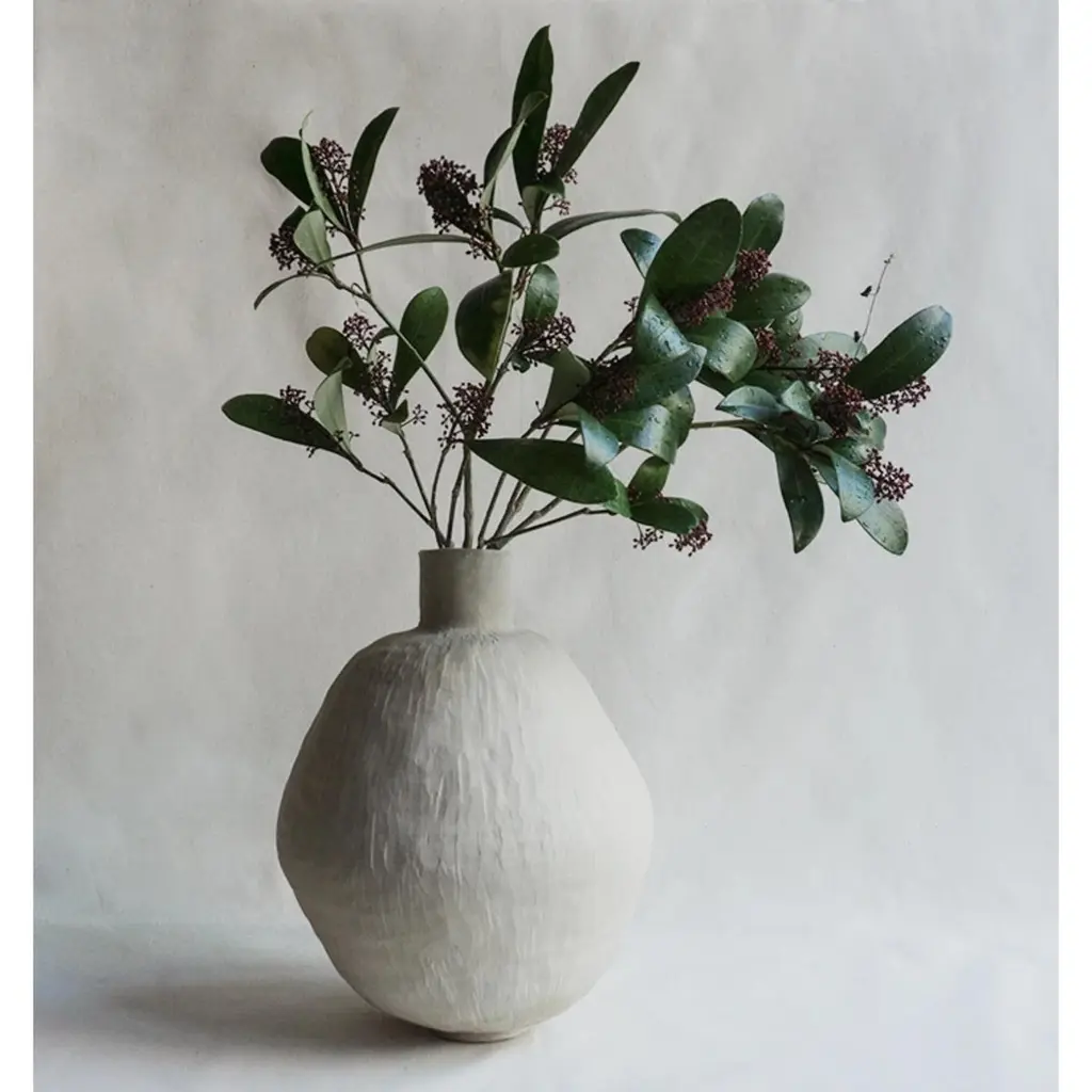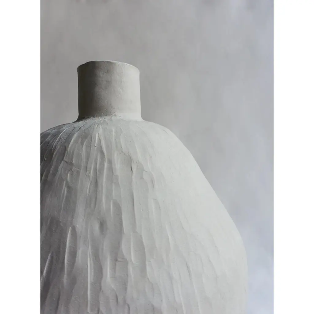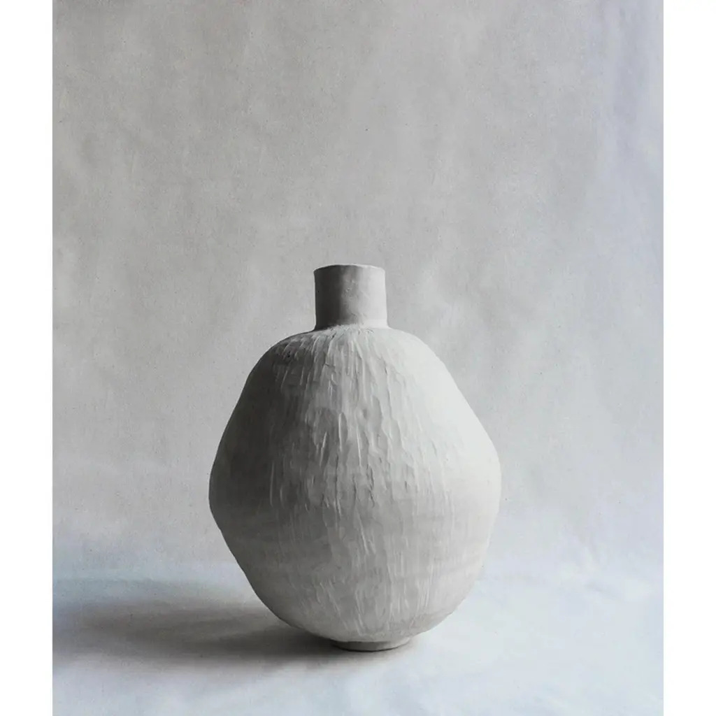 Viola Alba vase by Cosmin FloreaUnique pieceDimensions: D 26 x H 32 cmMaterials: StonewareInspired by my love for pristine nature, this sculptural vase channels the shape of a dove.Handcrafted in white stoneware, the Dove vase can be used as a decorative piece on its own or can graciously hold ever-changing floral arrangements.Glazed only inside to make it watertight, the exterior remains natural, complimenting the light texture.Please note that this item is handmade and therefore unique; variations are to be expected.Cosmin Florea is a Romanian acclaimed set designer, interior designer and ceramist. Since 2019 he is working between Brussels and Bucharest.He collaborates with some of the most prominent theaters in Romania and renowned stage directors in Europe. In 2019, he was nominated for best scenography at the Uniter Awards with “Forest of the hanged”, directed by Radu Afrim. Cosmin has also a background in fashion, working for several years as a stylist at Harper’s BAZAAR Romania. He has been involved in various commercial projects with brands like Chanel and H&M.A few years ago he rediscovered the beauty of the Romanian villages and their rich heritage in arts and crafts.Researching such traditions he met several amazing artisans using techniques for hand-woven carpets recognized in the UNESCO Representative List of the Intangible Cultural Heritage of Humanity.Combining his artistic sensibility and aesthetics and their skills an ethical collaboration started with a first collection of handcrafted rugs.A second encounter turned into another love at first sight – handmade ceramics from Transylvania. It also proved to be the perfect trigger for Cosmin Florea to start his own line of ceramics.