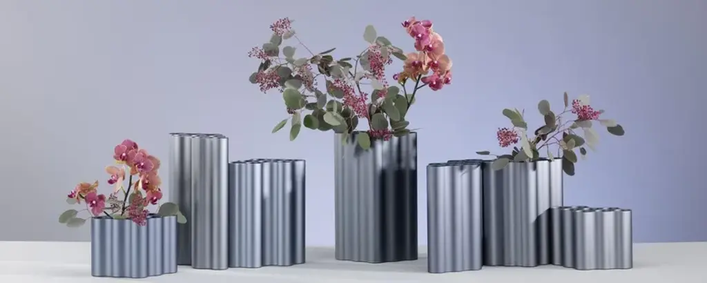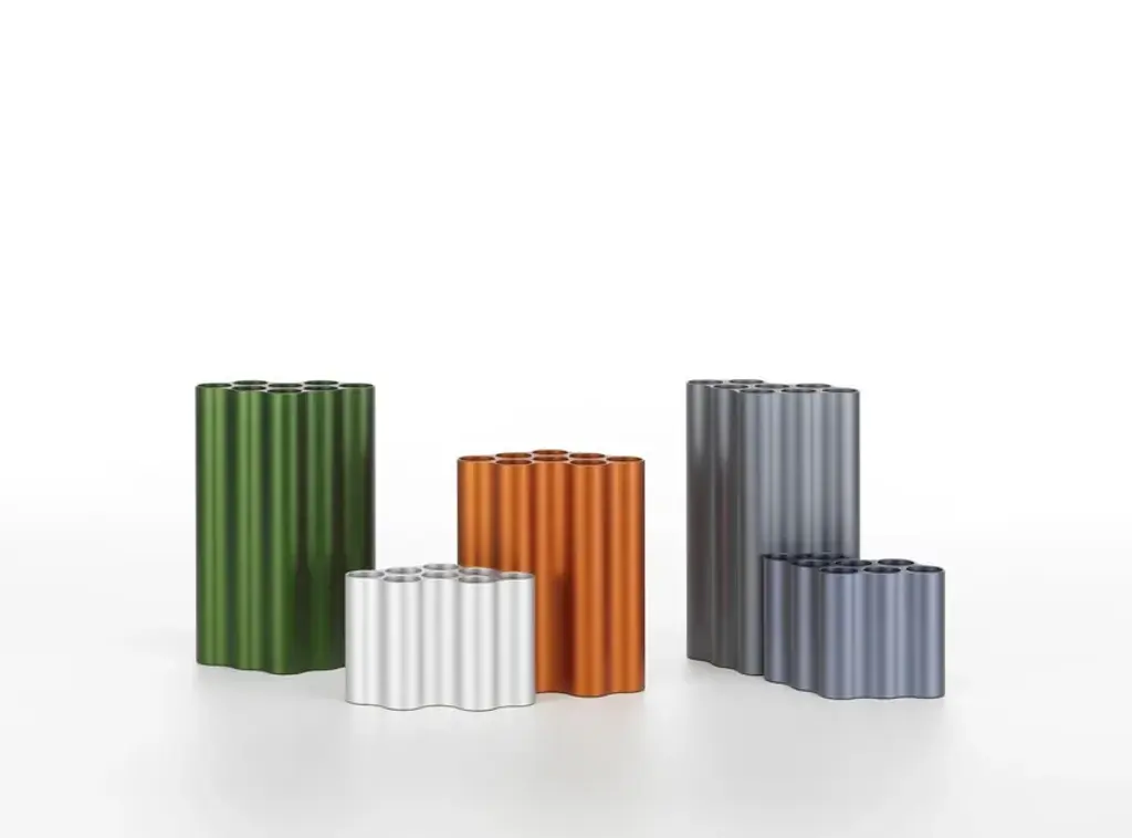 The shape of the Nuage vases made its first appearance in the oeuvre of Ronan and Erwan Bouroullec in 2002. Reminiscent of a cloud, the motif was originally produced as a plastic shelf module that can be grouped into clusters or largescale configurations. Eight tubular cavities pierce the flat surfaces of the modular element while also defining the form‘s outer contours. Over the years, the Bouroullec brothers have varied this shape and repeatedly incorporated it in their graphic work.For the Nuage vase, the designers executed the cloud motif in varying lengths. The cavities in the basic form are now positioned upright, dividing the vase into eight tubes that can be used for the artful arrangement of flowers and grasses.The undulating surfaces produce an attractive interplay of light and shadow, and individual vases can be assembled into entire ‚cloud formations‘.Steel blue color