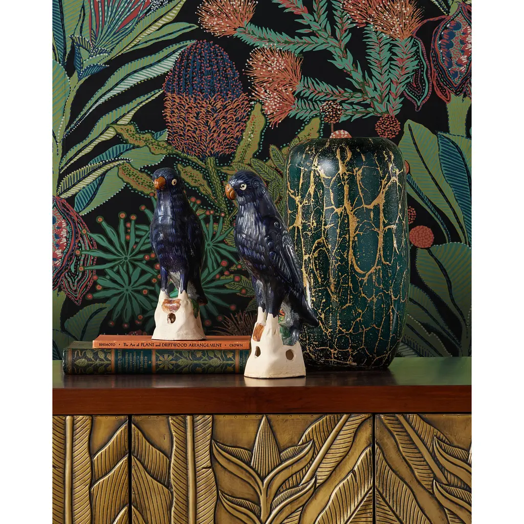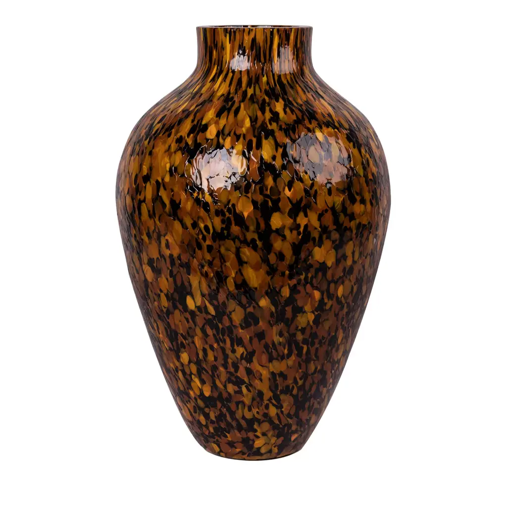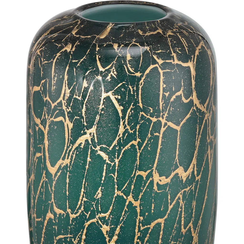 The Vitry Green and Gold Vase is crafted using the traditional Venetian method of mouthblown glass during which a white glass interior is covered with a dark teal layer on the exterior. The rounded silhouette is finished with organic swirls of metallic gold, flowing artfully across the deep green surface. Each piece is unique, as the gold detailing that adds a sense of movement and artistry was hand-applied.