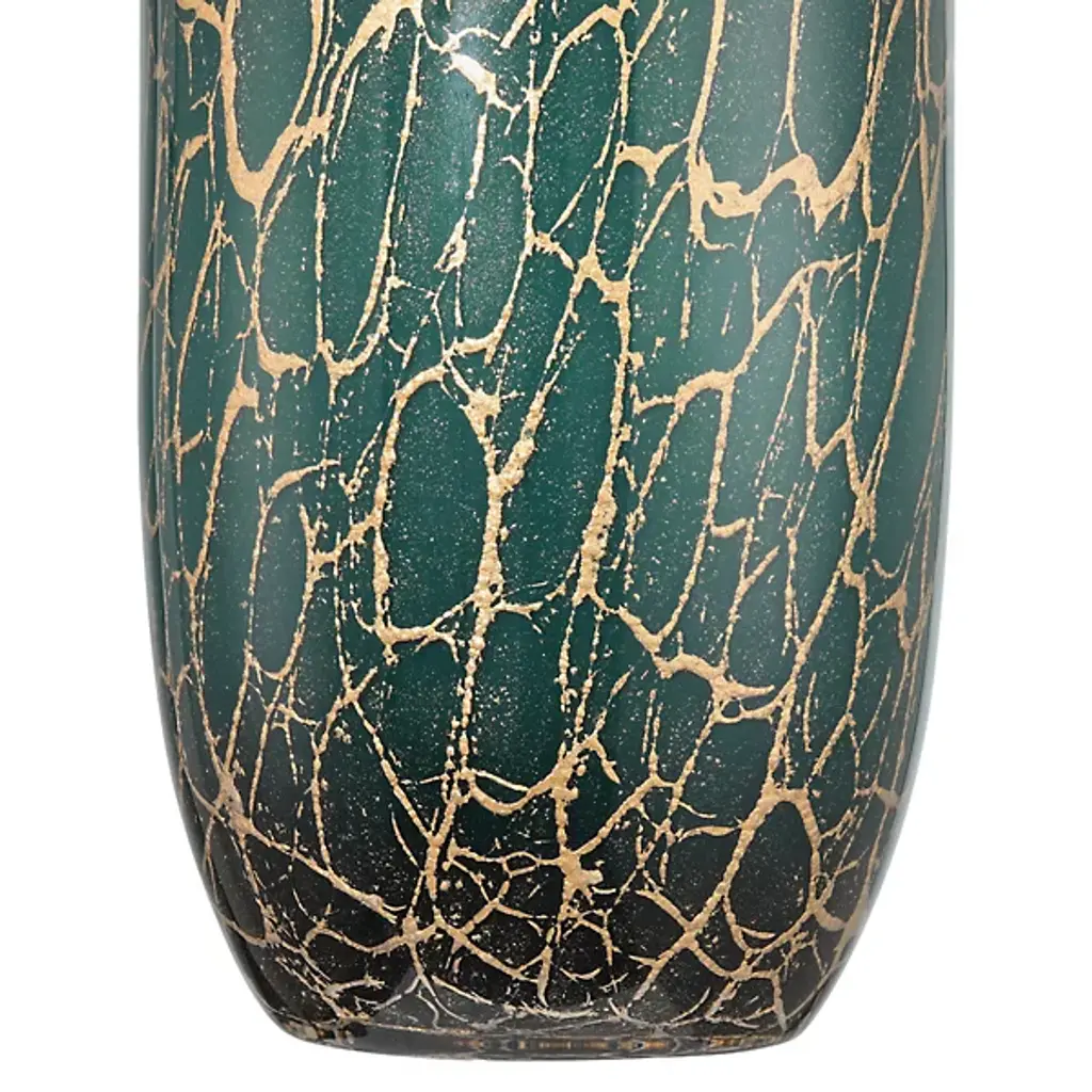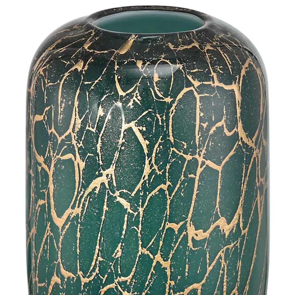 The Vitry Vase from Currey & Company employs traditional Venetian mouthblown glass methods where the interior glass receives an exterior layer through skilled artisanal techniques. The rounded silhouette is finished with organic metallic swirls that flow artfully across the surface. Each piece displays unique characteristics since the detailing is hand-applied, ensuring no two vases are identical.