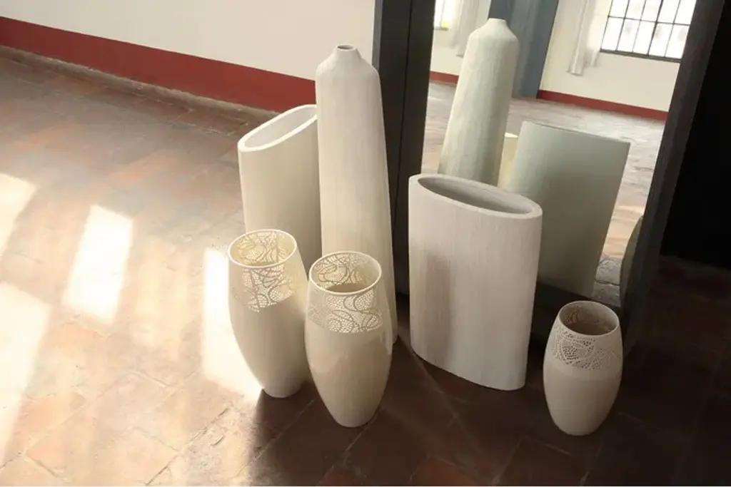 Fine white porcelain vase with handcrafted tracery decoration. The transparent enamel application gives the lower part of the vase a brilliant appereance to contrast with the tracery that remains opaque. The inside of the vases is enamelled so as to be water-proof.Two heights available.
