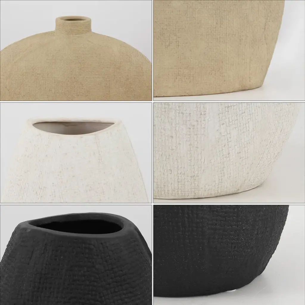 Add a touch of vintage charm to your home with the Voltaire Ceramic Vase Set, available in antique green and black. Constructed from ceramic, this triad of vases boast a textured finish, providing visual interest to any room. The large sandy flat vase offers an earthy base, the white vase is distinctive with its elongated body, while the black piece presents a classic silhouette, contributing various styles to your decor. Embrace rustic elegance and bring a hint of nature indoors with these antique-inspired ceramic vases.
