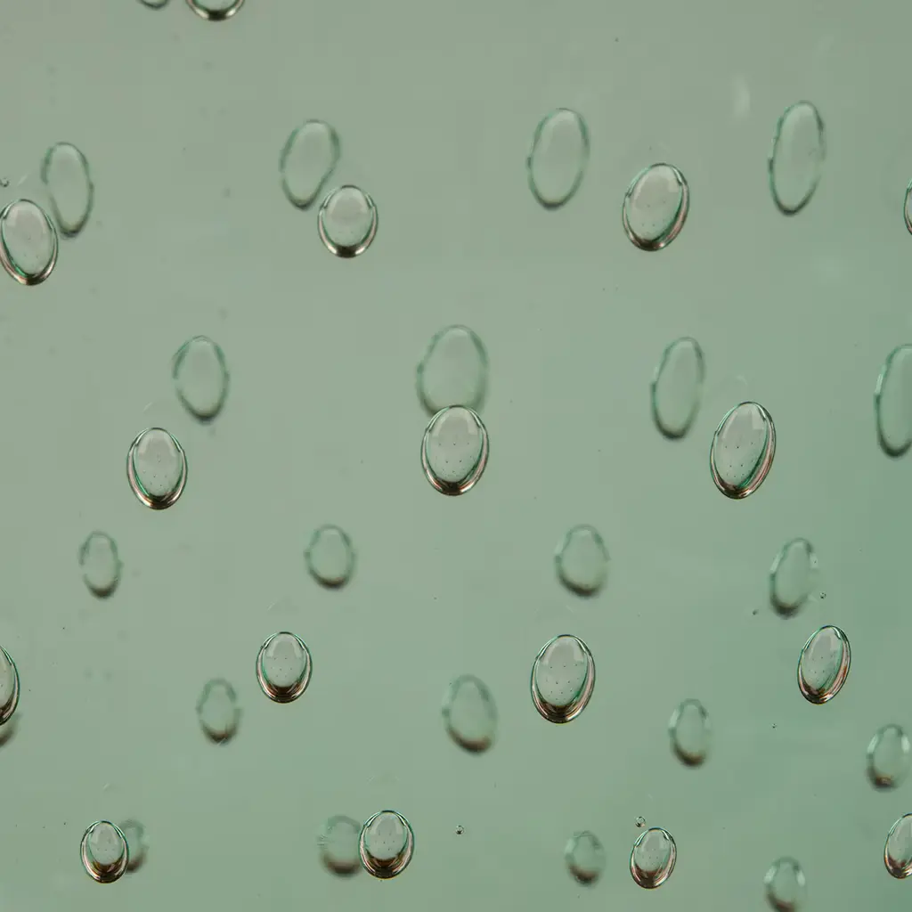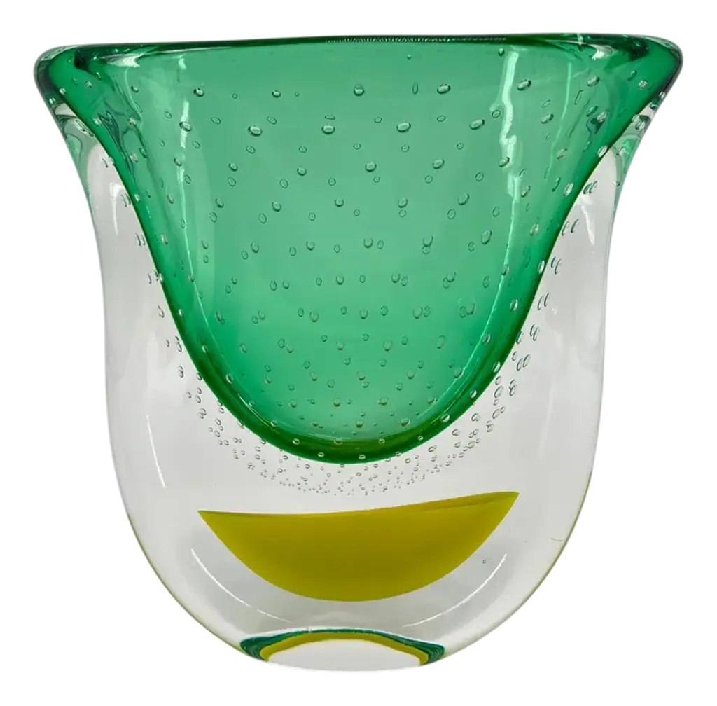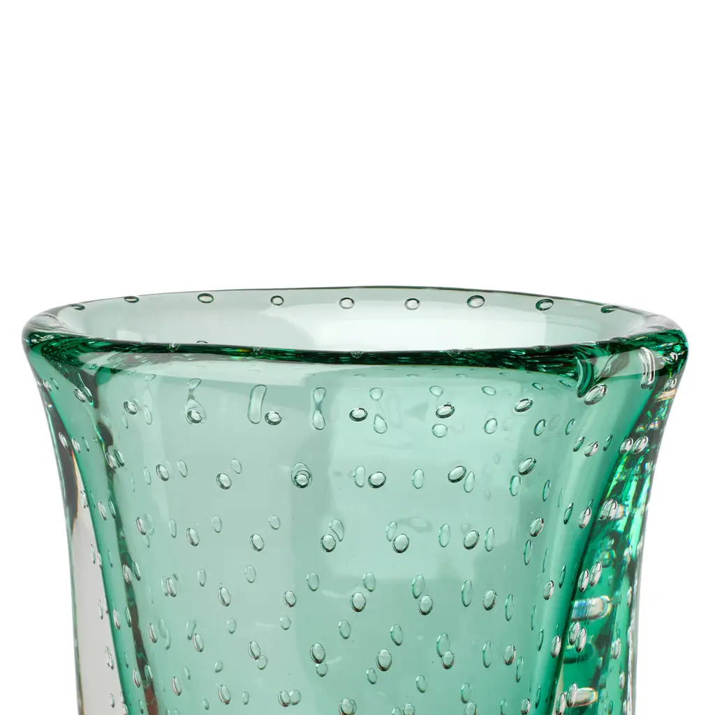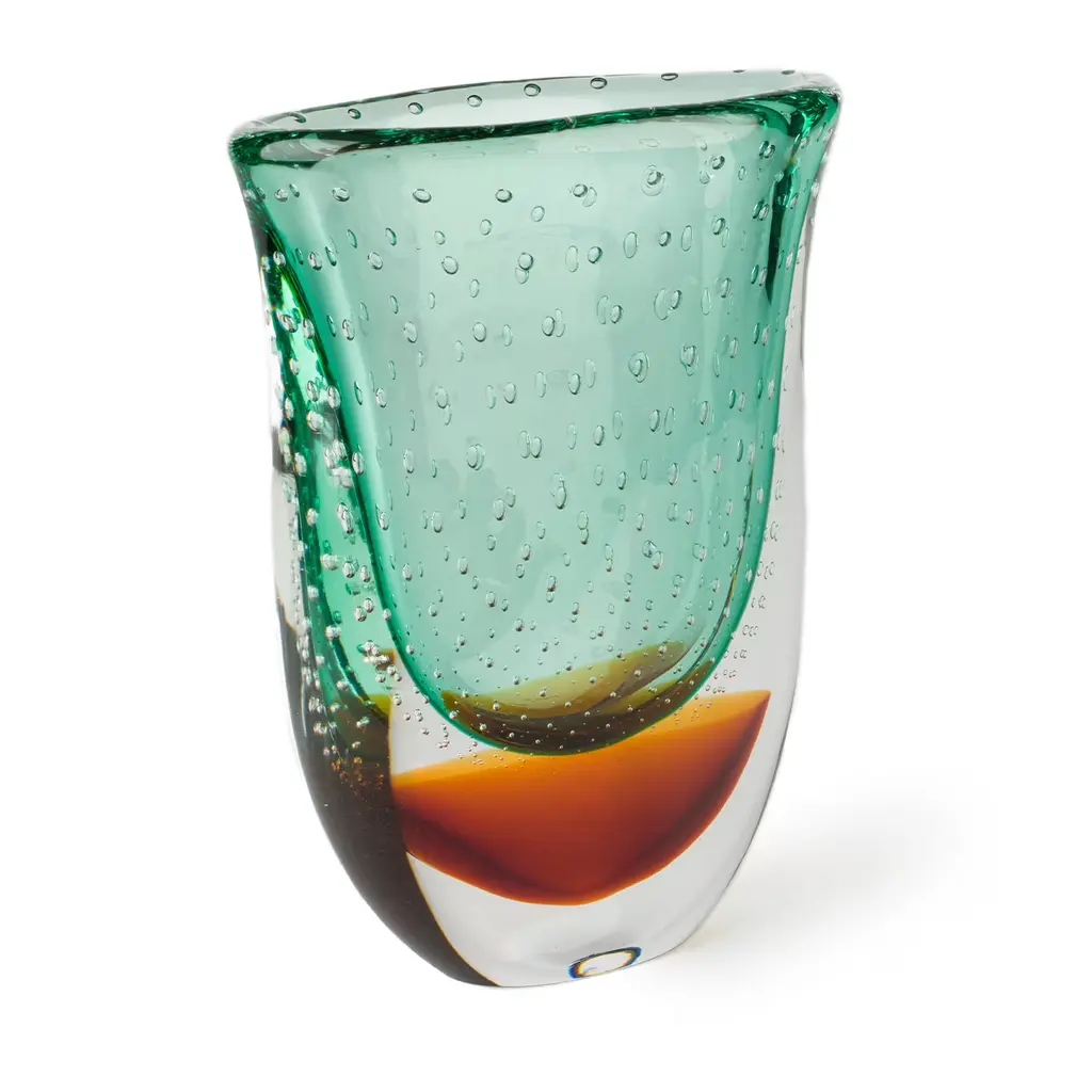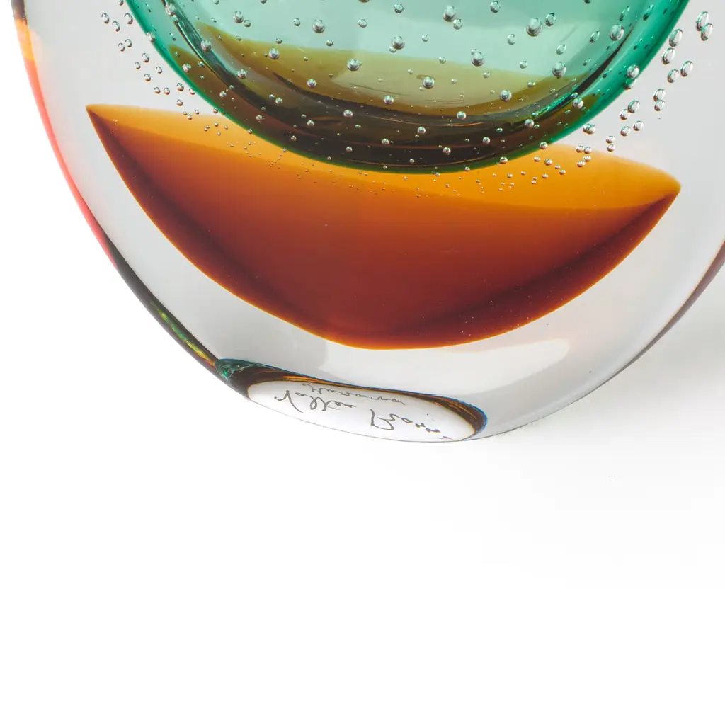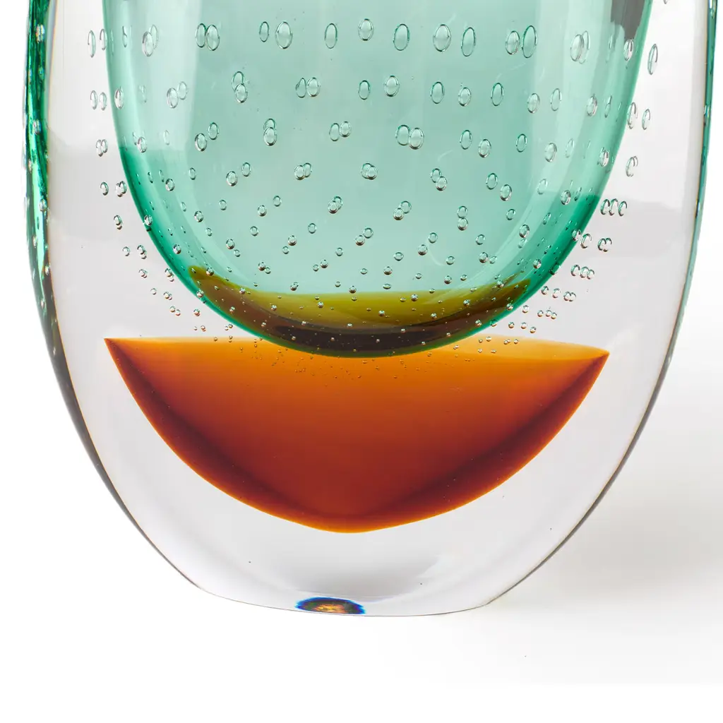 The incorporation of glass volumes in different colors and designs within a thick body in clear glass is possible with the "sommerso" technique, a traditional method employed for the deft crafting of this precious vase in polychrome Murano glass. A seemingly floating, amber-toned glass mass features a drop-like element in turquoise glass placed above, enveloped by a mantle of air bubbles trapped within the glass.