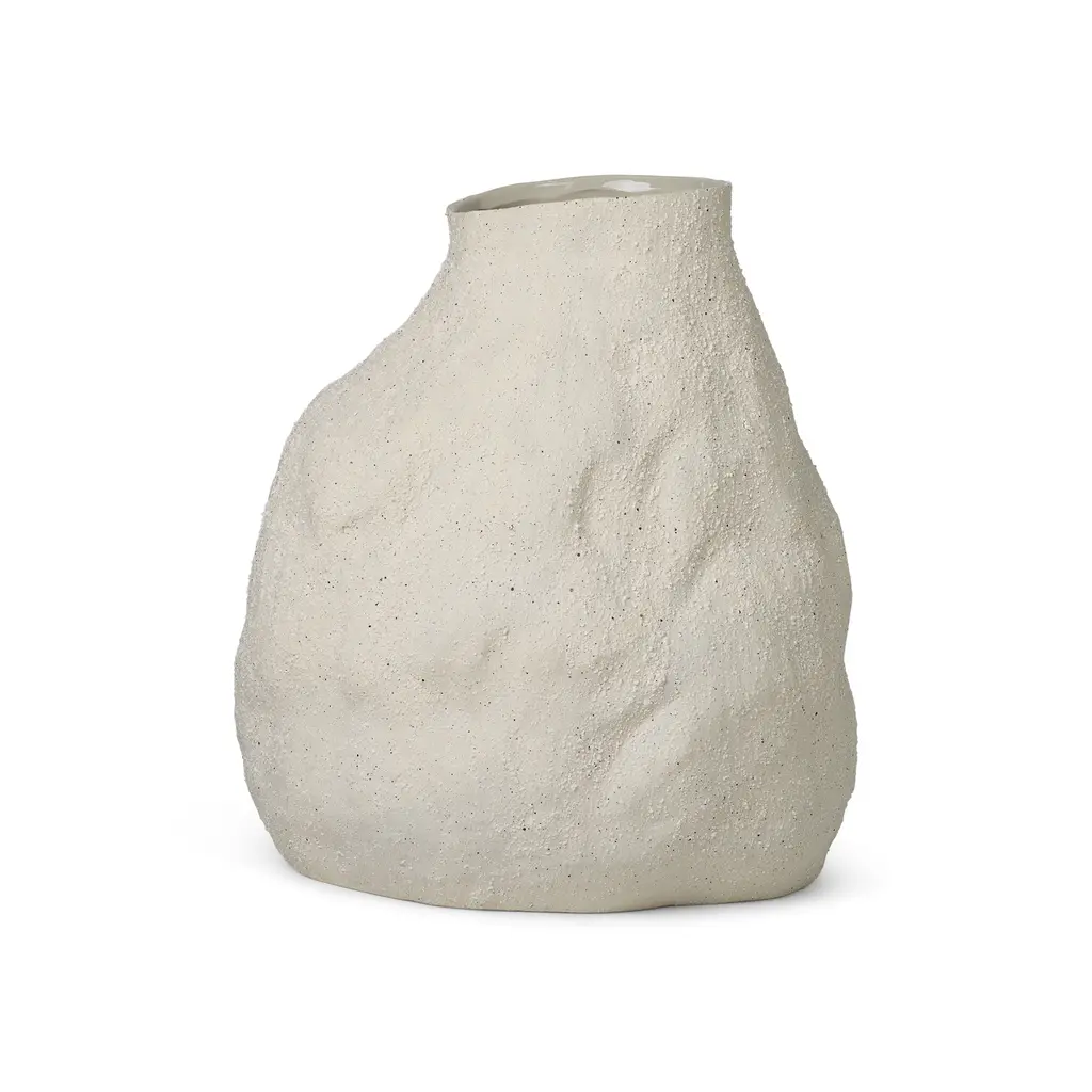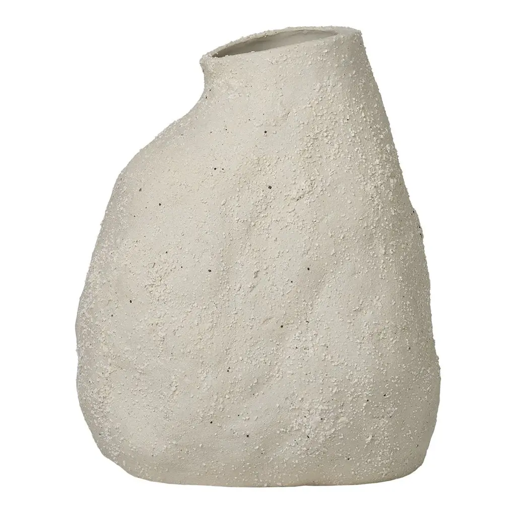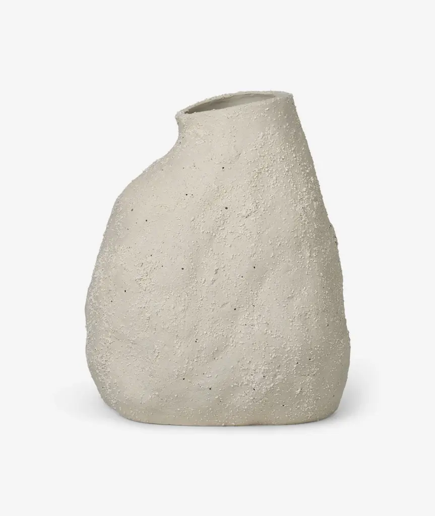 With its fluid form and textured surface evoking volcanic rock, the Vulca Vase from Ferm Living is an eye-catching addition to your stylish home. An off-white stony glaze highlights the distinctive tiny grains in the stoneware for a truly sophisticated look, perfect for displaying your favorite flowers or as a stunning statement piece on its own. Highlights