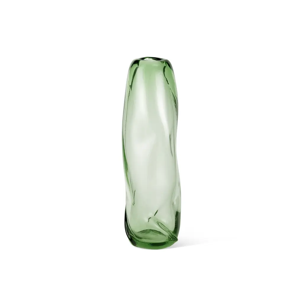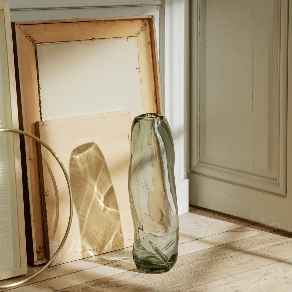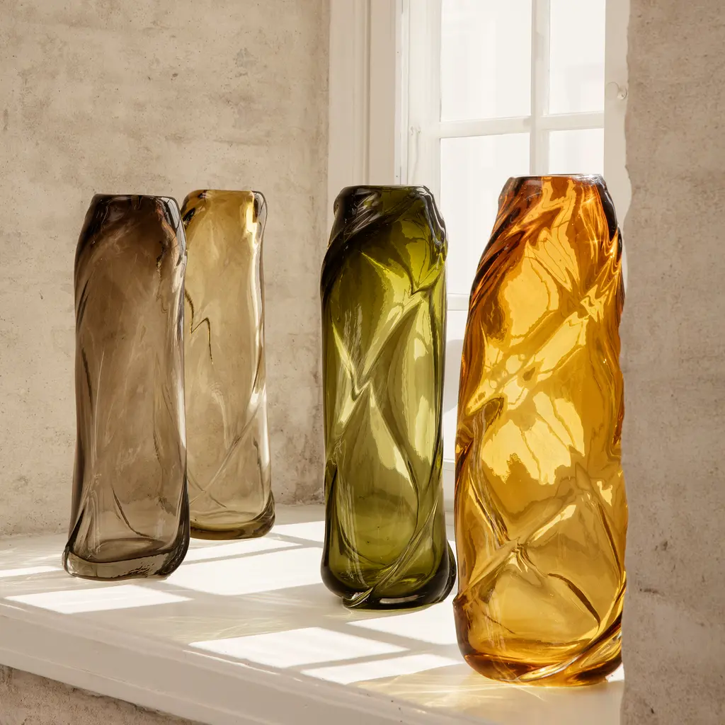 The Water Swirl Vase is a stunning and oversized piece that is expertly mouth-blown to resemble a cascading whirl of liquid. The use of translucent coloured glass gives the vase a light and effortless appearance, as if it’s dancing. Despite its solid and massive glass construction, the vase achieves a delicate and almost weightless feel. It’s perfect for displaying flowers or stalks, but also makes a statement on its own, especially when the sunlight filters through its transparent glass. Each vase is unique, with individual twists and curves that make it one-of-a-kind.