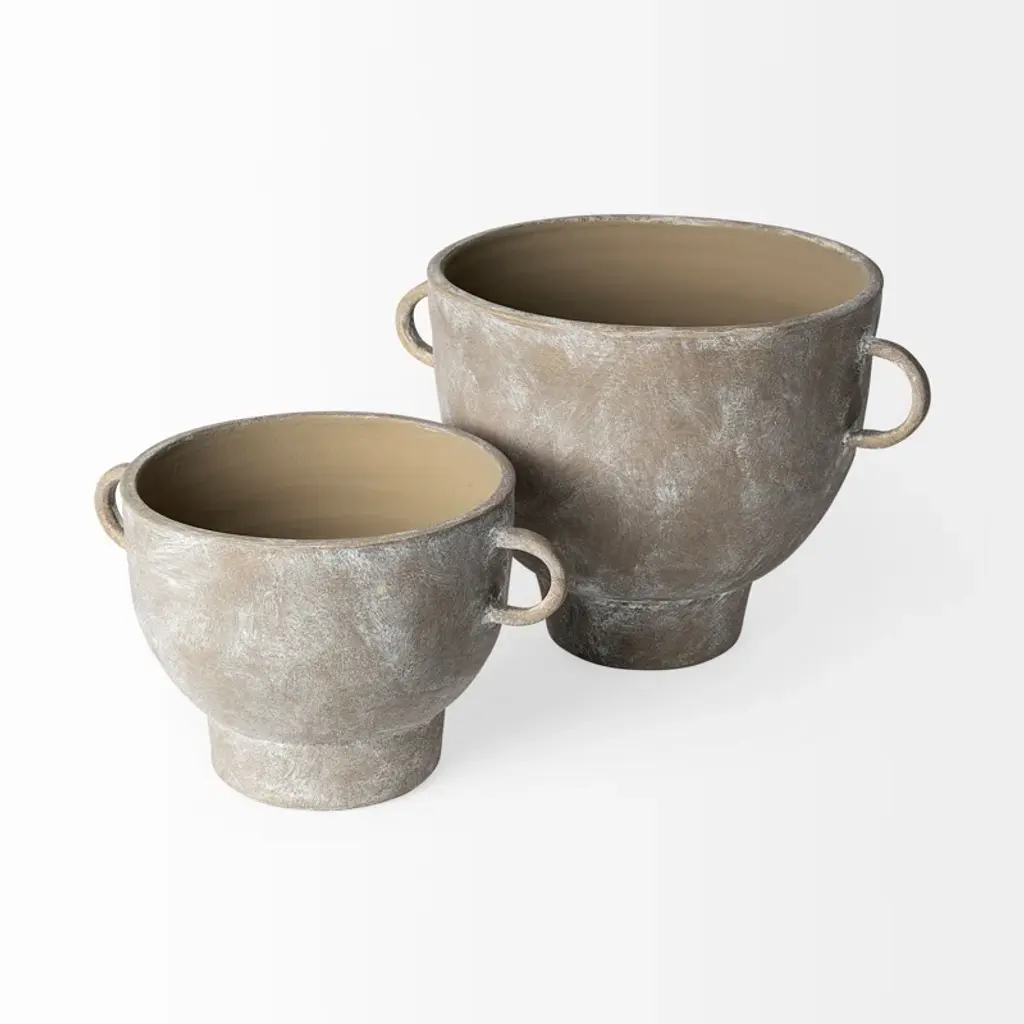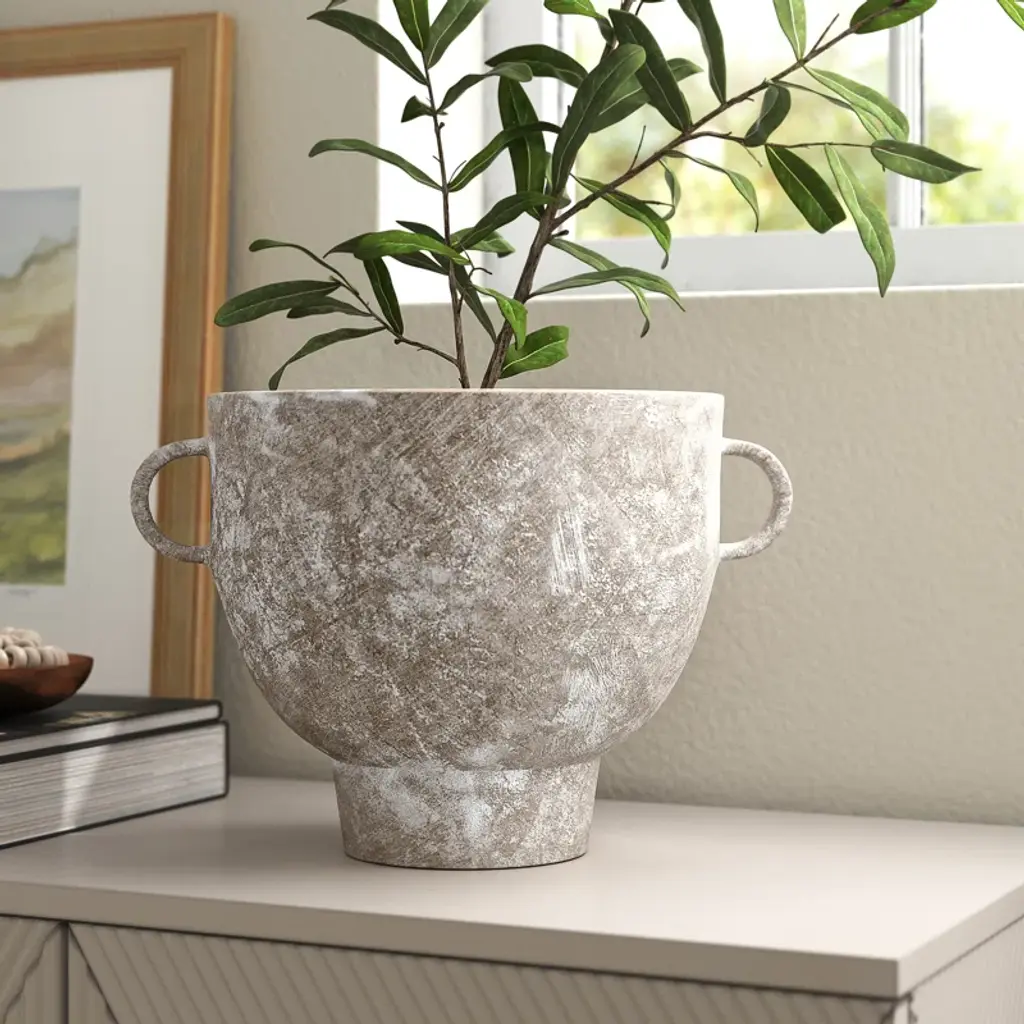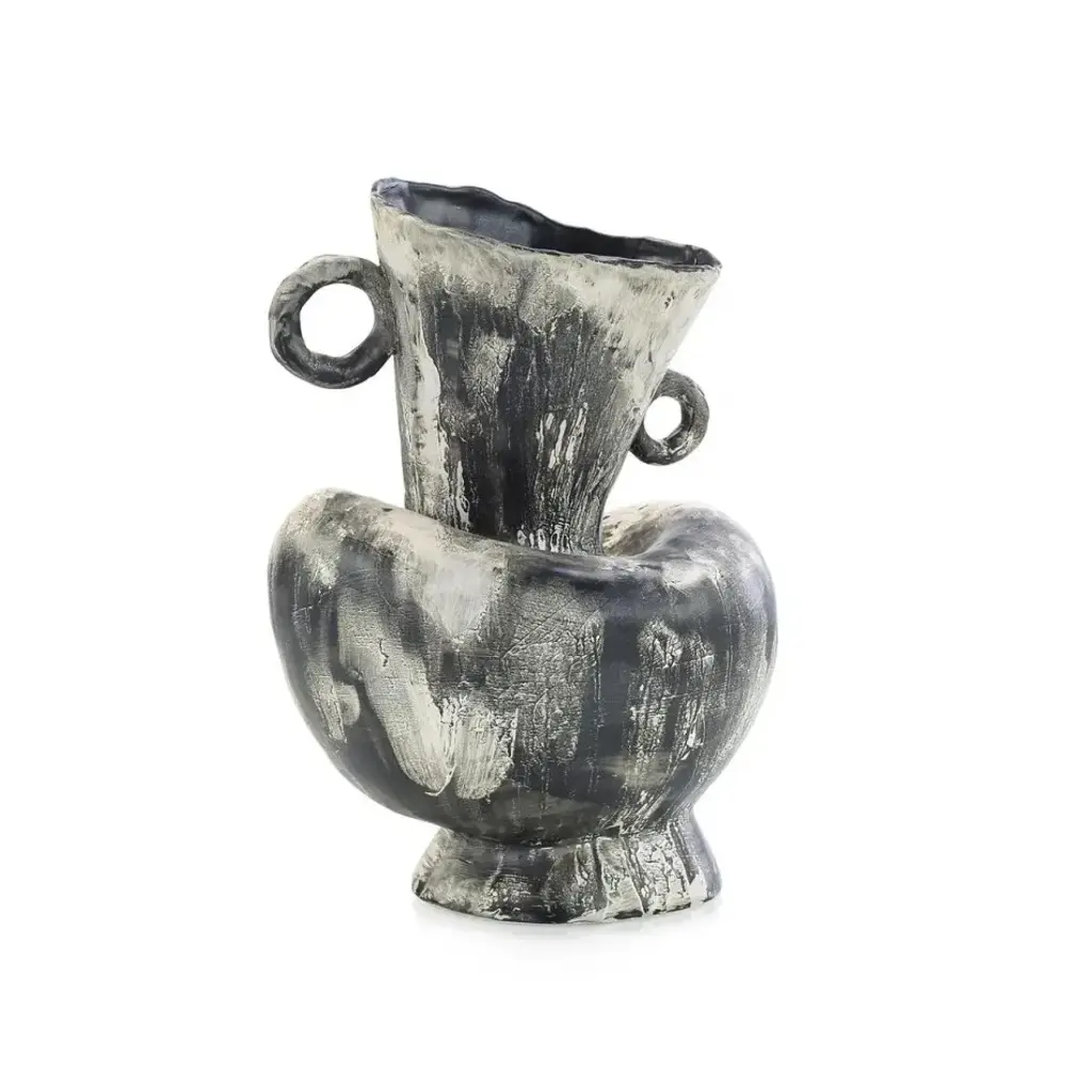 Handcrafted from ceramic and finished in a gray/beige tone, this is a stylish stout vase with two C-shaped handles that add to its visuals.