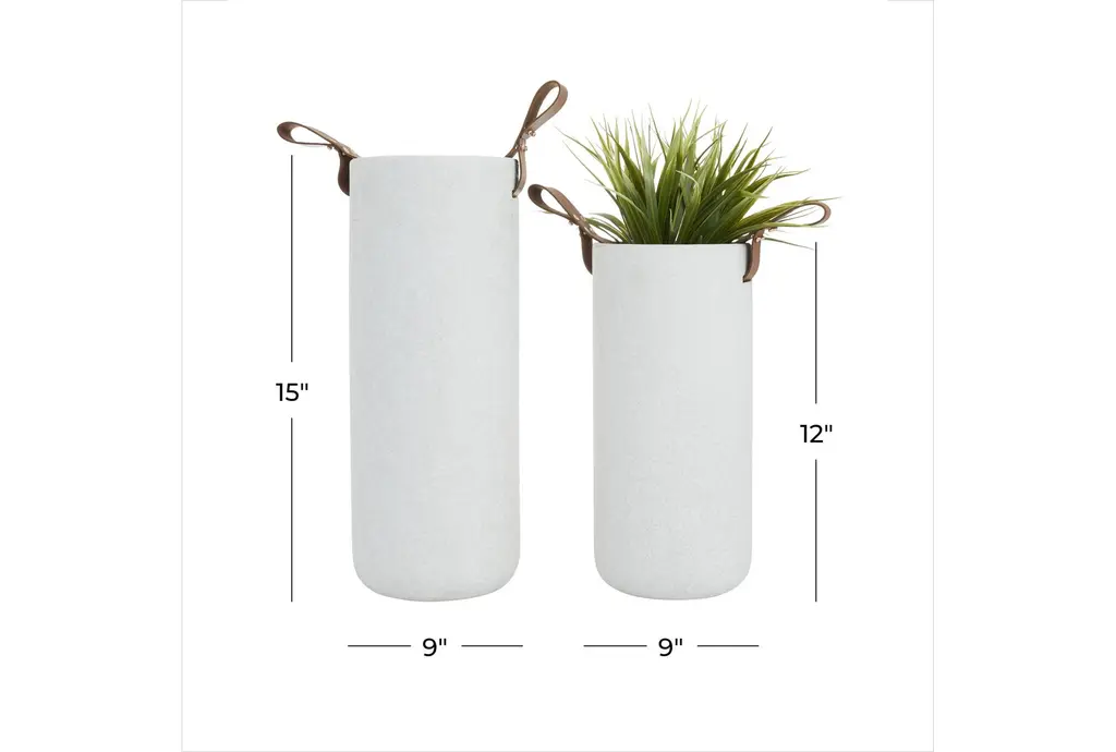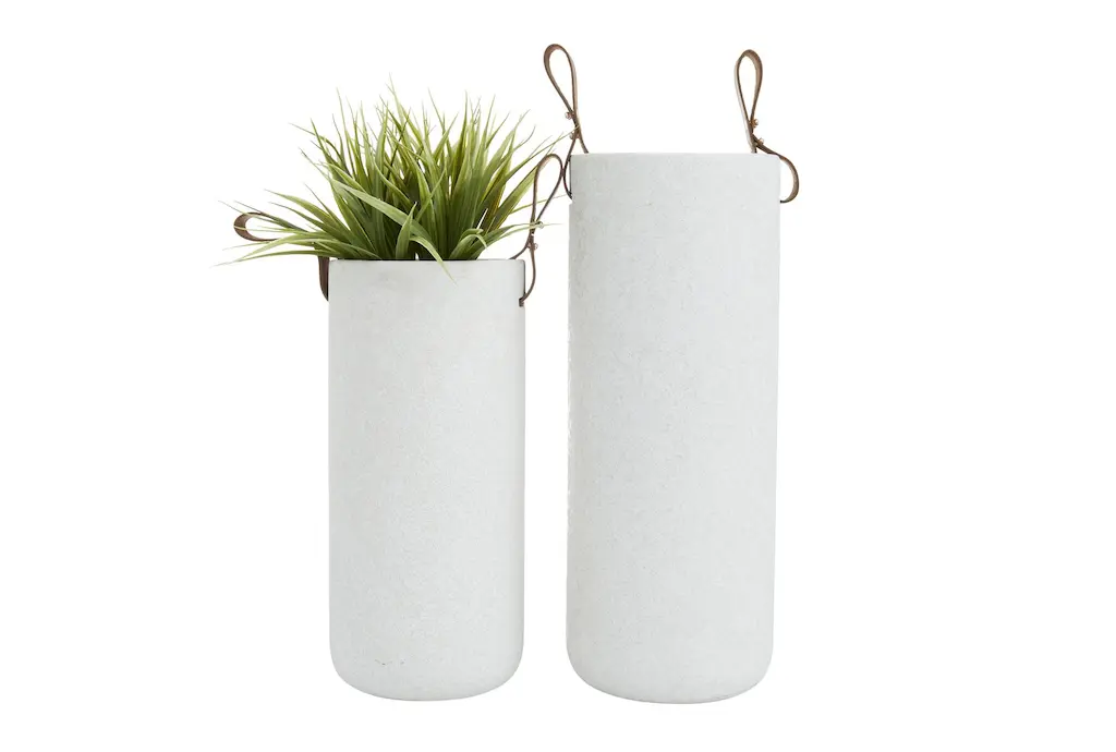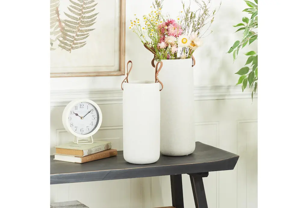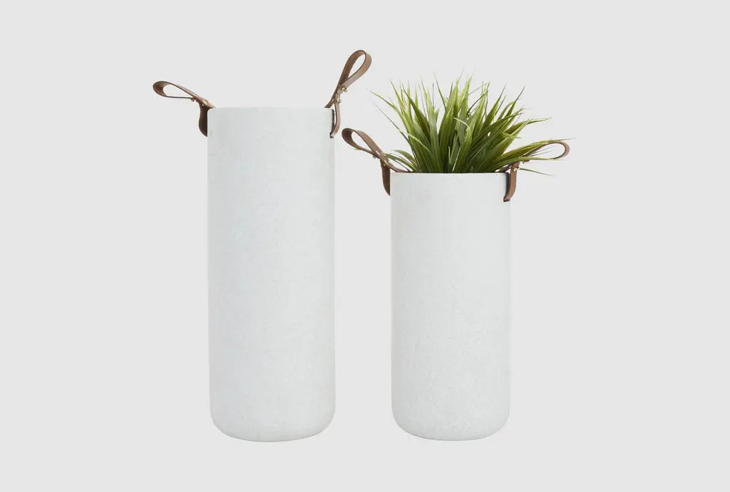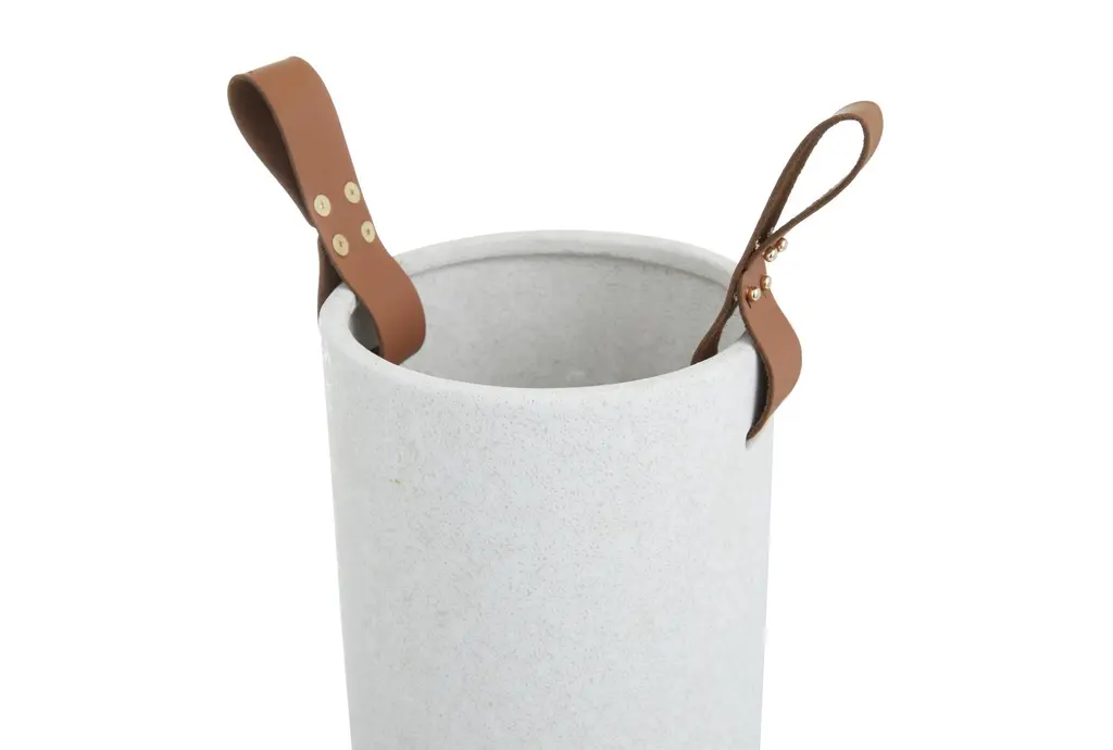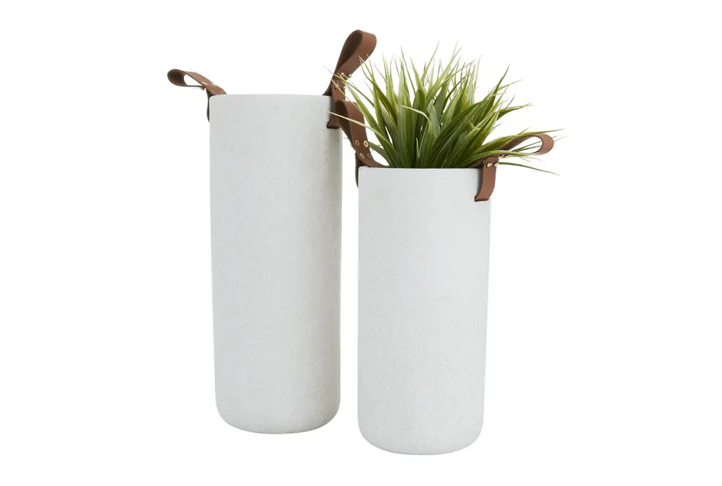 White Ceramic Stoneware + Leather Handle Vases Set Of 2
