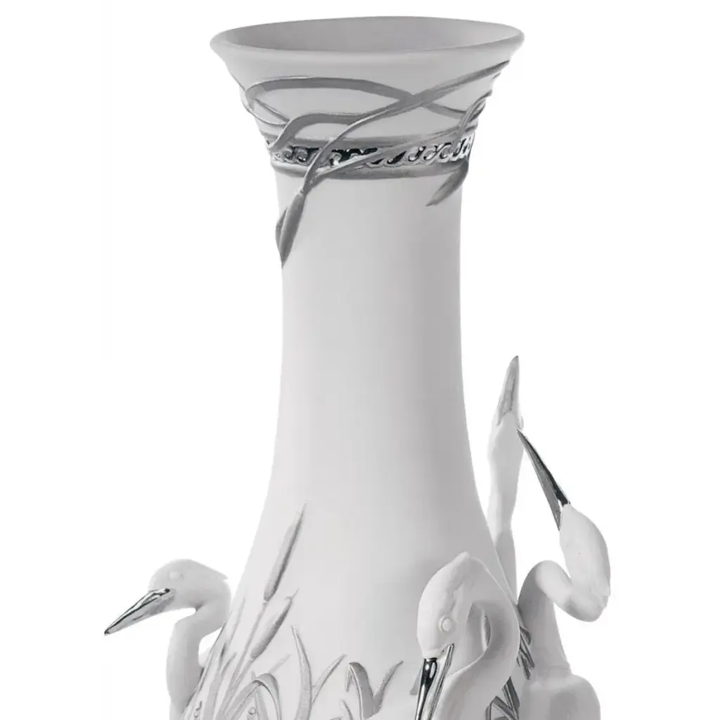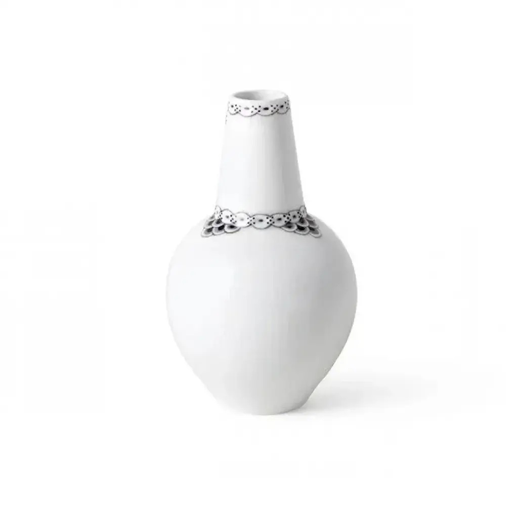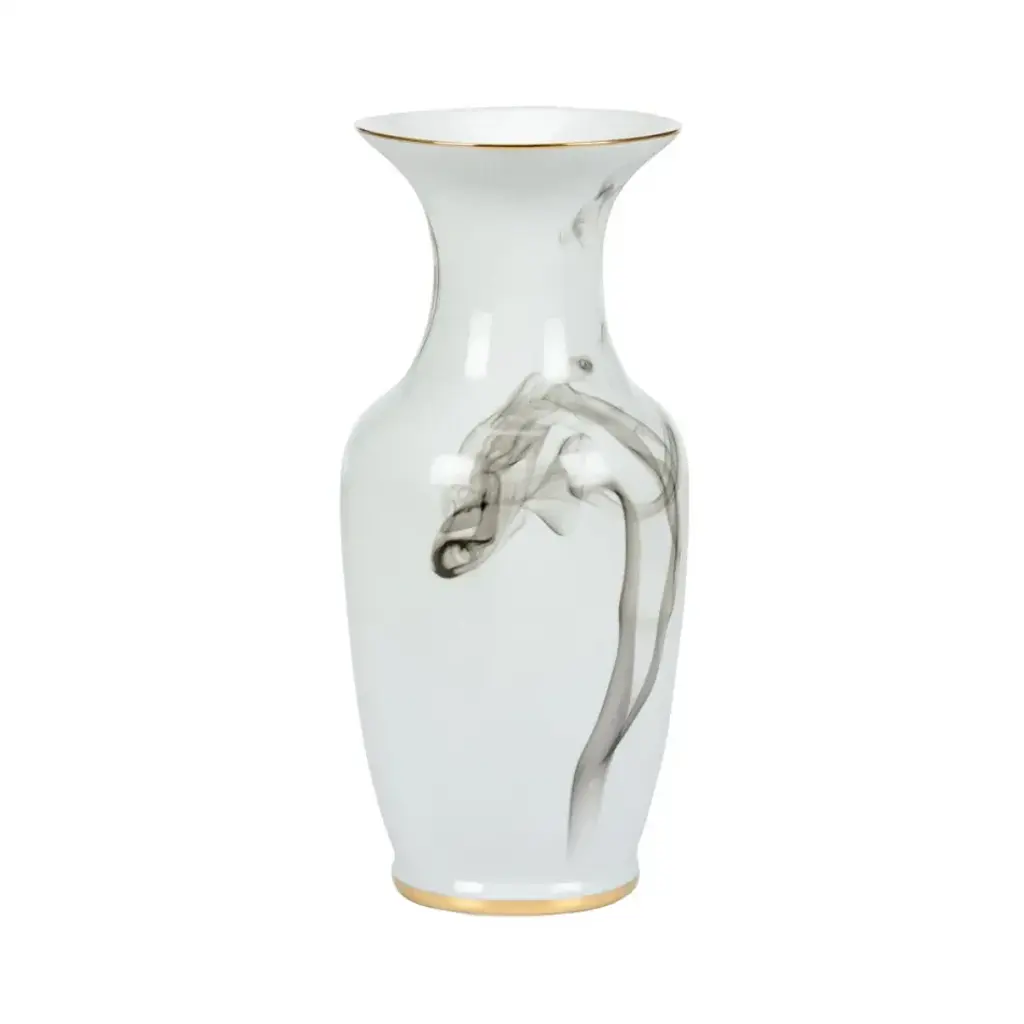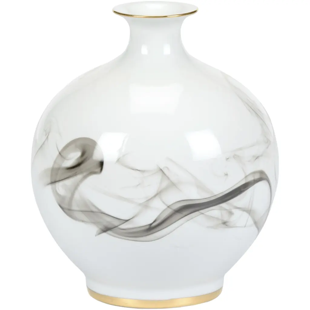 White cinder and smoke vase is crafted of white glazed porcelain with a hand painted black smoke design. Metallic gold trim adds an elegance to the accent piece. Add floral stems to create a stunning centerpiece on a center table.