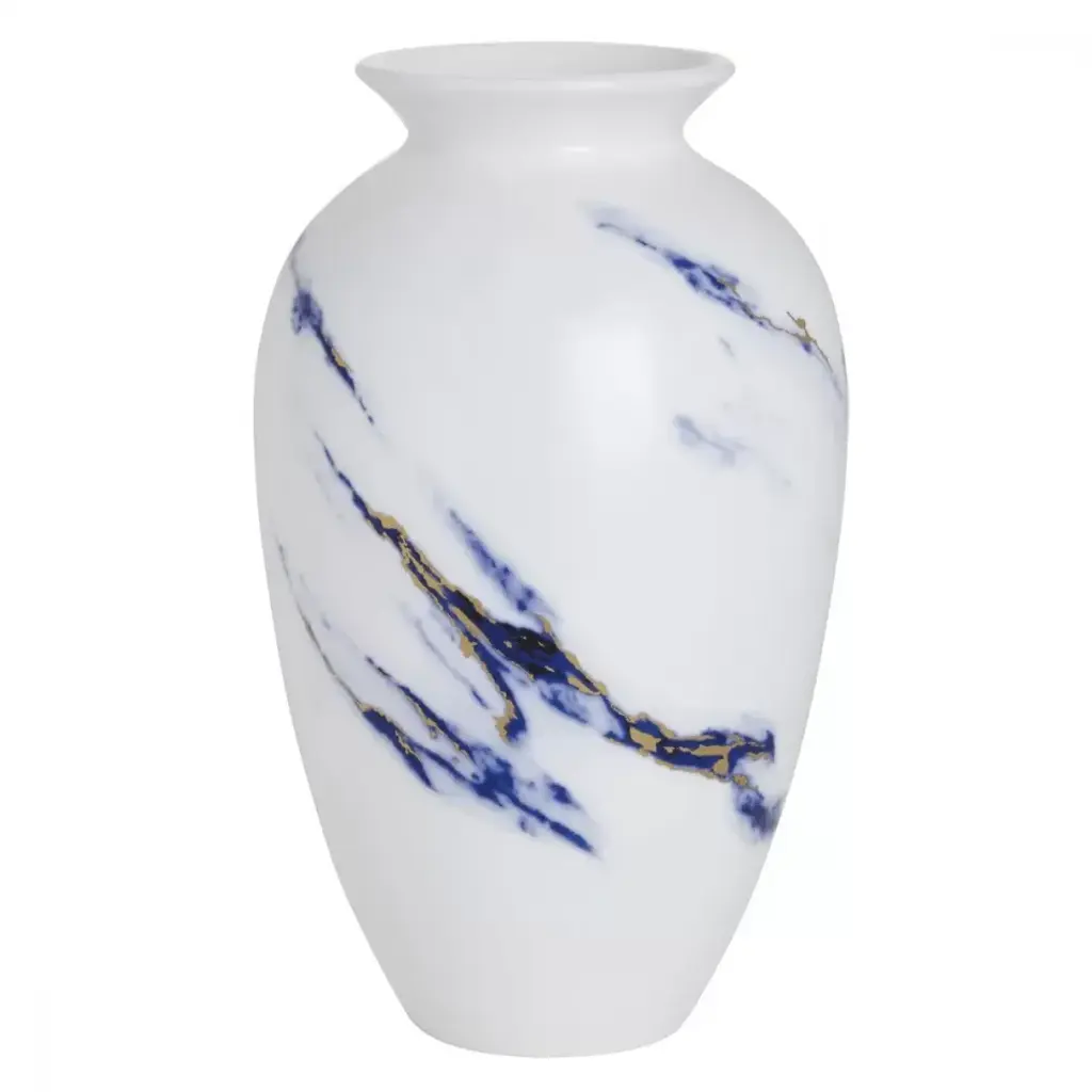 White cinder and smoke vase is crafted of white glazed porcelain with a hand painted black smoke design. Metallic gold trim adds an elegance to the accent piece ideal for tabletops in any home or office.