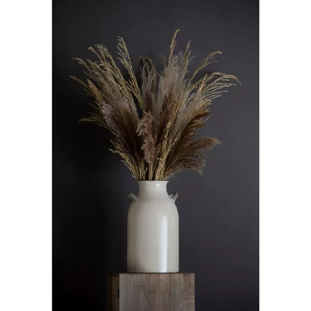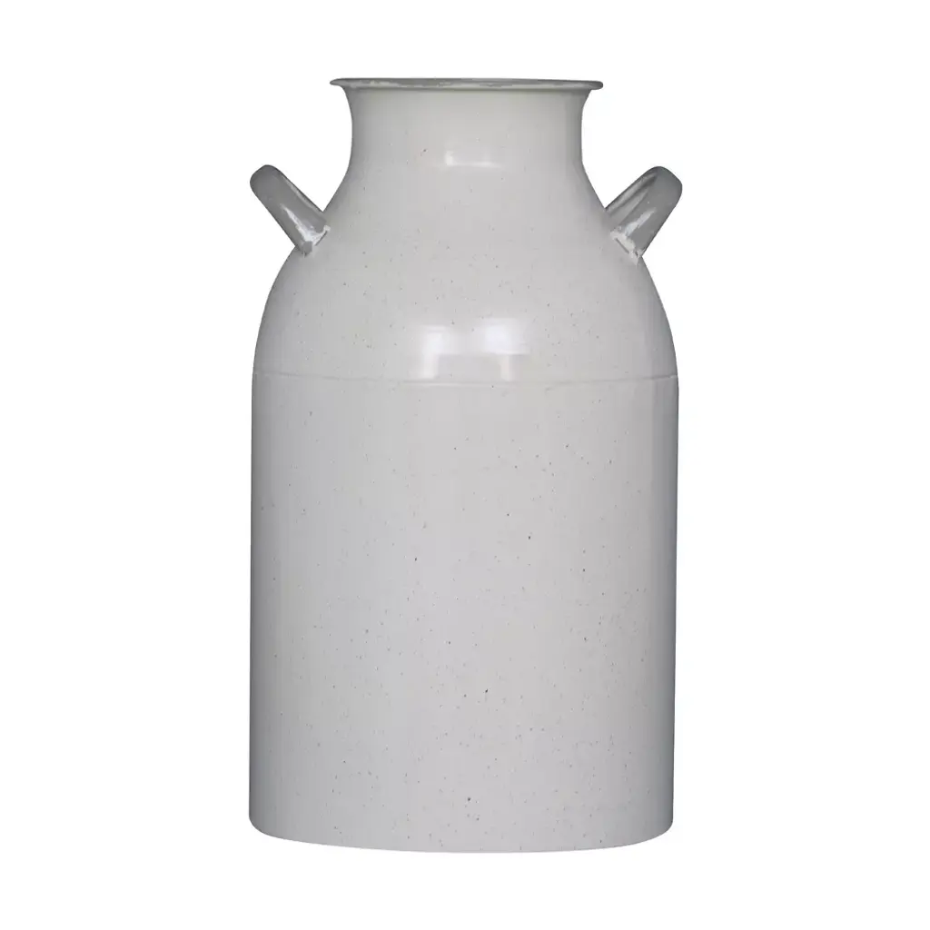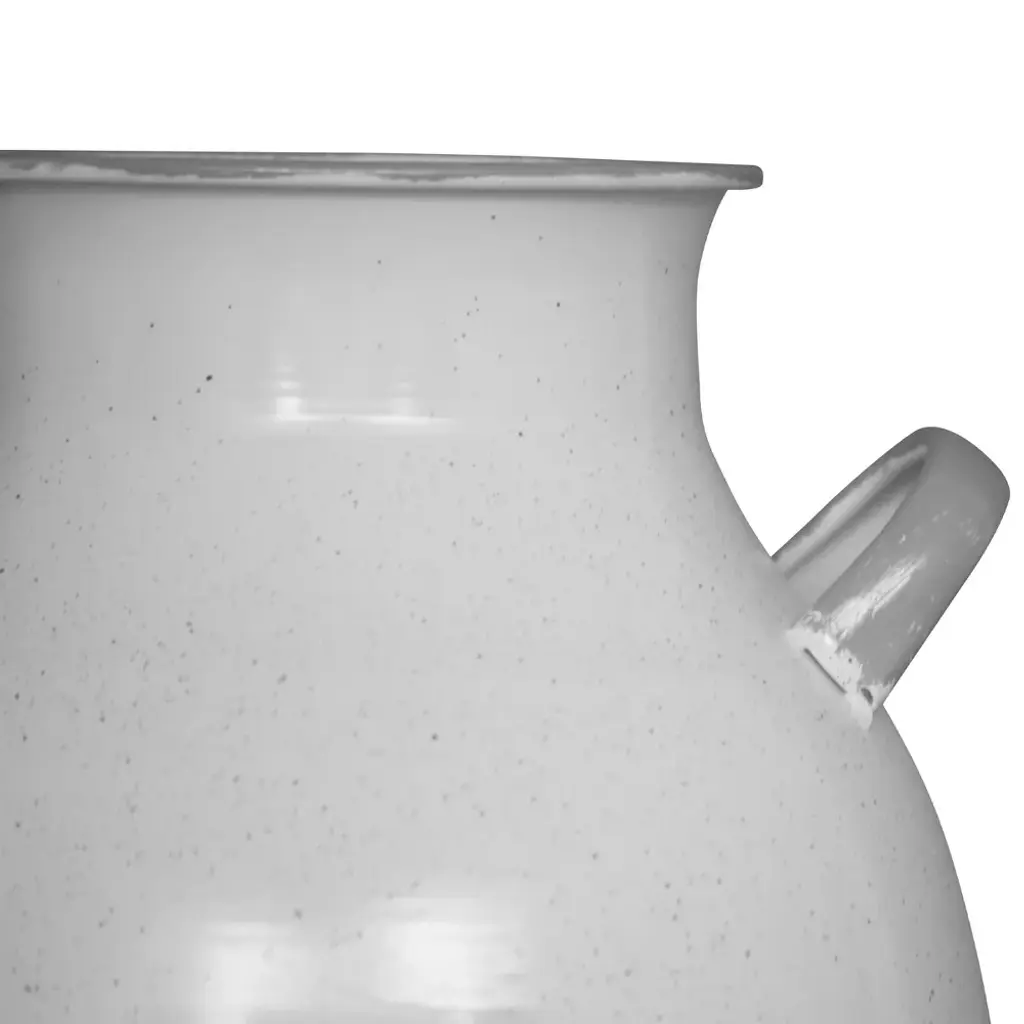 This traditional milk jug vase is finished in an off-white enamel with charcoal speckling and light gray accents. The neutral color makes it the perfect functional, yet stylish addition to a space. Make a statement on a tabletop or on the floor with large faux stems. Perfect for farm style decor with its classic milk jug style shape but trendy enough for a more modern space with its fresh enamel finish.