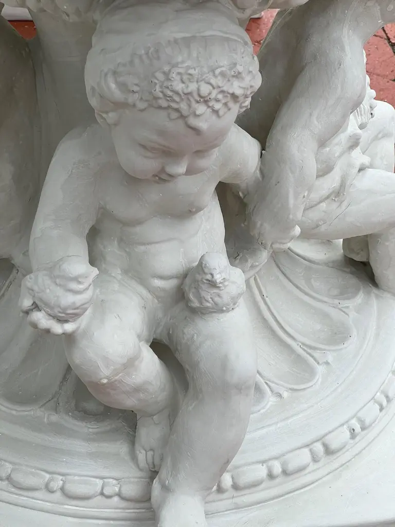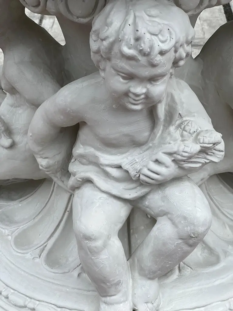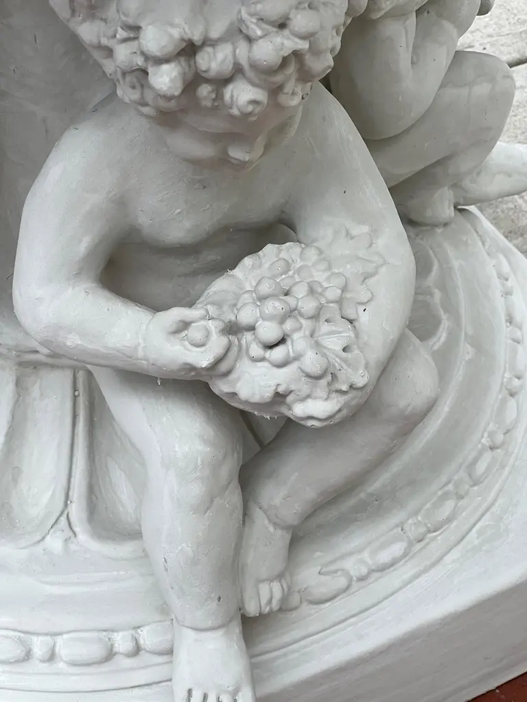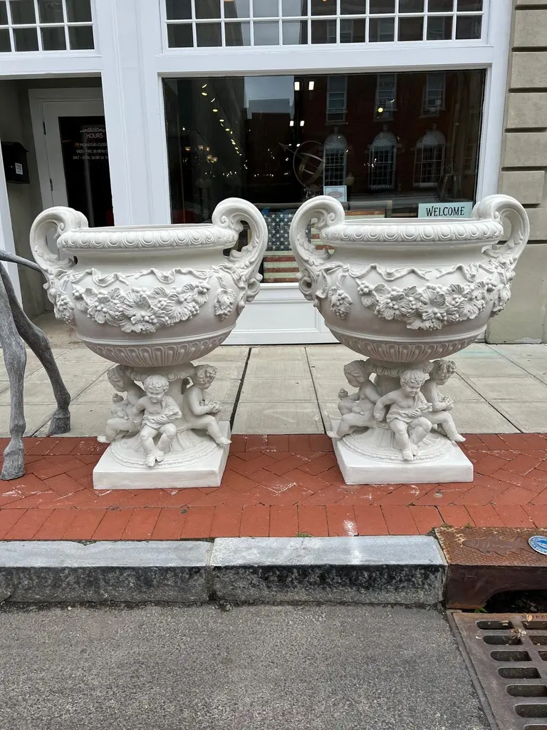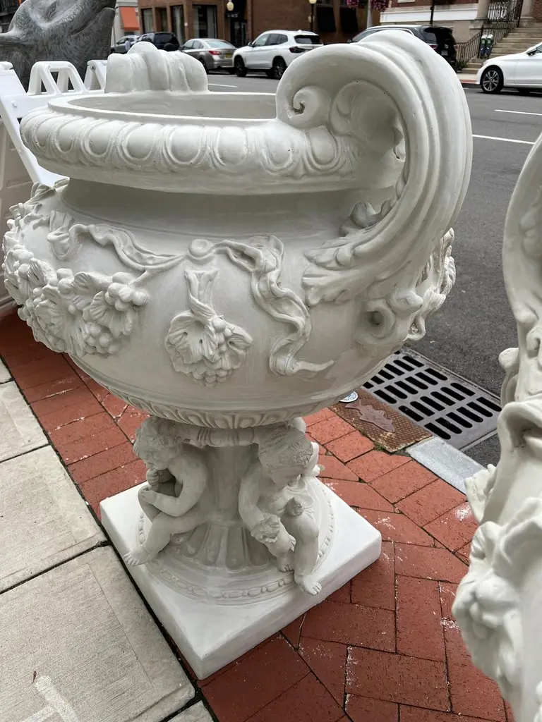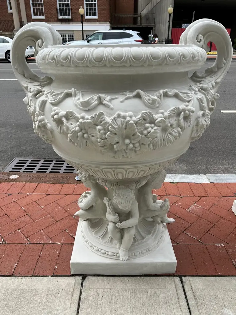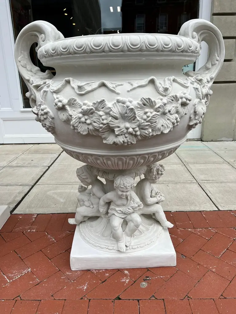 Amazing new reproduction fiberglass urn cast from a vintage glazed terracotta urn from Italy circa 1960s. Embossed with swags of vine leaves, acanthus, grapes with foliage and two monumental handles. Four cherubs sitting around the pedestal holding grapes, birds and possible grains. Made from a very sturdy and durable fiberglass this urn is made for the outdoors.The white color is added to the fiberglass and both are poured into the mold mixing the color into the fiberglass allows the color to age like a vintage urn. Perfect as a single urn in a garden or driveway circle or as a pair in front of an entrance or driveway. The opening for planting is 20" round and 20" deep this is a great urn.