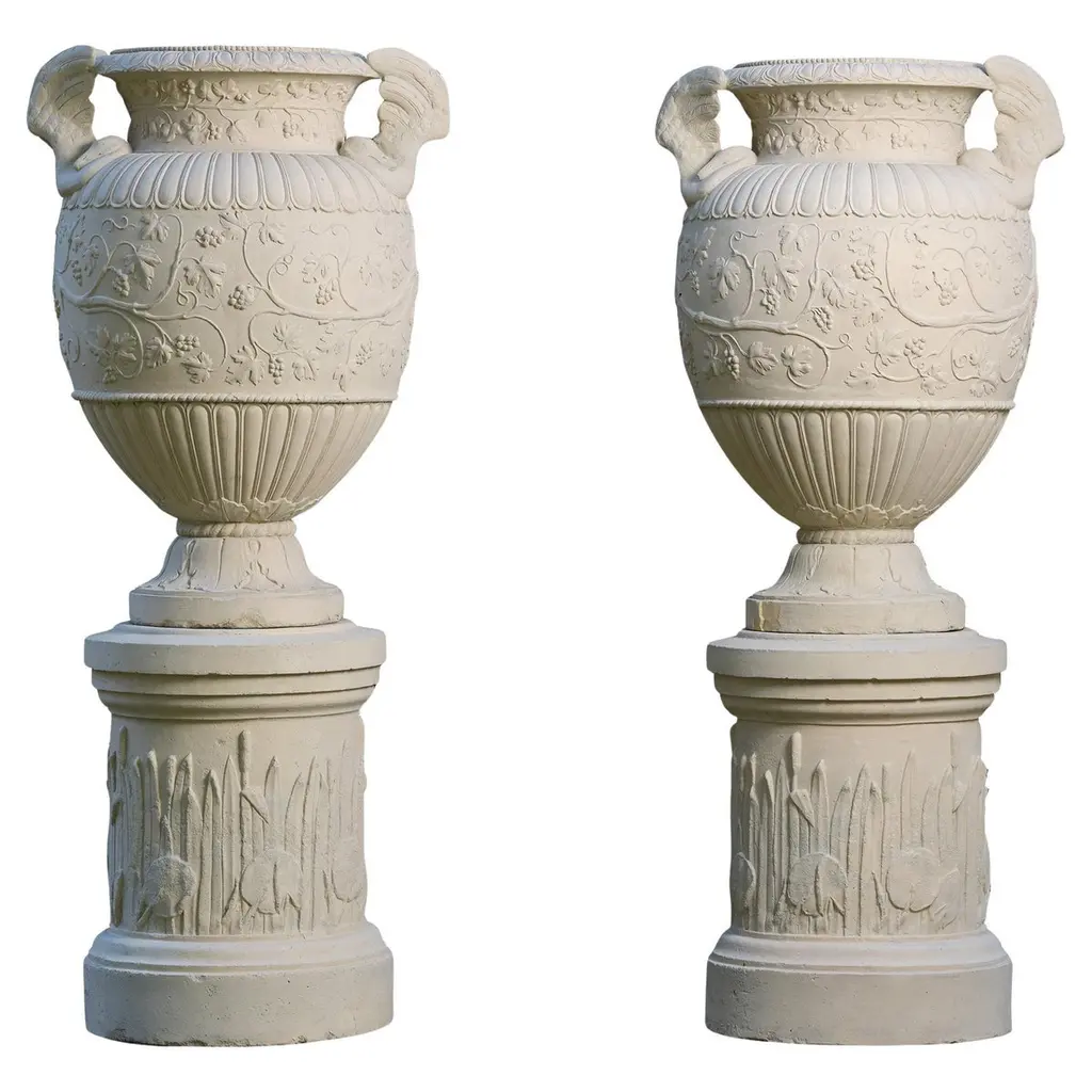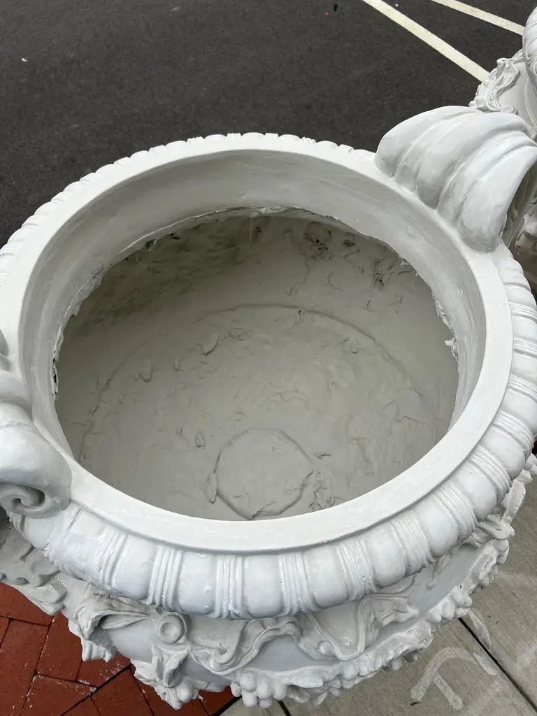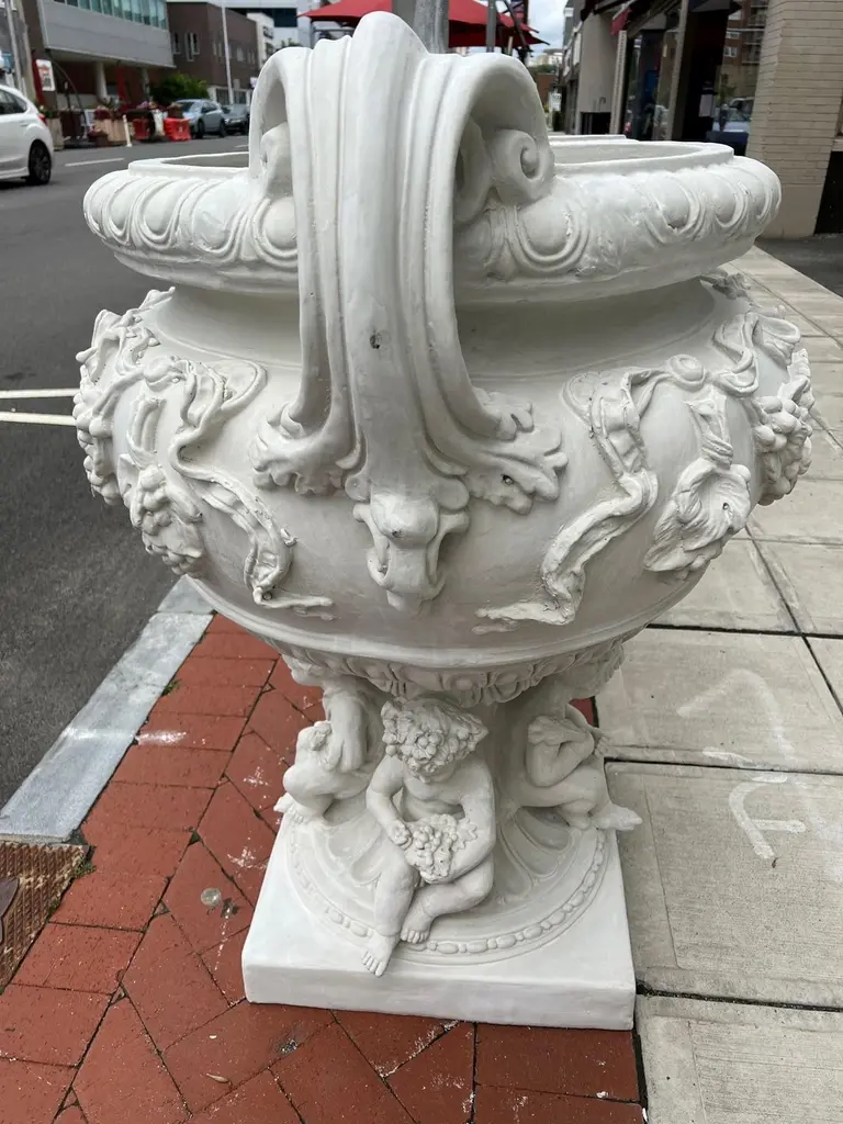 White Fiberglass Urn With Large Handles Grape Vines And Cherubs
