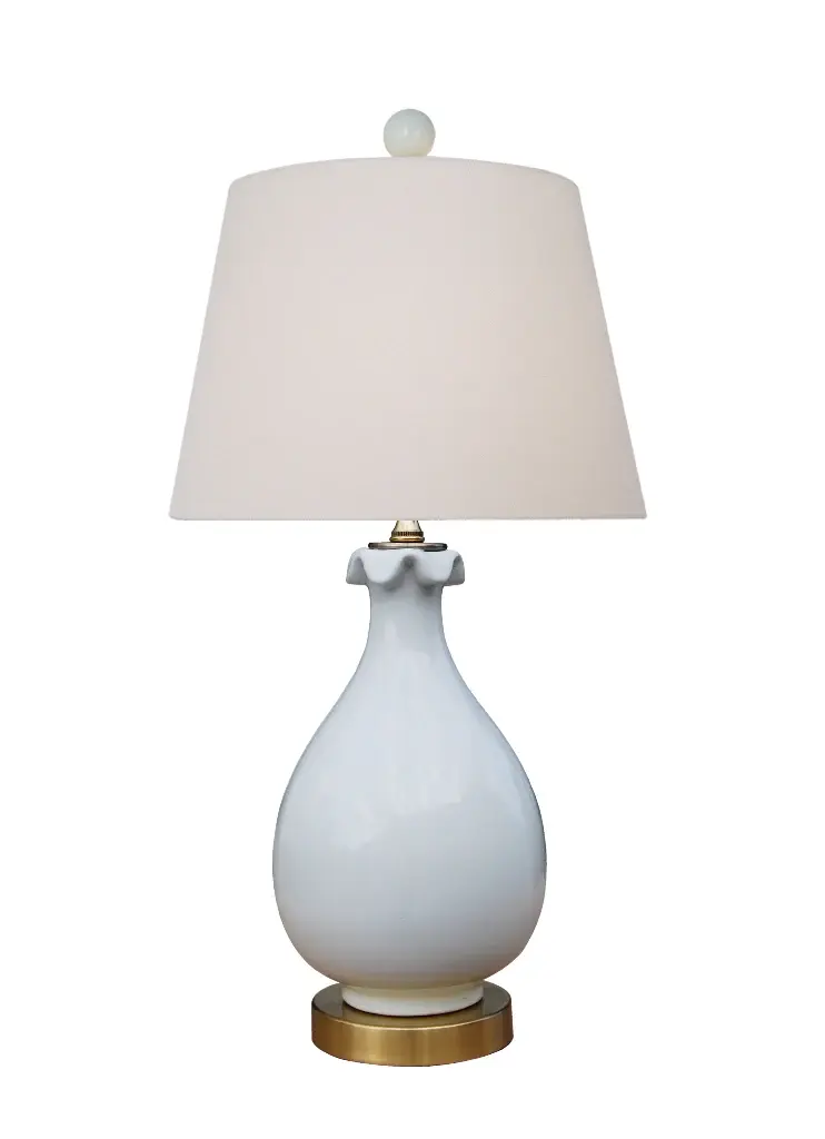 Clean and understated, this timeless porcelain lamp shines. With a solid brass base and a clean off white shade or pleated blue shade, this sophisticated lamp elevates any space.