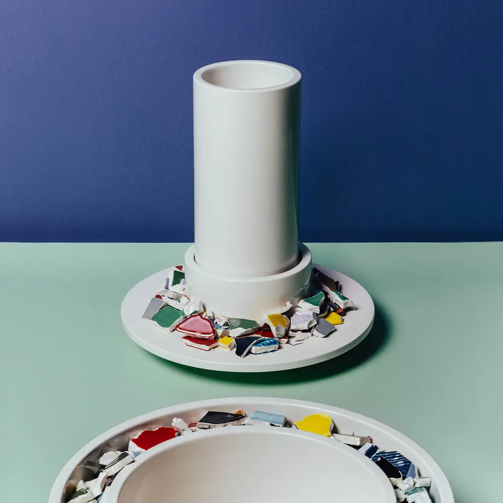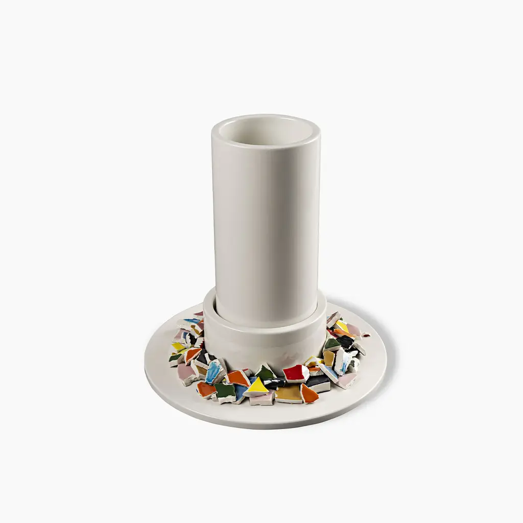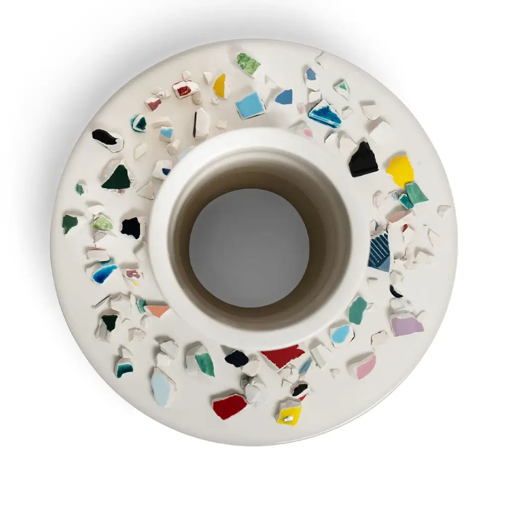 This piece hides a sustainable sensibility behind this artful ceramic vase Duccio Maria Gambi designed for Bitossi. A design that was exhibited at the 2023 Salone del Mobile furniture fair in Milan, it is characterized by the presence of polychrome ceramic fragments gathered on its disk base, where a cylindrical body for a dried flower arrangement is set.